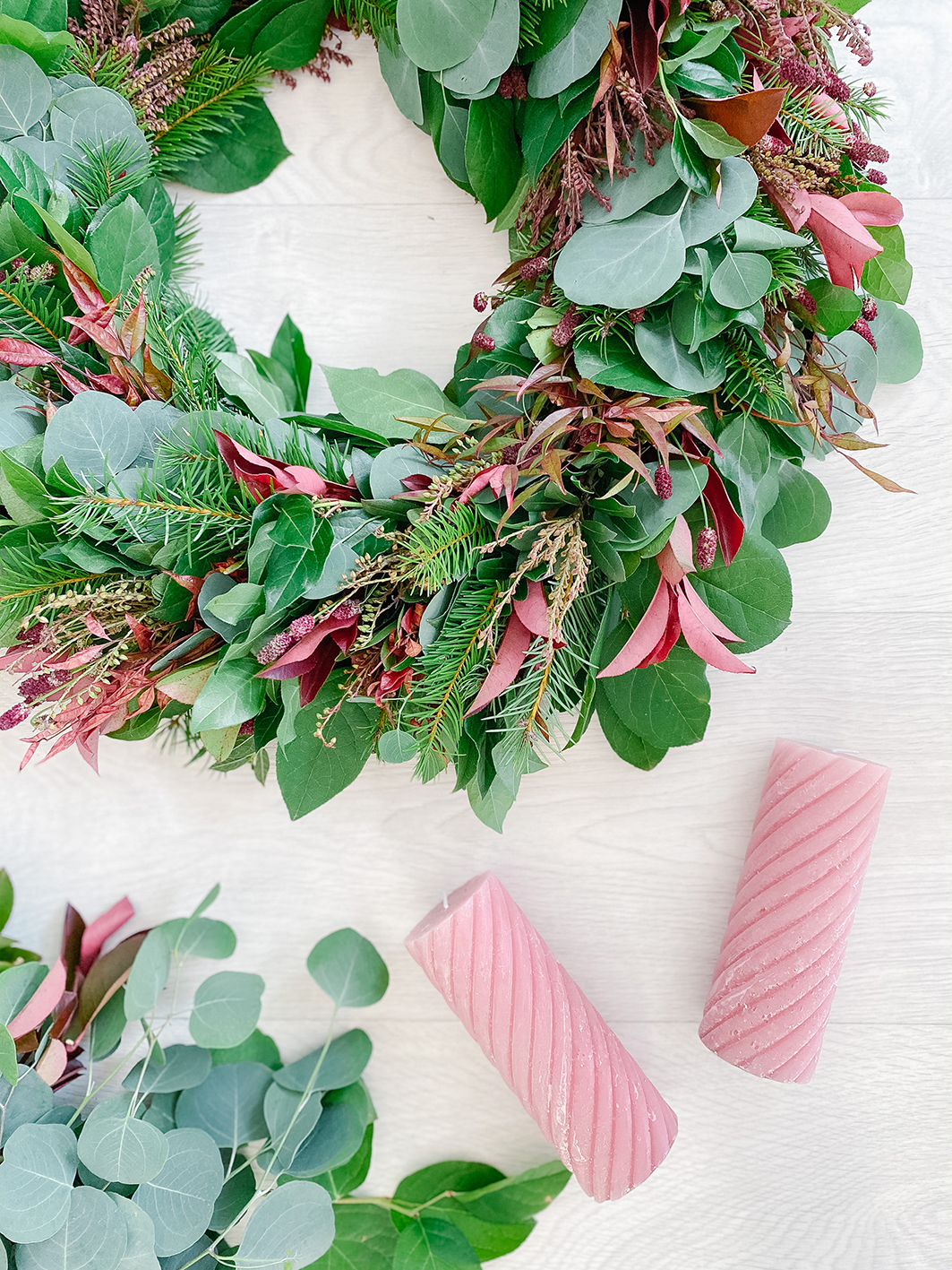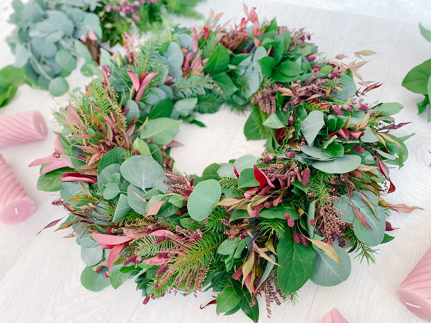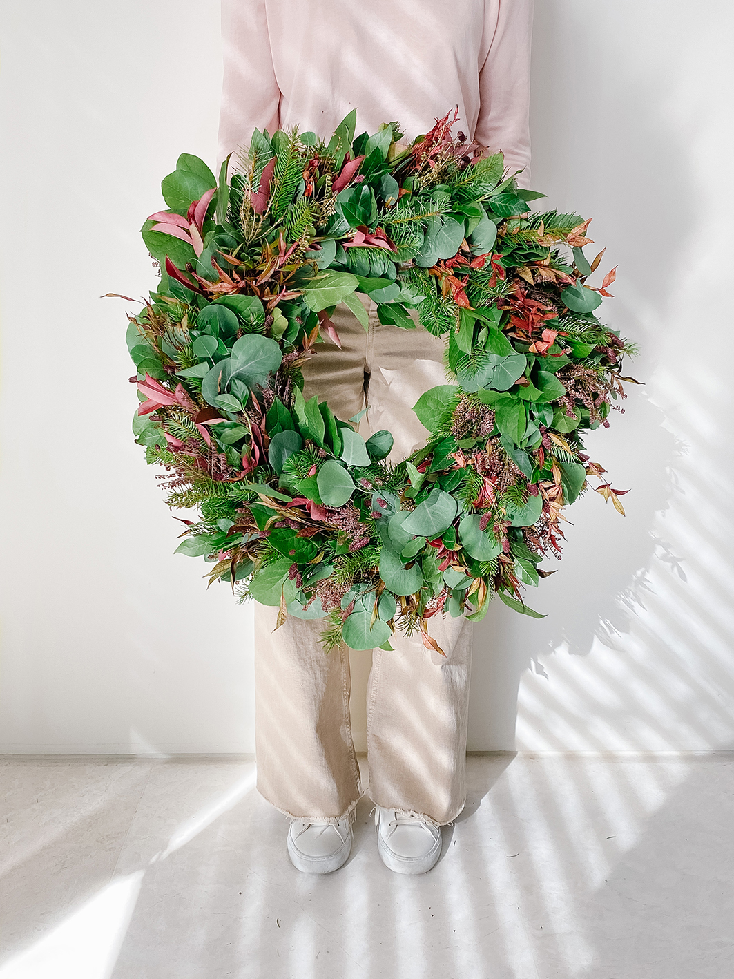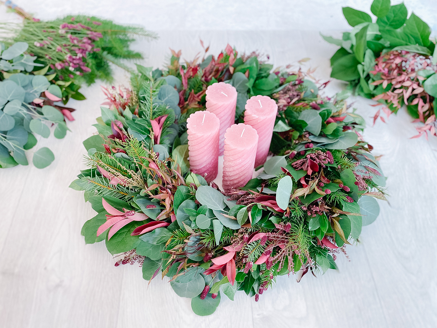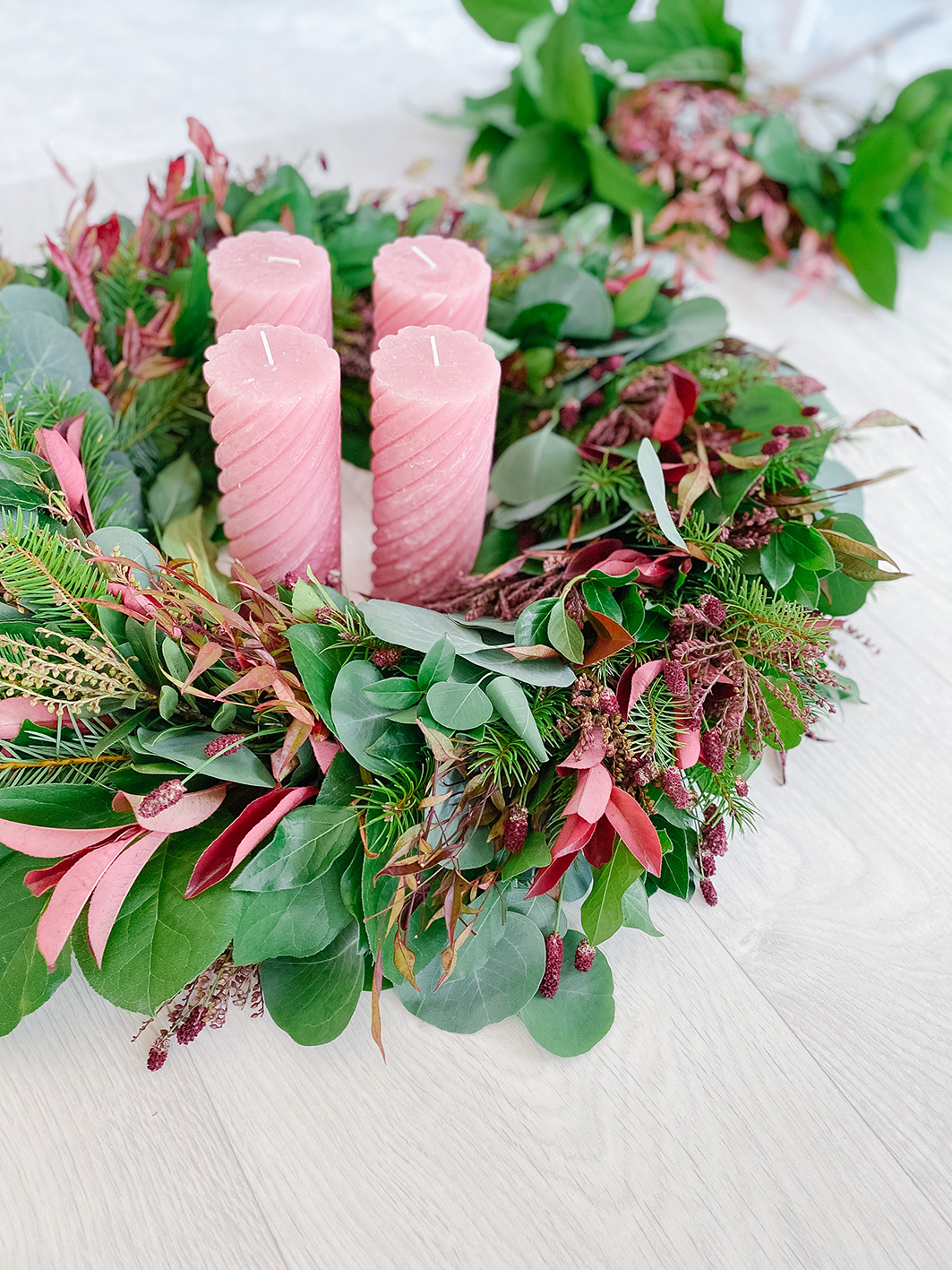 Dieses Jahr war ich richtig ratlos, was die Farben meines Adventskranzes betrifft. Eigentlich war der Gedanke Grün und Weiß, allerdings habe ich beim Blick auf den Blumenmarkt in Seoul festgestellt, dass es in Weiß nicht viel gab, das schön trocknen wurde. Daher bin ich dann letztendlich auf einen Adventskranz in Grün und Weinrot umgeschwänkt. Etwas untypisch für mich, da ich gar kein so großer Fan von Rot bin, aber ich muss sagen, ich bin mit dem Ergebnis super zufrieden. Definitiv anders, als der Adventskranz von 2020 mit Hortensien und 2021 mit Eukalyptus. Was meint ihr?
