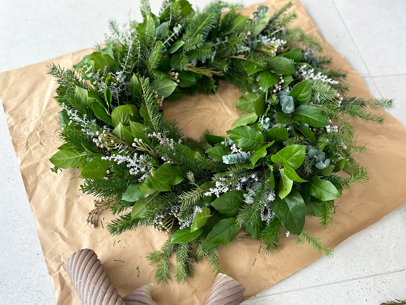 Das Ende ist meist etwas schwierig, da die Enden der Zweig unter den bereits angebrachten Zweigen versteckt werden müssen. Allerdings könnt ihr zur Not auch eine Heißklebepistole zur Hilfe nehmen und so die Lücken füllen, bzw. das Ende verstecken. Oder einfach eine große Schleife darüber binden. Schleifen sind ja aktuell im Trend.