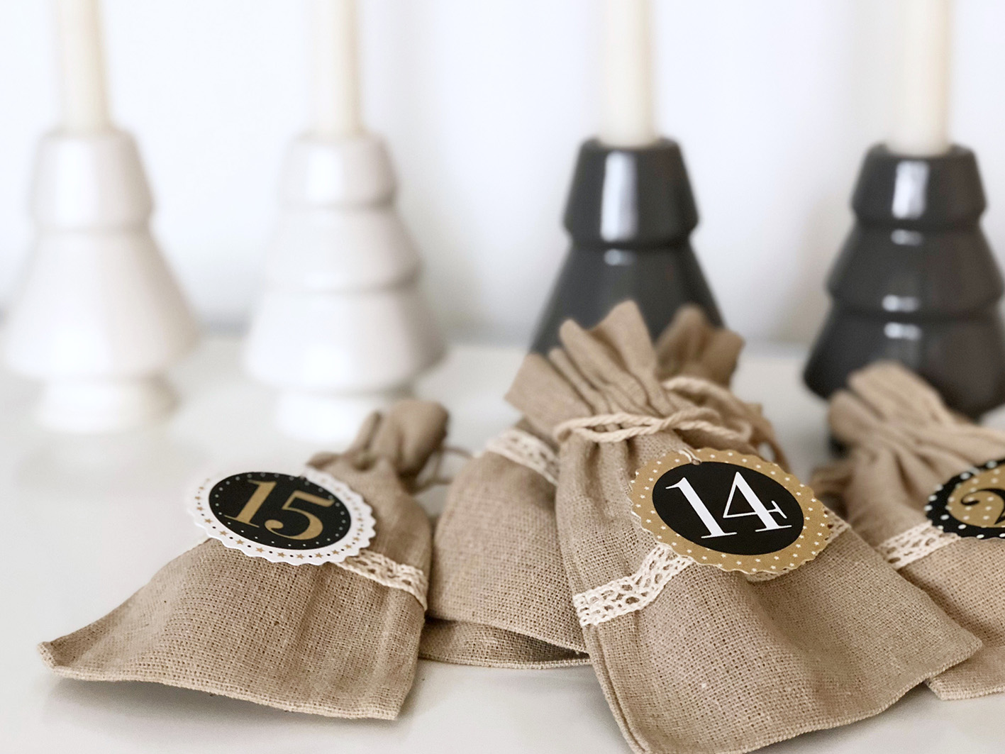 I found my decoration hanger at Ernstings Family but they seem to be sold out. But you can find similar ones here. The jute bags with the beautiful ribbon I found on Ebay here and the number tags for the Advent calendar here. You can find there also blank tags which you can write the numbers on yourself.