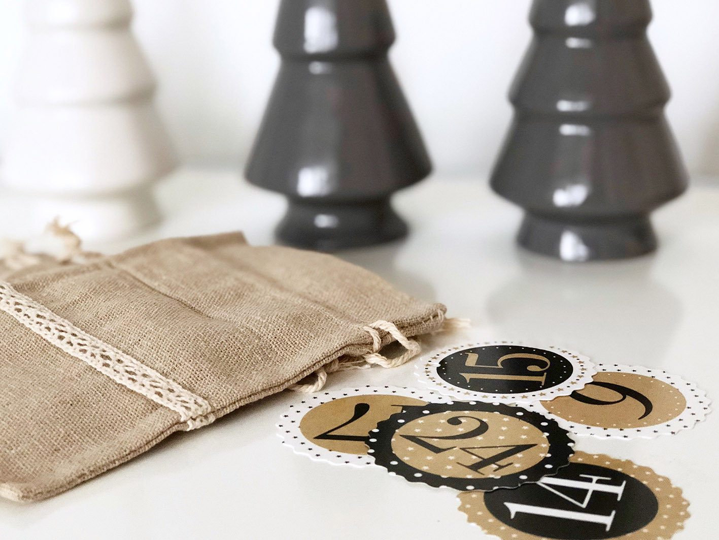 Ich habe meinen Dekorhänger bei Ernstings Family gefunden, aber der scheint mittlerweile online ausverkauft zu sein. Man findet aber ganz ähnliche zB hier oder in fast allen Baumärkten. Die Jutesäcke mit dem schönen Spitzen-Band fand ich hier auf Ebay und die Zahlenanhänger für den Adventskalender hier. Dort findet ihr übrigens auch Blankoanhänger, die ihr selbst beschriften könnt, wenn ihr euch im Hand Lettering versuchen wollt.