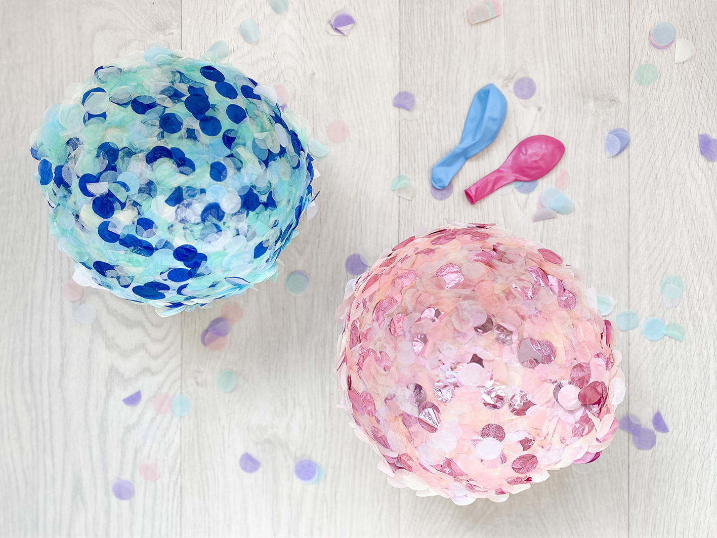 - Blast nun den Luftballon auf gewünschte Größe auf und pinselt ihn bis etwa zur Hälfte mit dem Kleister ein. Darauf gebt ihr eine dicke Schicht Konfetti, gebt die nächste Schicht Kleister darauf und wiederholt die Schritte. Sobald ihr die gewünschte Dicke erreicht habt, stellt ihr den Ballon zum Trocknen kopfüber in einen Topf oder hängt sie auf.