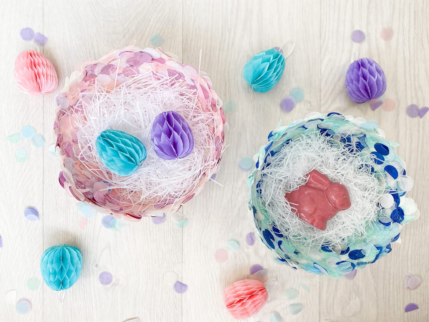 - Wenn das Konfetti Osternest getrocknet ist (es hat bei uns ca. 2 Tage gedauert), schneidet ihr den Ballon ein und lasst langsam die Luft aus und fertig ist euer DIY Osternest.