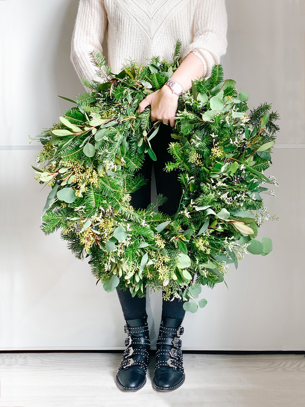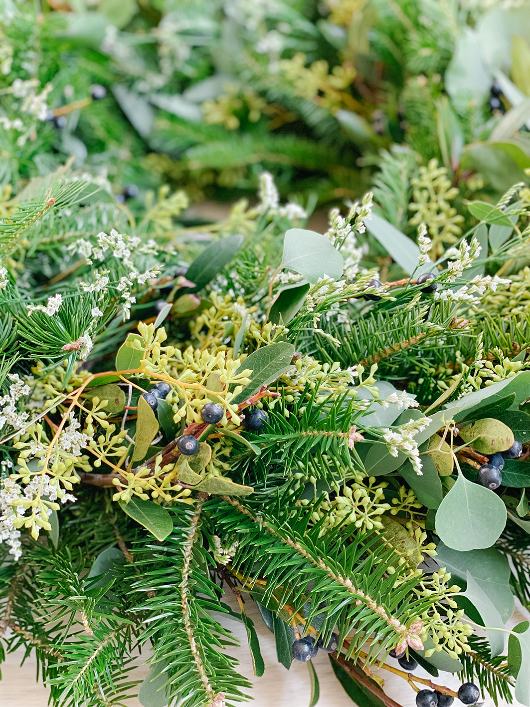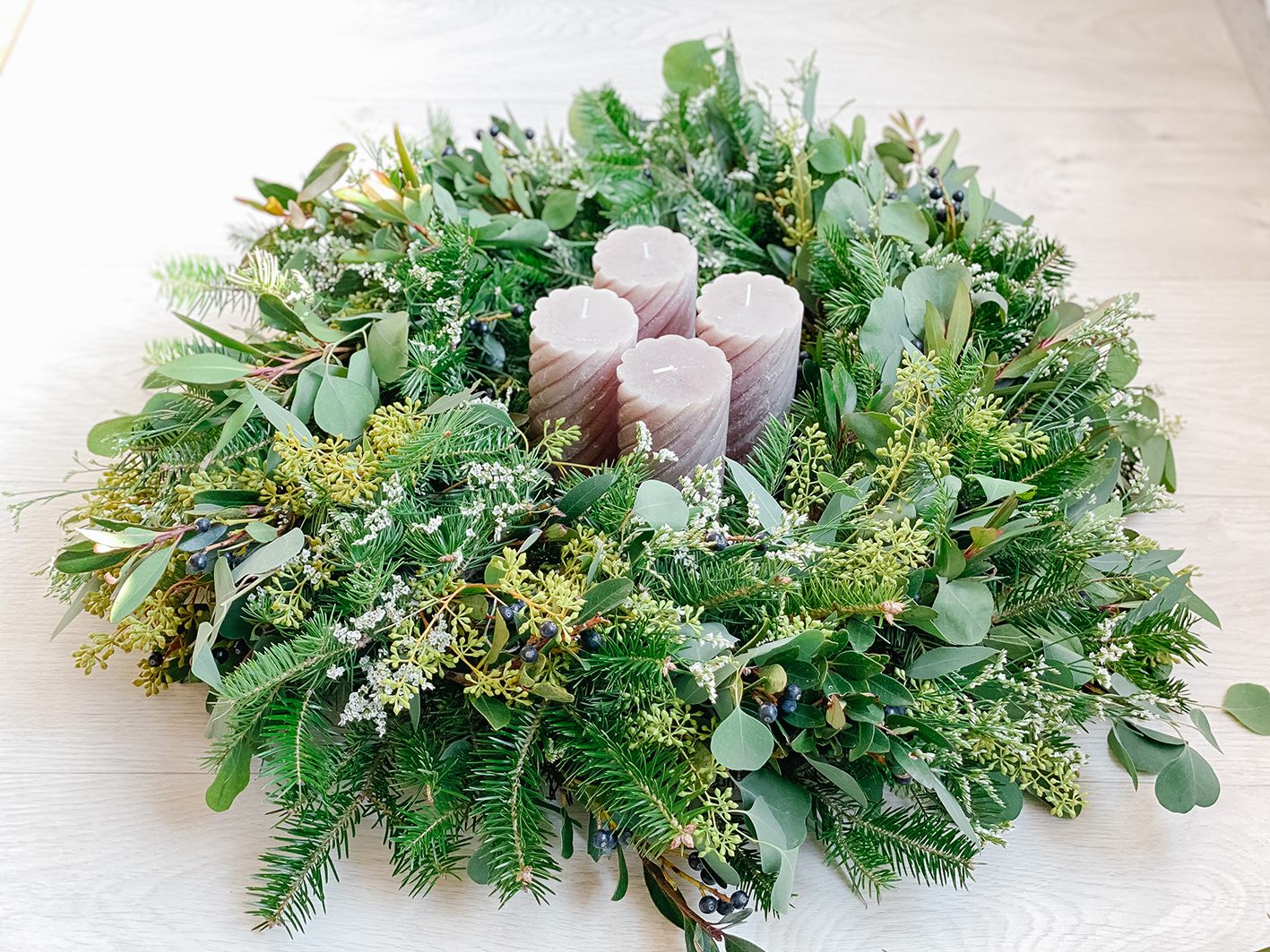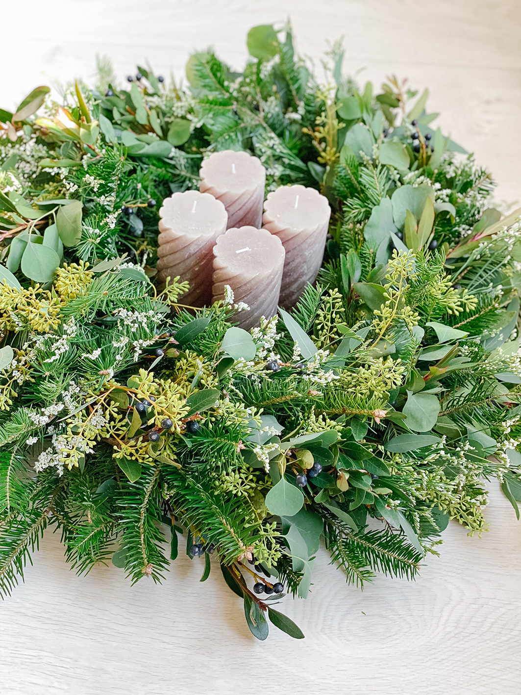 Wie oben schon erwähnt, gibt die Länge der Äste vor, ob der Adventskranz mehr oder weniger buschig wird. Je buschiger, desto größer wird der Kranz auch. Wenn ihr übrigens Lücken habt oder Stellen, die nicht ganz stimmig zum Rest sind: Steckt einfach einzelne Äste in die Lücken oder befestigt sei mit etwas Heißkleber. Und natürlich verrate ich euch noch meine Zweige. In meinem Kranz findet ihr 2 verschieden Eucalyptus Arten. Einmal den Eukalyptus populnea und den blauen Eukalyptus (Ecalyptus globulus). Dazu einen echten Lorbeer mit Lorbeeren, eine gewöhnliche Douglasie und die hübschen weißen Limonium.