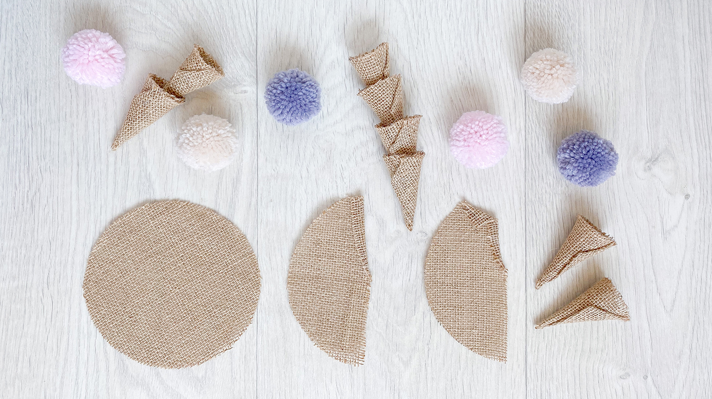 Falls ihr nur einen dünnen Jute-Stoff habt, könnt ihr den Stoff auch einfach doppelt nehmen. Somit hat die Eiswaffel dann mehr Stand. Übrigens, je öfter ihr die Wolle für die Pompons wickelt, desto fluffiger und schöner werden sie. Und wer keinen Heißkleber zu Hand hat, kann auch jeden anderen handelsüblichen Bastelkleber nehmen, der sollte allerdings am besten transparent trocknen. Sonst entstehen euch unschöne Flecken, wenn sich der Kleber durch die Struktur des Stoffes hindurch drückt.
