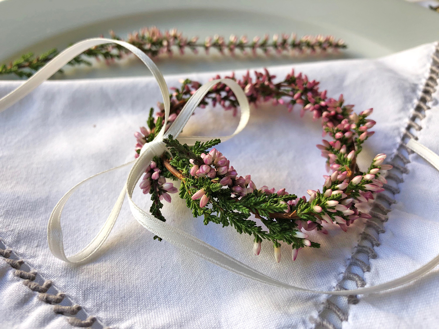 You can use it either on the plate and place it on fabric serviettes. Or put the little wreath over the neck of a pretty bottle or vase. If you don´t have any ribbon left, simply take a branch of the Erica and lay it next to the serviette. I might use this decoration for our New Year´s Eve dinner. I cannot wait for it.