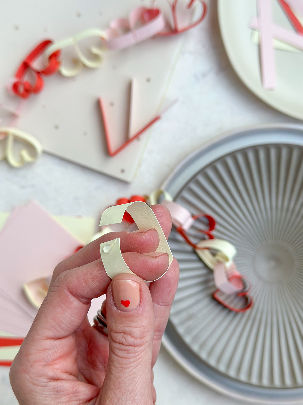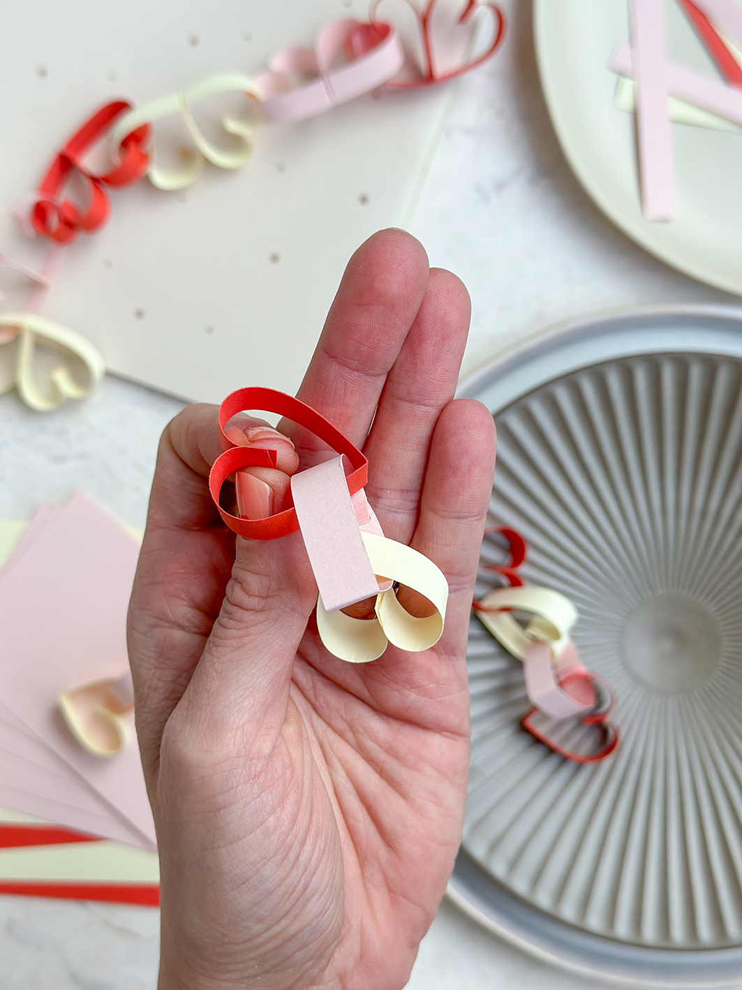 8. Genau so wiederholten mit dem roten Bastelkarton und so viele Herzen aneinander hängen, wie gewünscht.