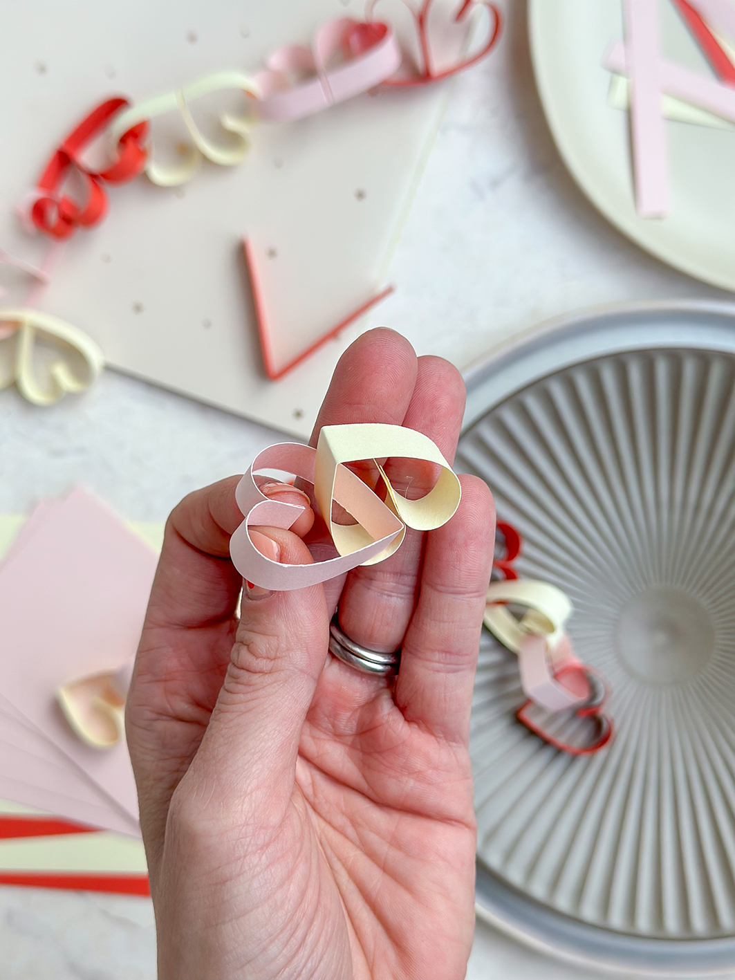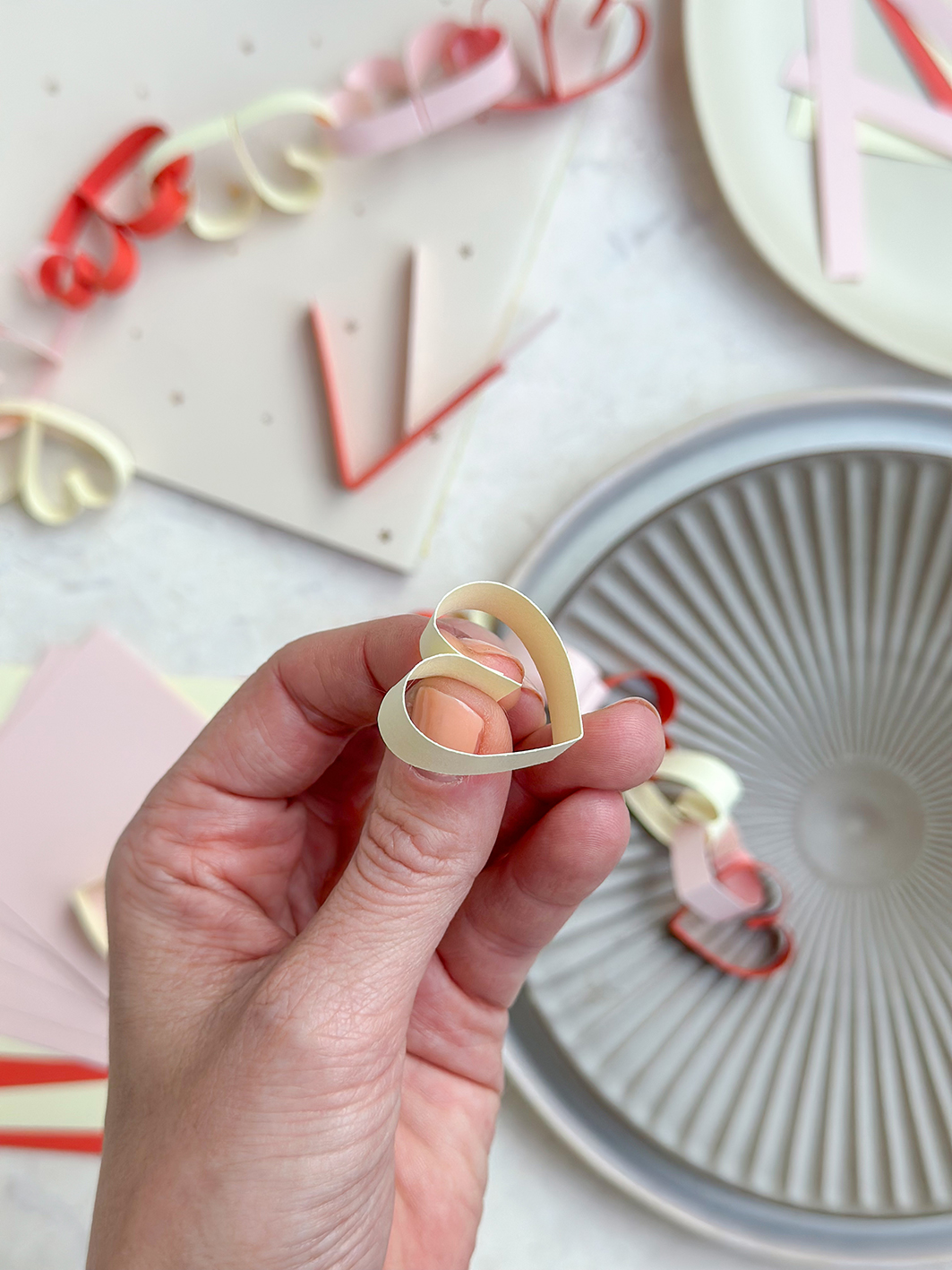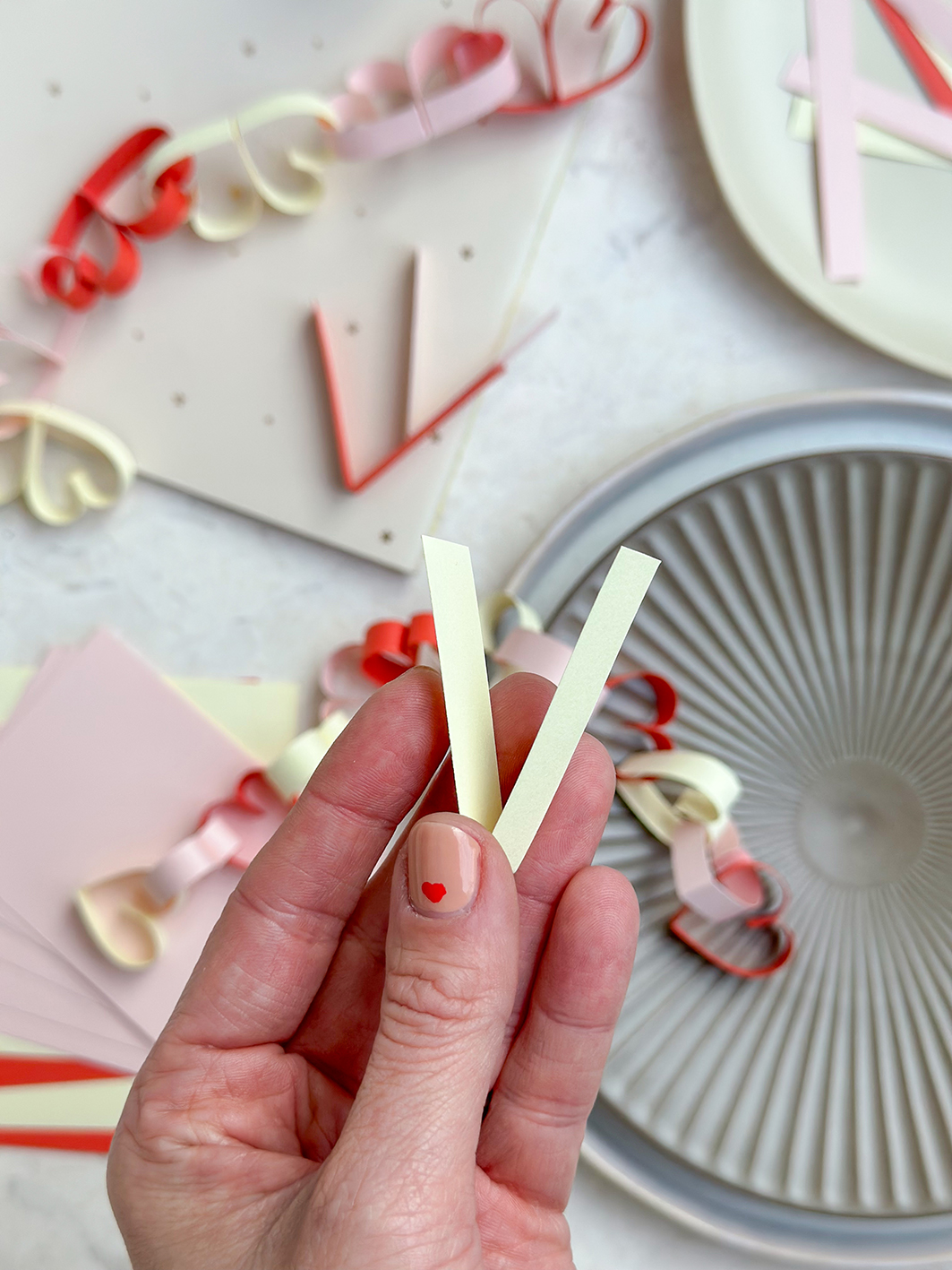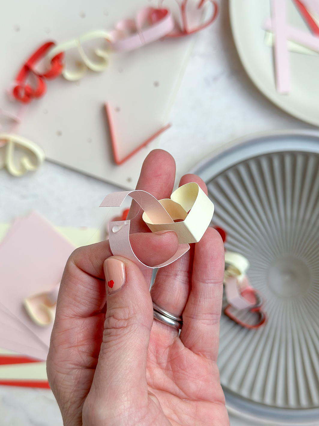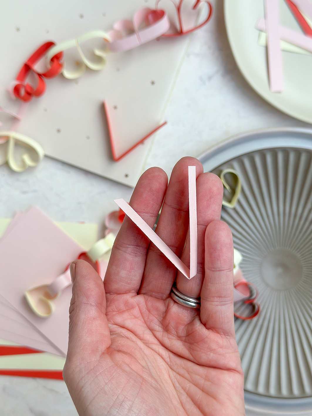 5. Als nächsten den rosa farbenen Karton auch in Streifen der selben Länge und Breite schneiden. Wieder zu einem “V” knicken, wieder die Enden herzförmig zu Bögen formen.