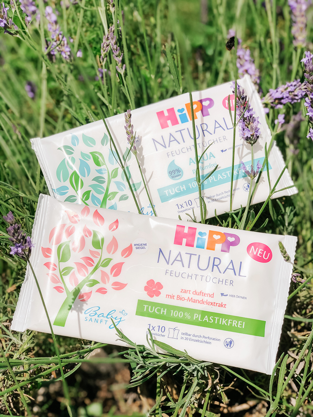 Was aber mindestens genauso wichtig ist, wie die Windeln, sind die Feuchttücher. Egal ob zuhause oder unterwegs, ich habe meine immer griffbereit. Exklusiv durfte ich schon vorab die neuen HiPP natural Feuchttücher testen. Diese Tücher sind 100% plastikfrei (ist ja nicht unbedingt üblich) und sogar biologisch abbaubar. Die Doppeltücher können ganz einfach in der Mitte geteilt werden, falls man nur ein kleines Tuch benötigt oder ein Tuch für Gesicht und Po aufteilen möchte. Die Variante ohne Duft besteht zu 99% aus Wasser und die mit Duft beinhaltet Bio Mandelextrakt. Ab August 2020 werden die Tücher in 2 verschiedenen Größen erhältlich sein. Entweder 2 mal 60 Tücher oder in der 10er Größe, perfekt für unterwegs.