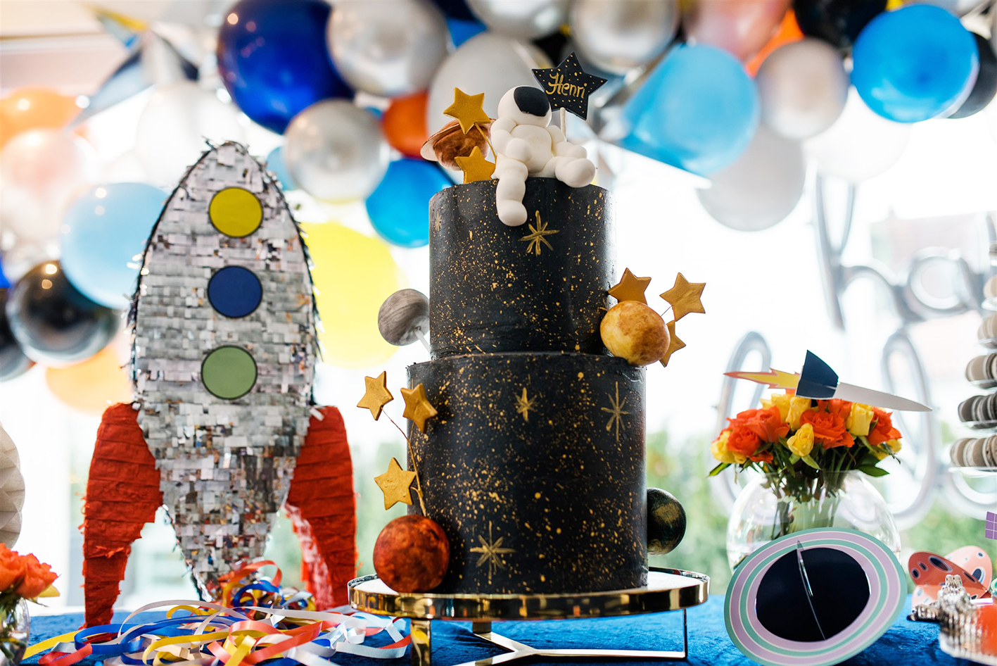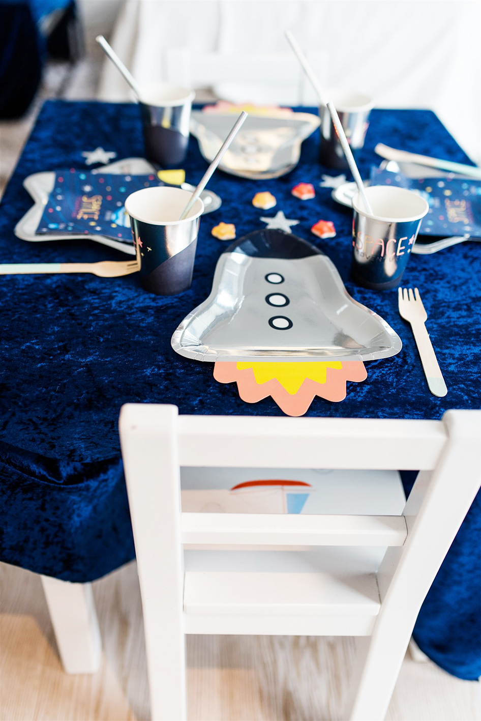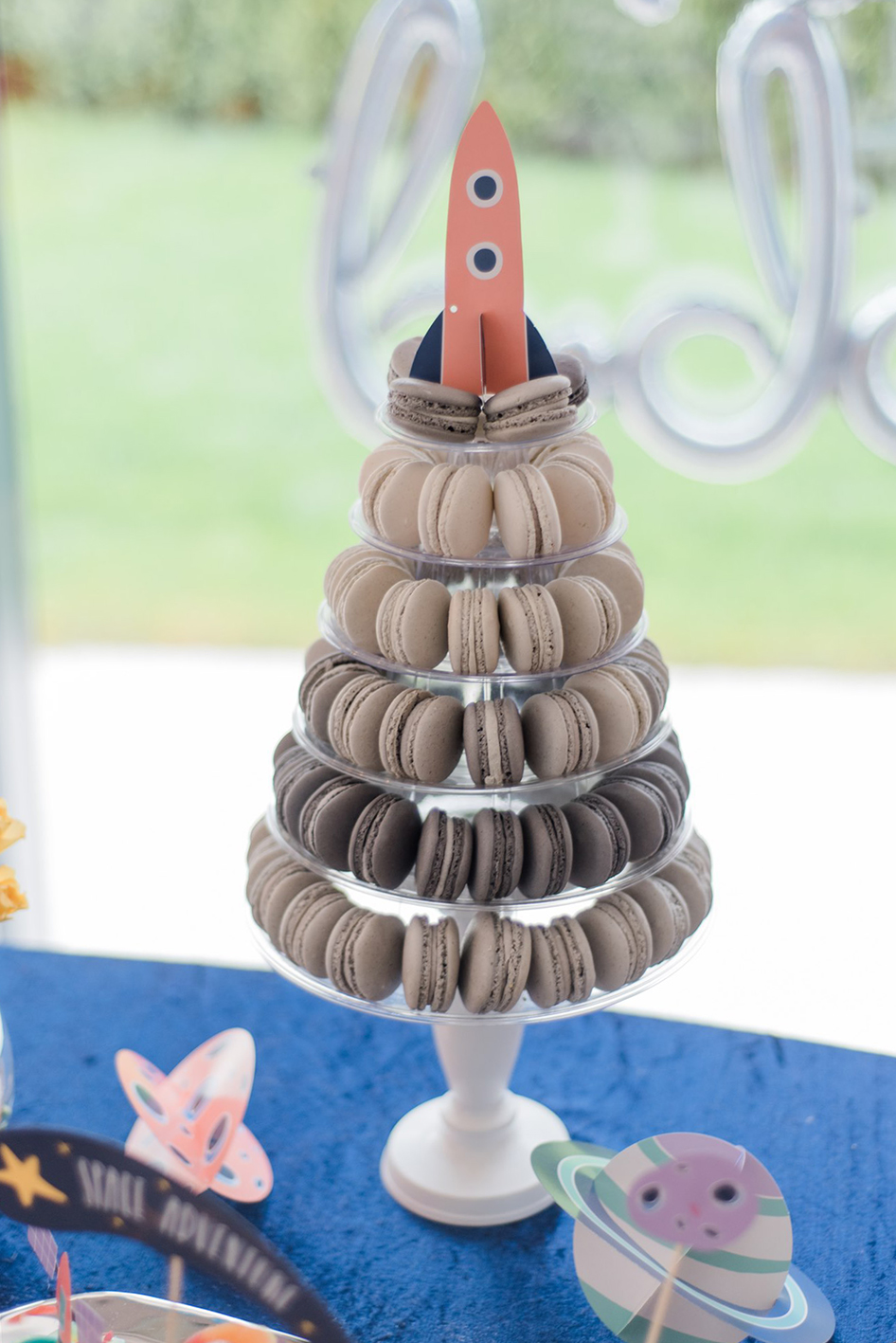 Vorgegeben waren lediglich die Farben Blau, Gelb, Orange, Rot und Silber. Beim Rest durfte sich jeder austoben, wie er mochte. Natürlich habe ich mich bei meinen Raketenkeksen an die Farbauswahl gehalten und habe sie entsprechend mit einem Royal Icing dekoriert. Am liebsten hätte ich sie alle selbst gegessen, aber habe ich natürlich nicht. Claudia hat sich mit der Deko einfach selbst übertroffen. Den 4. Geburtstag des kleinen Henris hat sie gleich zum Anlass genommen und das Motto in ihren Shop inabox mit aufgenommen. Dort bekommt ihr die Party in der Box. Darin findet ihr alles an Deko, Spieleideen und sogar Backanleitungen inbegriffen. Alles, was man für eine Party benötigt. Der Kuchen und die Macarons hatte Alexa beigesteuert. Wundervoll, was sie gezaubert hat nebst ihrem Cafe in München Bogenhausen. Die Weltraumtorte war einfach ein Traum. Und wie süß der kleine Astronaut obenauf saß.