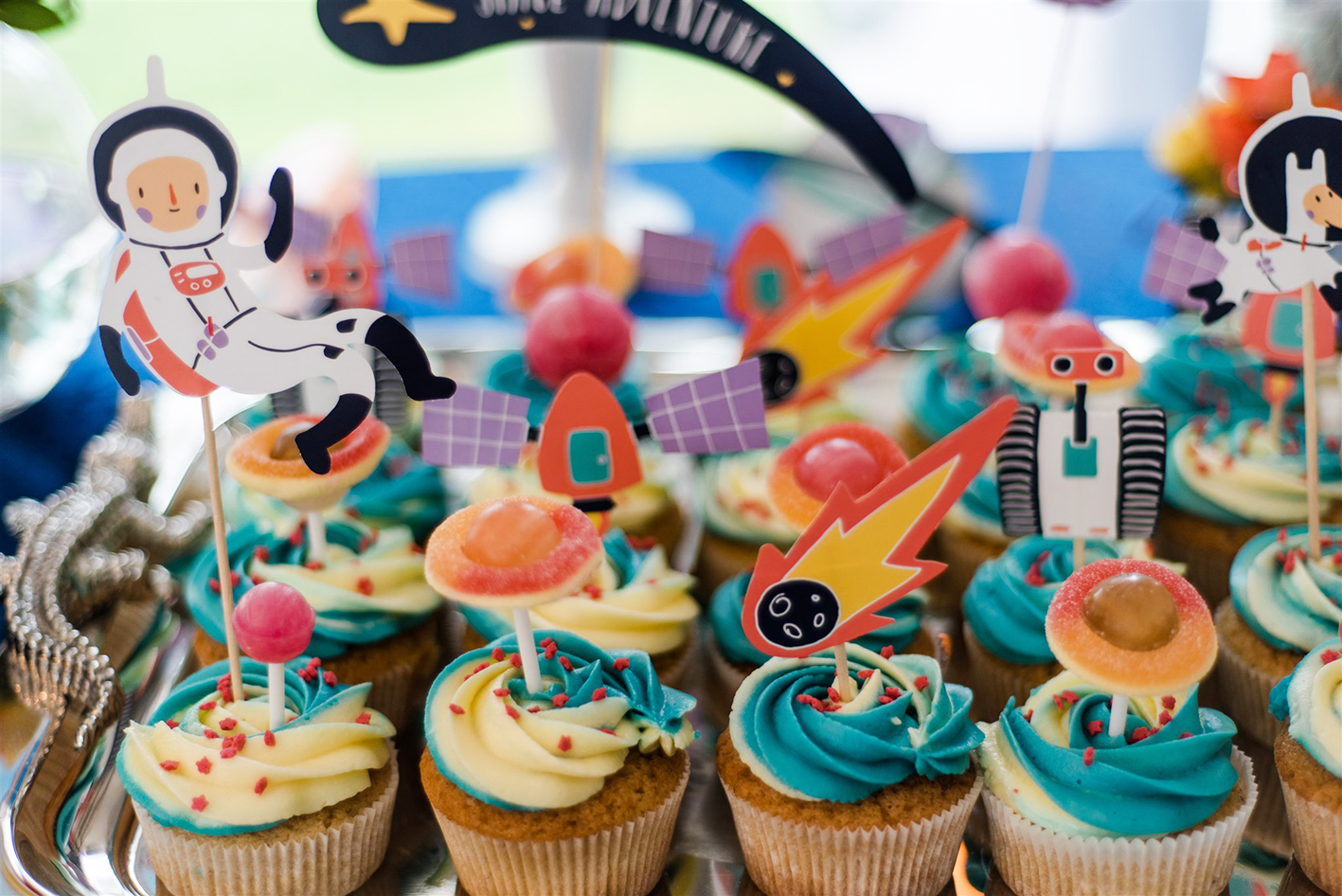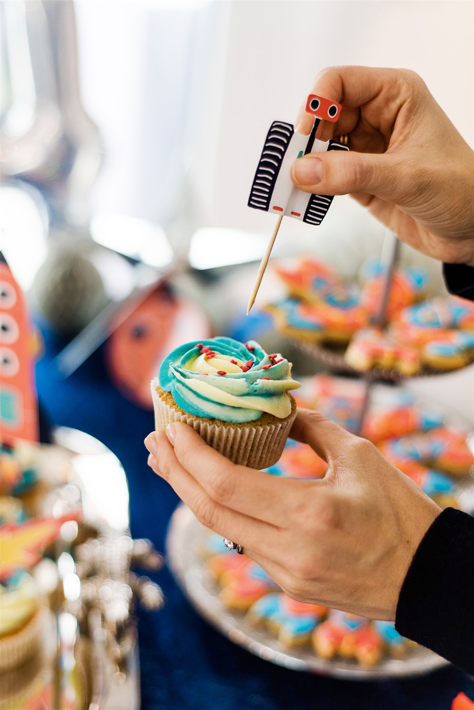 In Eigenregie hat Nadine, die Mama von Henri, noch Raketenspieße aus Obst gezaubert. So hatten die Kids neben all dem Süßen auch noch ein paar Vitamine. Zu guter letzt haben wir gemeinsam noch ein paar Cupcakes mit einem Frischkäsefrosting und lustigen Raketen-Toppern verziert. Die liebe Felicitas hat das tolle Endergebnis mit der Kamera festgehalten. Die Bilder sind einfach bezaubernd gworden. Vielen Dank an alle für das tolle Projekt, der süße Henri hatte definitiv einen tollen 4. Geburtstag.