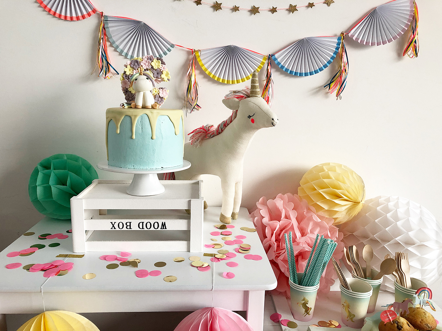 For the decoration I wanted a matching, colorful, yet stylish look and it all should fit to each other. Started with balloons, pompoms and ending with the cutlery. For all of this the kids party box from “in a box” really was the right choice. Matching the theme we chose the kids birthday box “Magical Unicorn” for 6 children, including presents for the guests.