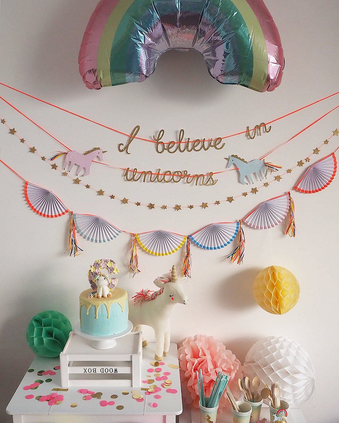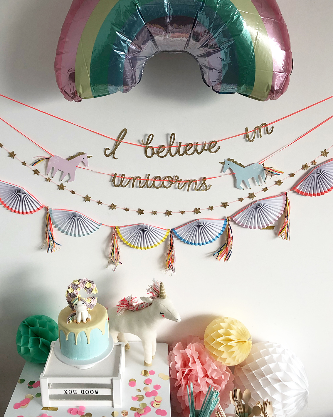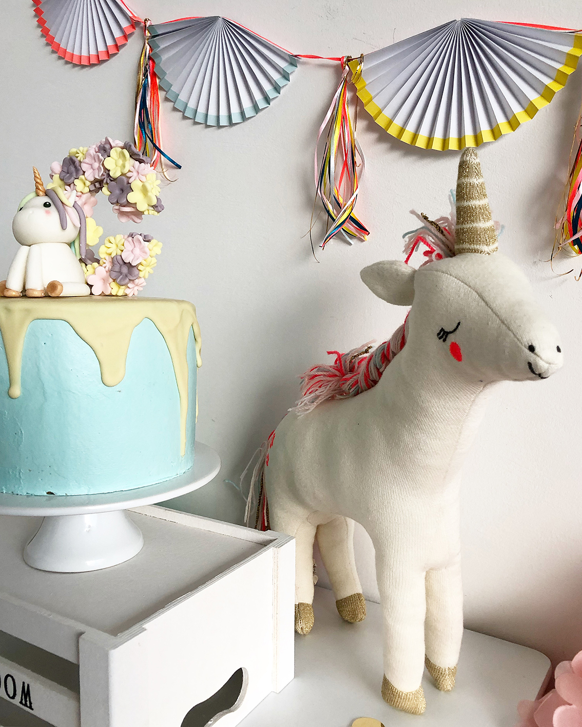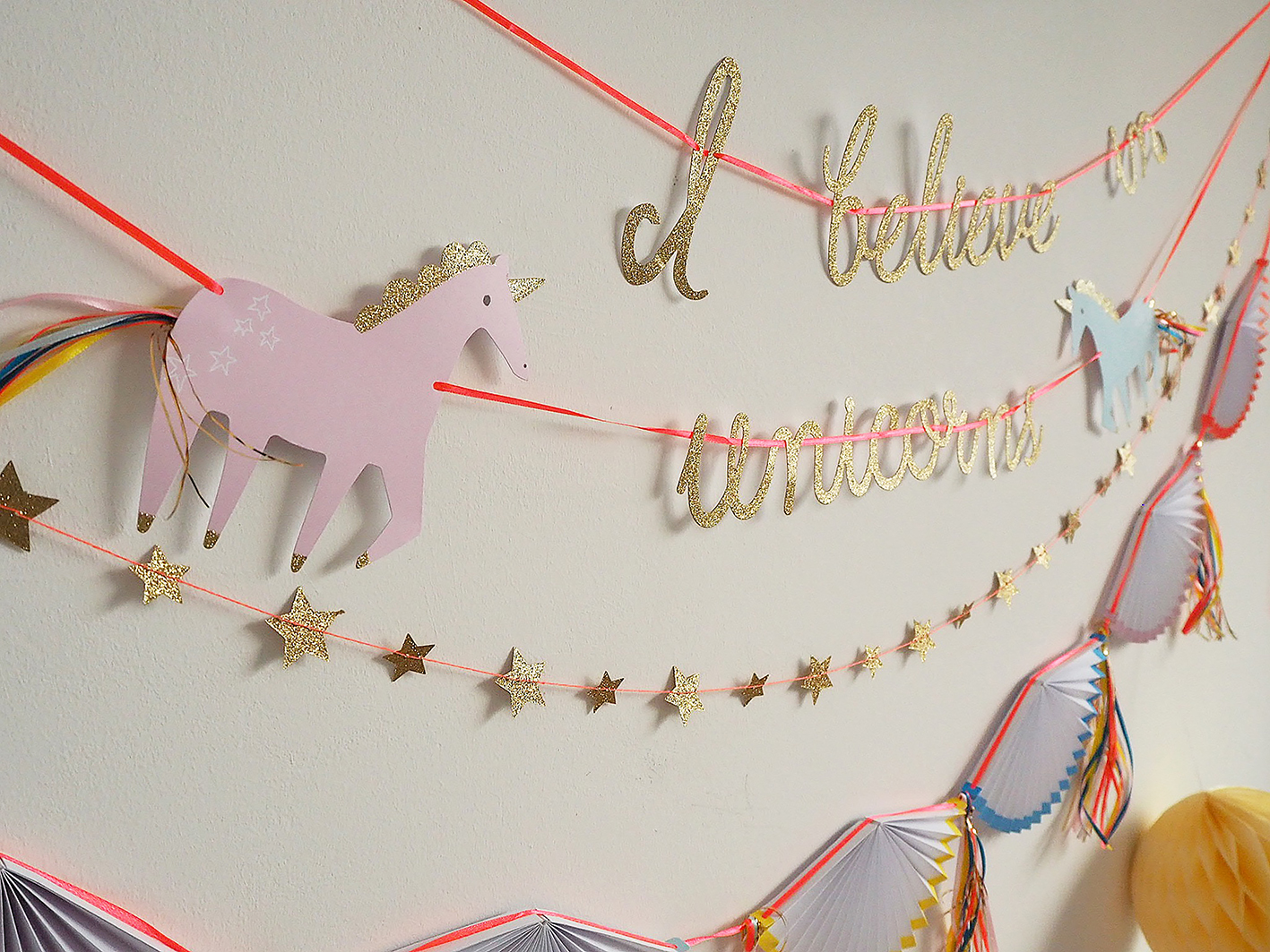 And as every birthday up to now had a theme, this one had to have one as well. My daughter was not sure whether to take unicorn or mermaid. So we decided to have a mermaid cake on her birthday itself and taking the unicorn one for her proper party. But a real kids birthday does include invitations, decoration, cake, games and much more. The cake I really wanted to on my own as usually and I fell in love with this super cute unicorn and the initialize in the shape of an “C”. The cake I made already the days before the actual party. The decoration I started preparing in the evening before the actual party was happening.