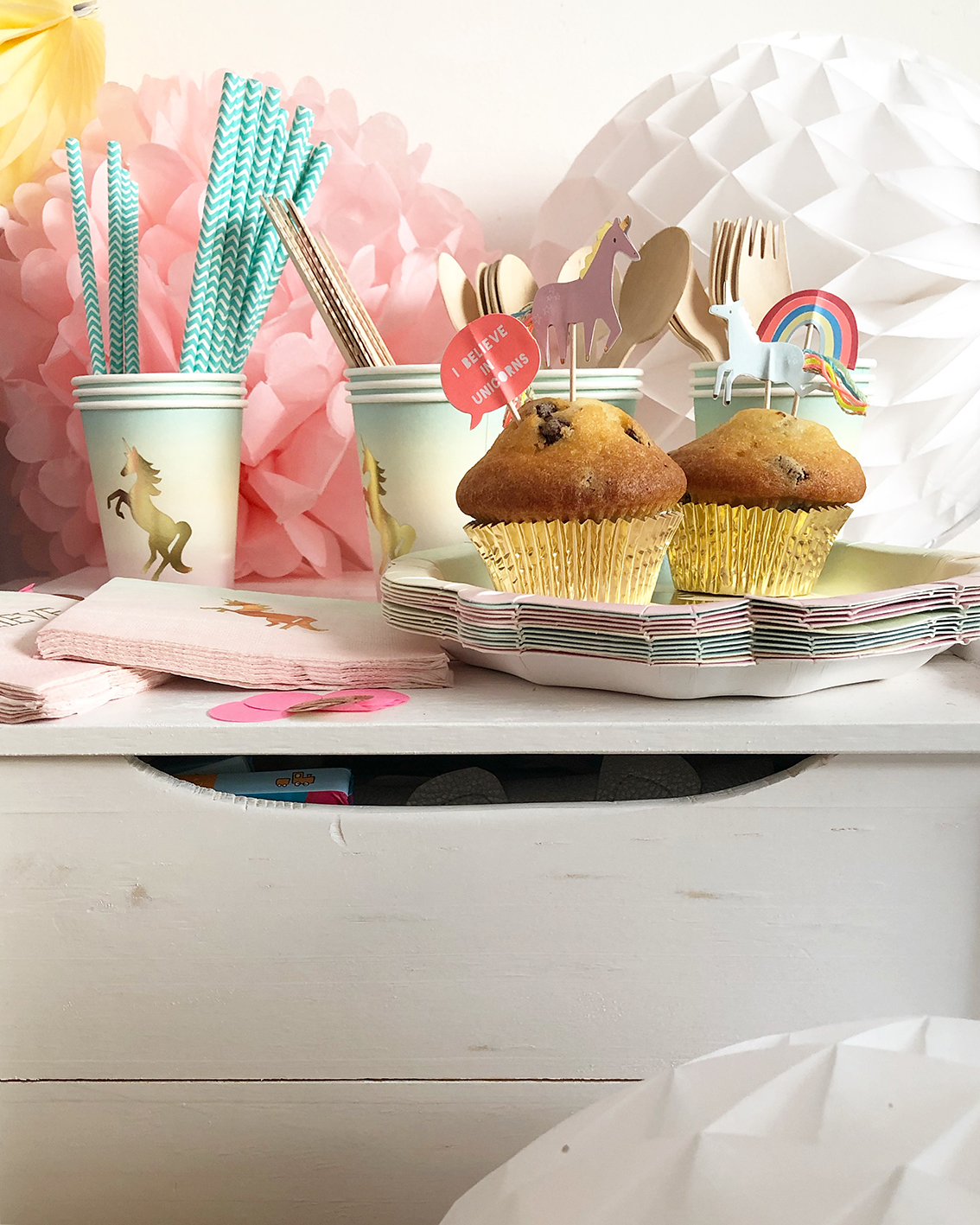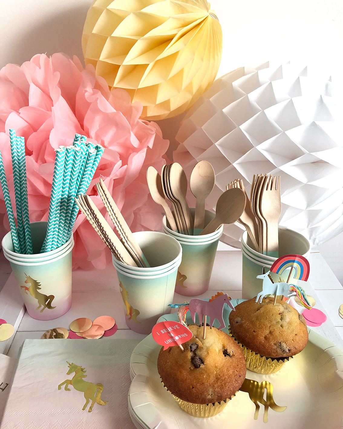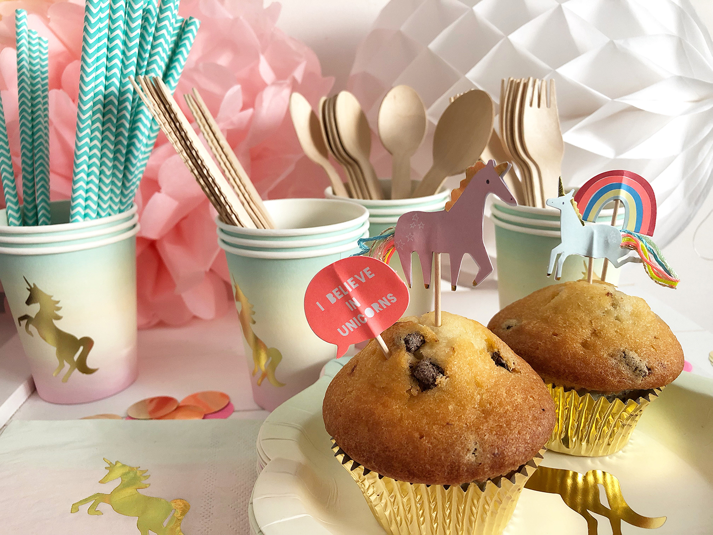 This box does really include everything you can imagine. Invitation set, several pompoms, rainbow balloon, unicorn garland, guest presents, birthday game, cardboard plates, straws and cups, serviettes, wooden cutlery, confetti, cupcake molds and cupcake toppers. On top you do get a manual, recipe and game ideas. So really everything you need. All the pieces are good quality brands and material. Setting everything up was really easy. Preparing pompoms, blowing up the rainbow balloon and set the table ready. In total it took me about 2 hours until the whole party decoration was set.