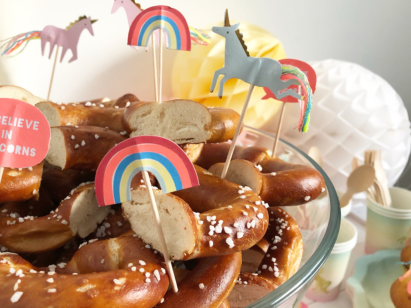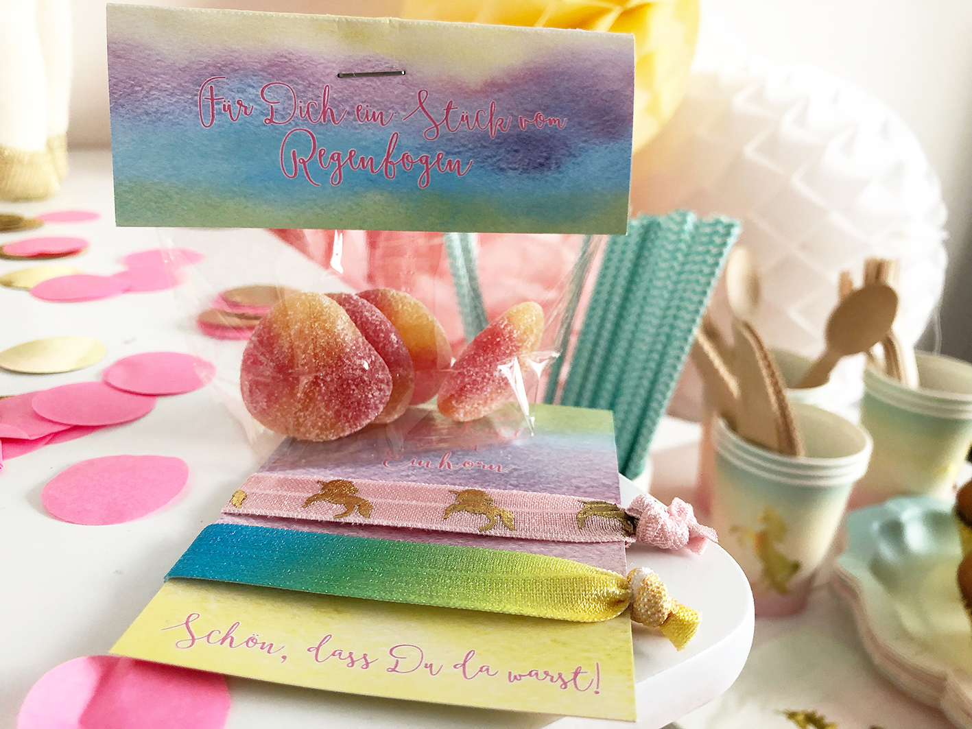 Für die Dekoration wollte ich einen zum Motto passenden, farbenfrohen und dennoch stylischen Look, bei dem alles zusammenpassen sollte. Angefangen mit Luftballons, Pompons, bishin zu Pappteller mit Besteck. Für all das kam mir die Kids Party Box von “in a box” gerade recht. Passend zum Thema Einhorn wählten wir die Kindergeburtstagsbox kids birthday box “Magical Unicorn” für 6 Kinder inklusive kleiner Gastgeschenken. Bei den Gastgeschenken war es so, dass diese bei der Einhornparty eher für Mädchen ausgerichtet waren. Da aber auch 2 Jungs unter den Gästen waren, habe ich für diese alternativ eine andere Kleinigkeit gekauft.