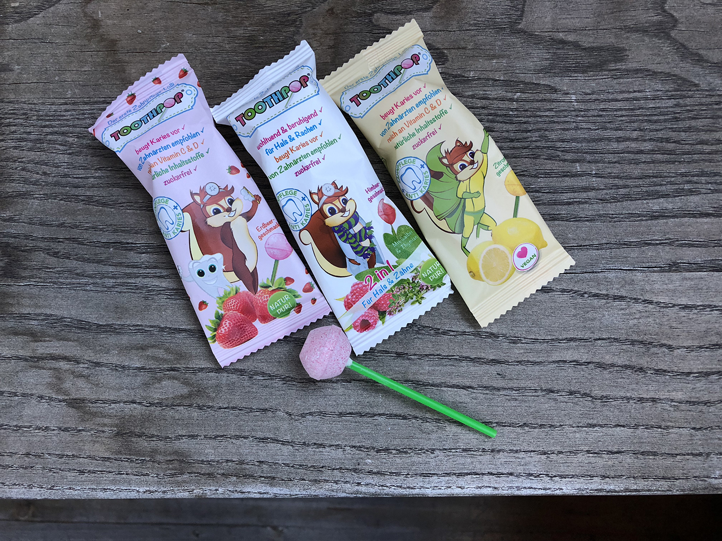 Es gab noch ein anderes Thema, das ich oben erwähnt habe. Es ging dabei um das Zähne putzen. Wie in jeder Familie kämpfen auch wir mal mehr und mal weniger mit dieser Thematik. Tatsache ist jedoch, dass meine Kinder zweimal täglich ihre Zähne putzen müssen. Das einzige Problem: Wenn sie sich morgens die Zähne putzen und dann etwas Süßes zum Frühstück wie Marmelade oder Müsli haben. Ich möchte ja auch nicht, dass sie sich die Zähne jedes Mal putzen, sobald sie etwas Süßes essen. Aber für dieses Problem habe ich eine andere großartige Lösung: Toothpop Lollis. Die Toothpop Lollis pflegen die Zähne, enthalten viel Vitamin C und D und schmecken außerdem wirklich lecker.