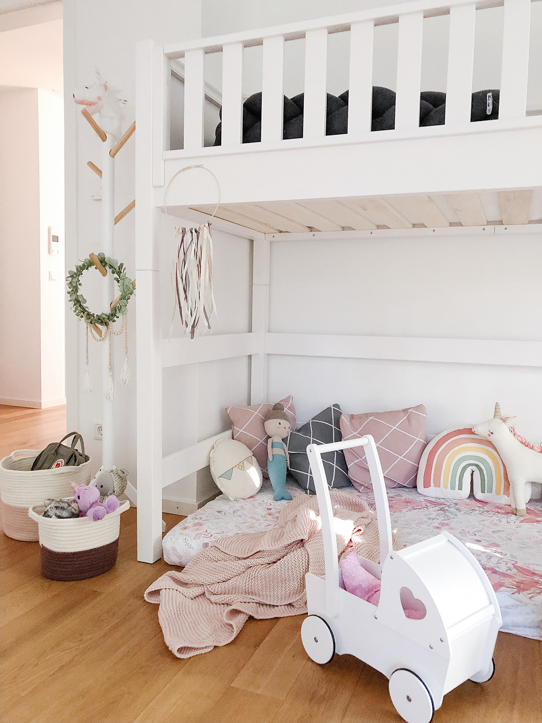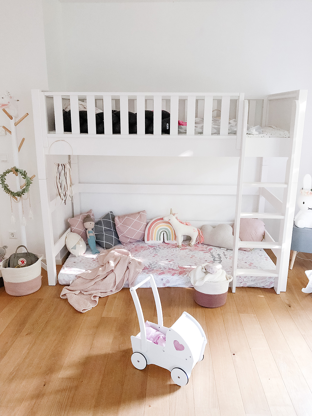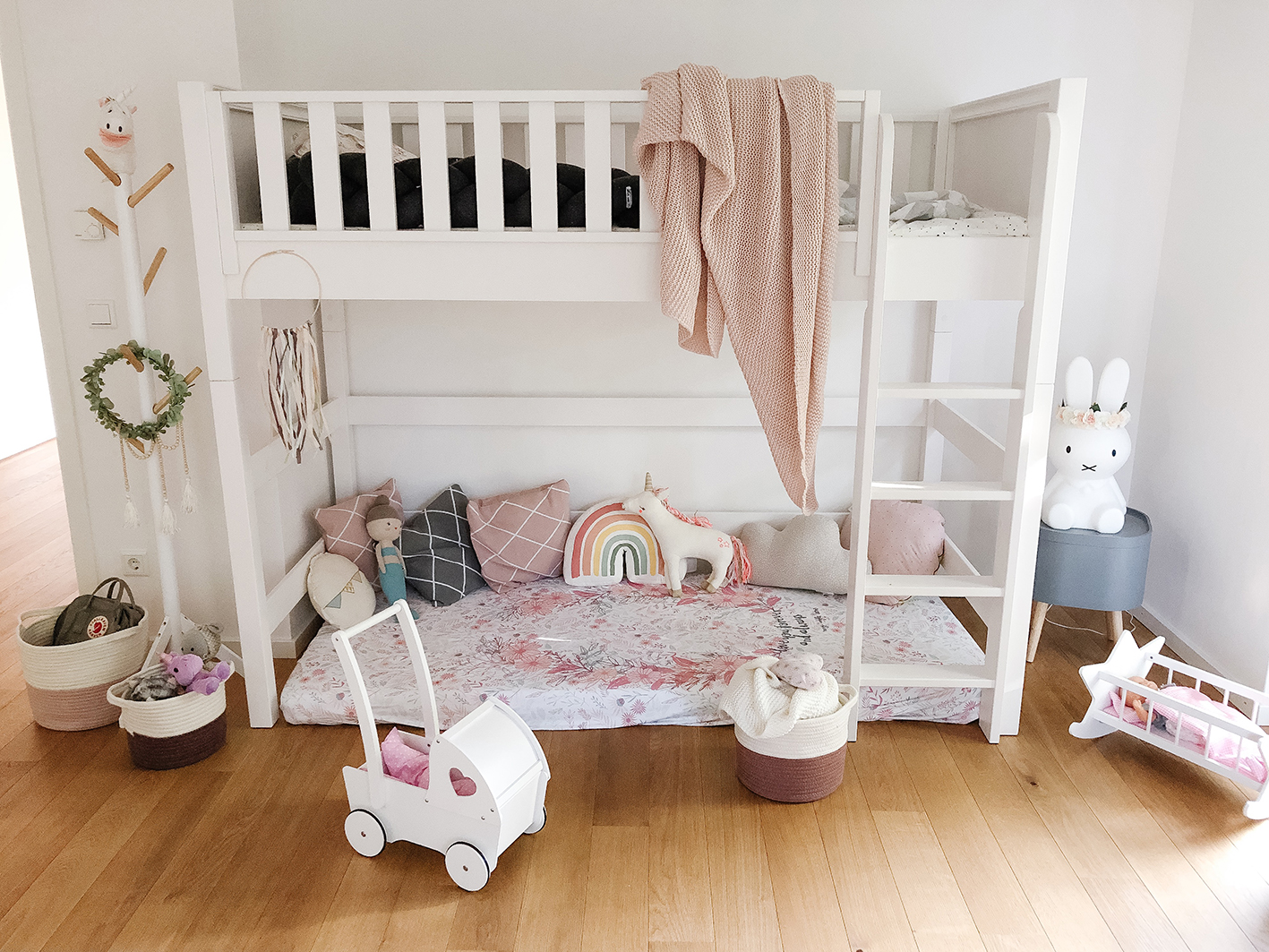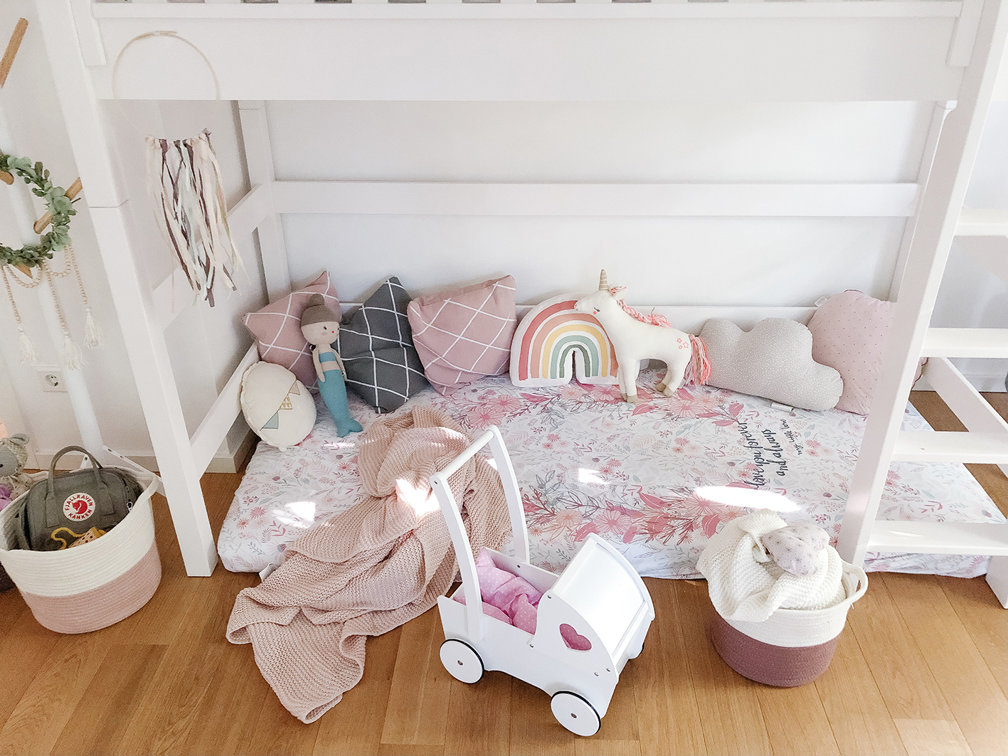 Unten haben wir uns letztendlich dafür entschieden eine Matratze zu legen. Das haben wir mit einem hübschen Spannbettuch bezogen und mit Kissen und Kuscheltieren dekoriert. Vieles davon hatten wir schon, kam nur leider nicht zum Einsatz bisher. Umso mehr freue ich mich, dass man die Meerjungfrau und das Einhorn in voller Pracht sehen kann. Damit nachts auch wirklich nichts passiert, wacht Miffy neben dem Hochbett und leuchtet den Weg aus. Übrigens, ist sie bisher nicht einmal heruntergefallen.