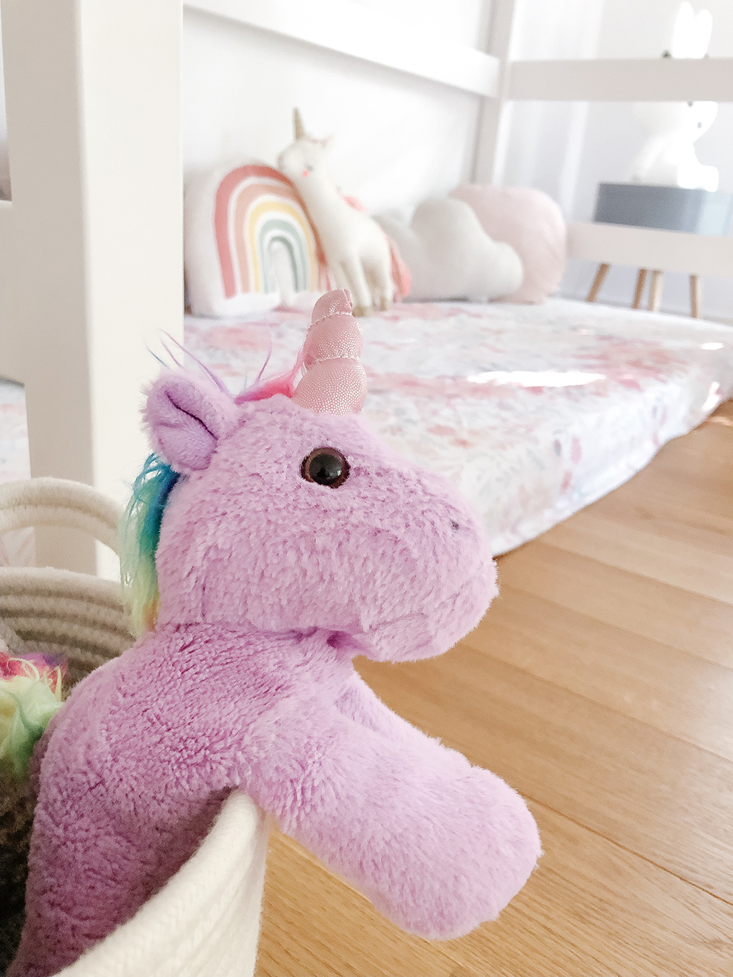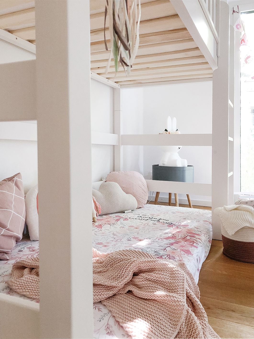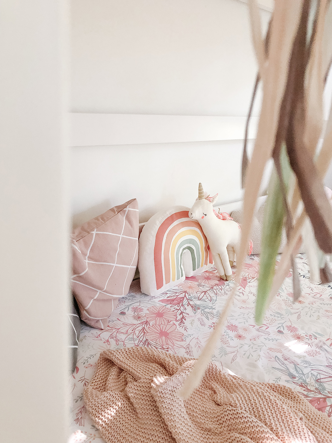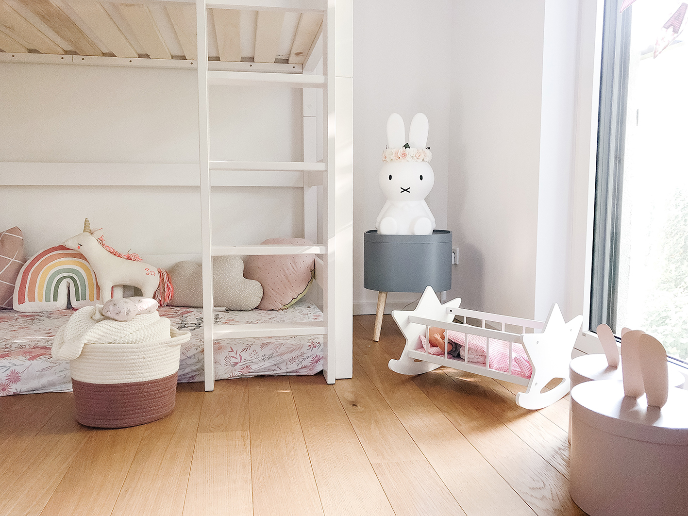 Unten haben wir uns letztendlich dafür entschieden eine Matratze zu legen. Das haben wir mit einem hübschen Spannbettuch bezogen und mit Kissen und Kuscheltieren dekoriert. Vieles davon hatten wir schon, kam nur leider nicht zum Einsatz bisher. Umso mehr freue ich mich, dass man die Meerjungfrau und das Einhorn in voller Pracht sehen kann. Damit nachts auch wirklich nichts passiert, wacht Miffy neben dem Hochbett und leuchtet den Weg aus. Übrigens, ist sie bisher nicht einmal heruntergefallen.