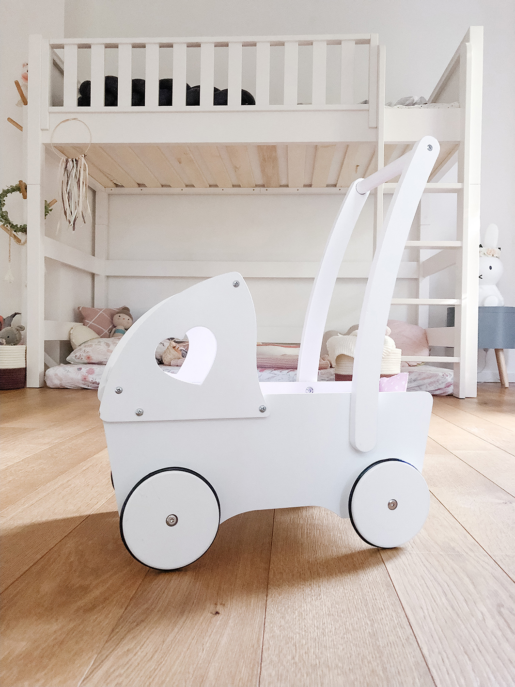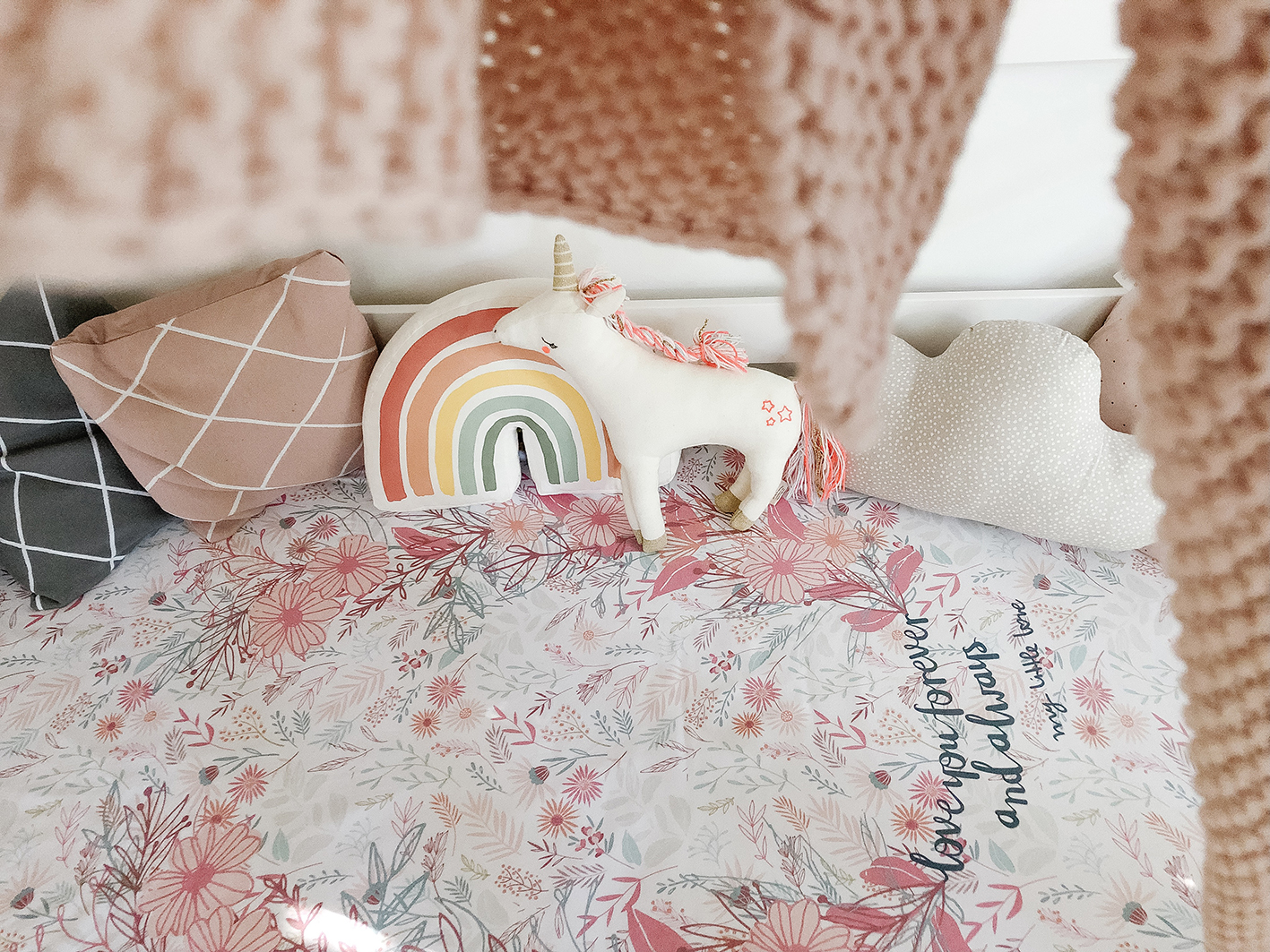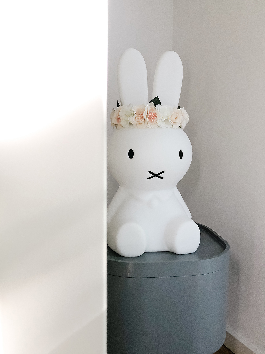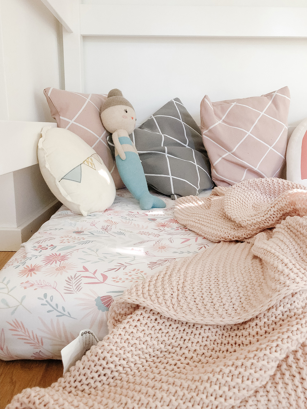 Unten haben wir uns letztendlich dafür entschieden eine Matratze zu legen. Das haben wir mit einem hübschen Spannbettuch bezogen und mit Kissen und Kuscheltieren dekoriert. Vieles davon hatten wir schon, kam nur leider nicht zum Einsatz bisher. Umso mehr freue ich mich, dass man die Meerjungfrau und das Einhorn in voller Pracht sehen kann. Damit nachts auch wirklich nichts passiert, wacht Miffy neben dem Hochbett und leuchtet den Weg aus. Übrigens, ist sie bisher nicht einmal heruntergefallen.
