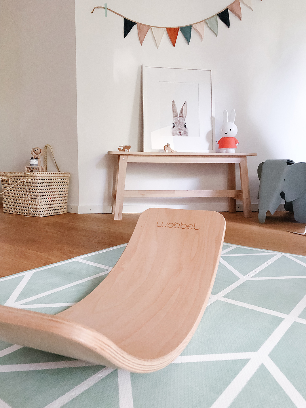 Wie gesagt, hatten wir schon einen großen Teil der Möbel und ein paar Dekostücke. Dabei hat es sich doch wieder ausgezahlt, dass wir viele Möbelstücke für die Kinderzimmer einfach in klassisch weiß kaufen. Somit lässt sich das meiste an Farben wirklich super kombinieren. Neu hinzu kamen bei uns Tapete, Holzbank und -hocker, Bastkörbe, Miffy-Lampe, Kuschelgiraffe und die Spielmatte in der Farbe Mint. Über diese Spielmatte bin ich besonders happy. Wir haben ja schon eine Weile eine in Sandfarbe, die jetzt bei unserer Tochter im Kinderzimmer liegt. Nachdem ich etwas Farbe ins Zimmer wollte, blieb ich am Ende bei Hellblau oder Mintgrün hängen. Und ich muss wirklich sagen, dass die Spielematten von Toddlekind in Sachen Farbe und Muster einfach die schönsten sind. Das Modell aus der Nordic Collection in Neo Matcha passt einfach perfekt zur Tapete, der Bettwäsche und den Kissen, die wir schon besaßen.