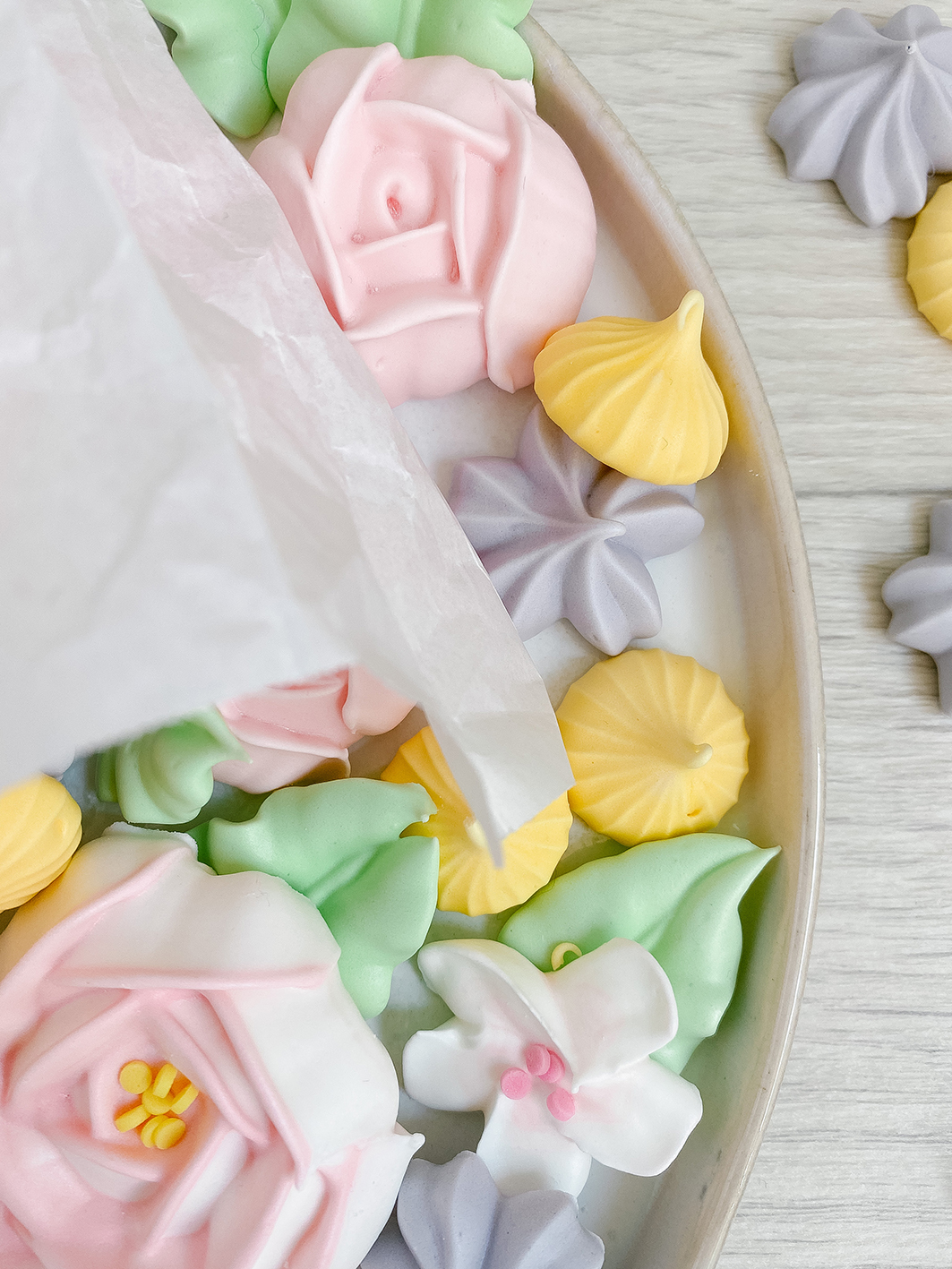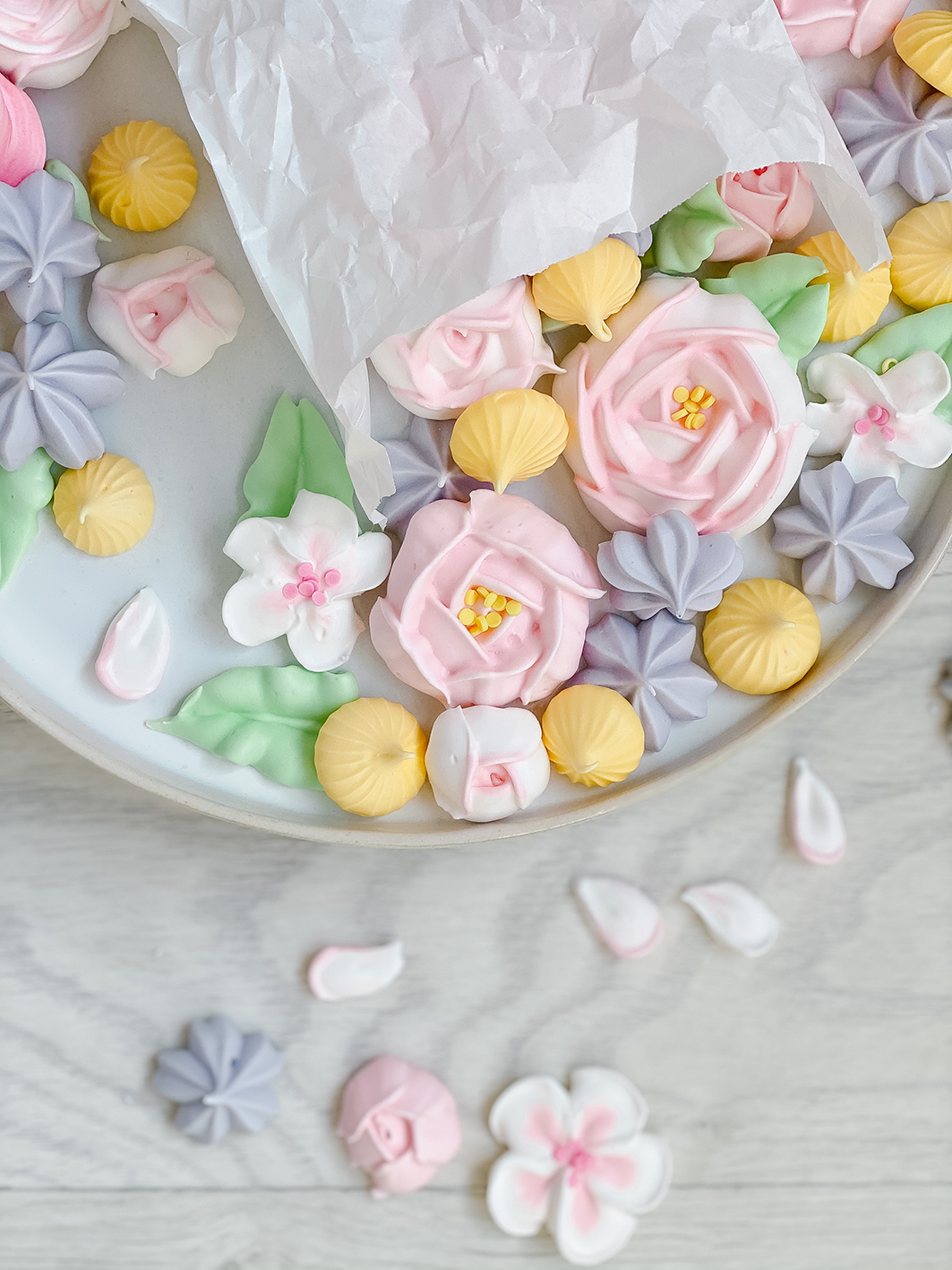 Ich muss gestehen, dass Baiser manchmal schon etwas komplizierter sein können. Das Wichtigste ist aber tatsächlich, dass die Basier-Masse richtig schön fest ist und Stand hat. Wenn sie zwischendrin mal etwas “flüssiger” wird, dann einfach nochmal mit etwas mehr Puderzucker aufschlagen. Gerade beim Farben unterrühren, kann die Masse schon etwas an Stand verlieren und verflüssigen. Durch verschiedene Spriztüllen bekommt ihr ganz einfach verschiedene Blumen. Ihr findet unten im Beitrag noch ein paar Videos, die ich euch verlinkt habe.
