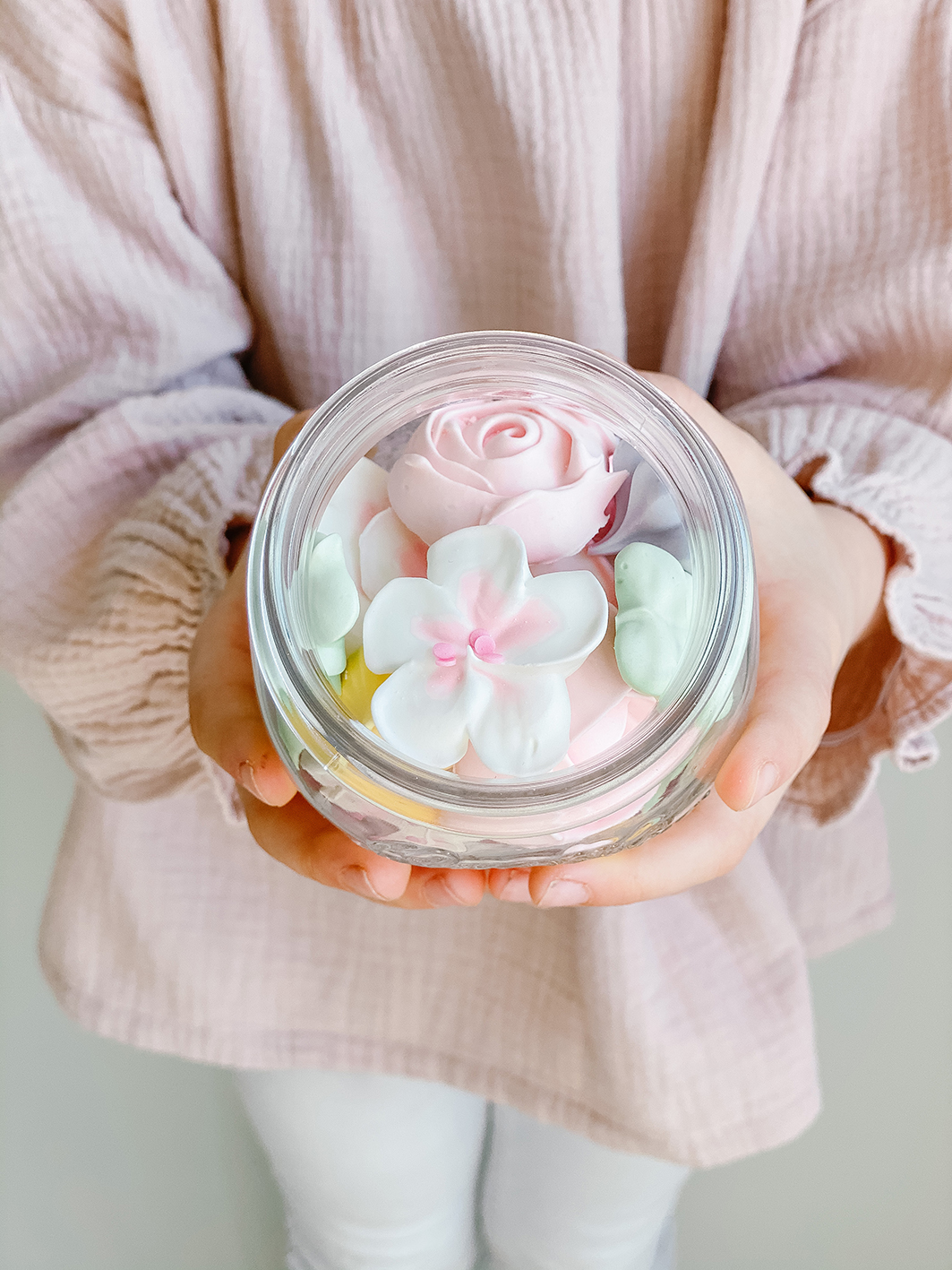Zu guter Letzt packt ihr die Blumen mit den Blättern in Schraubgläser oder in in transparente Geschenktüten, bindet eine Schleife um und schon kann der Baiser Blumenstrauß verschenkt werden.