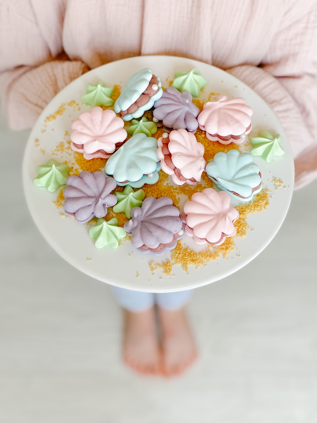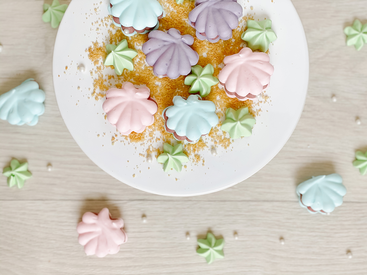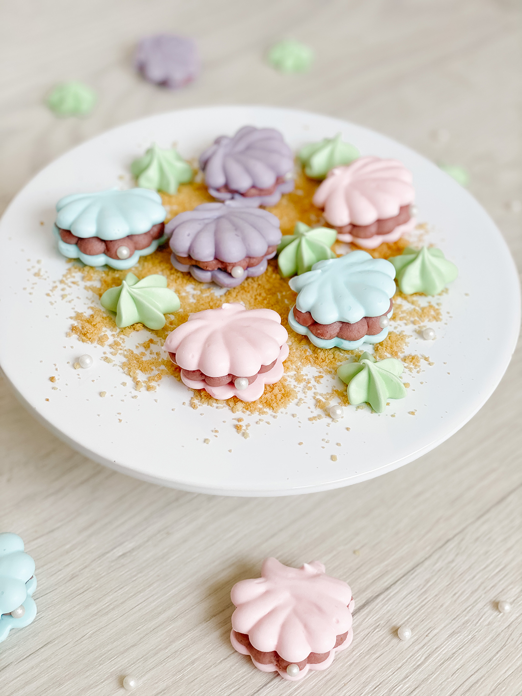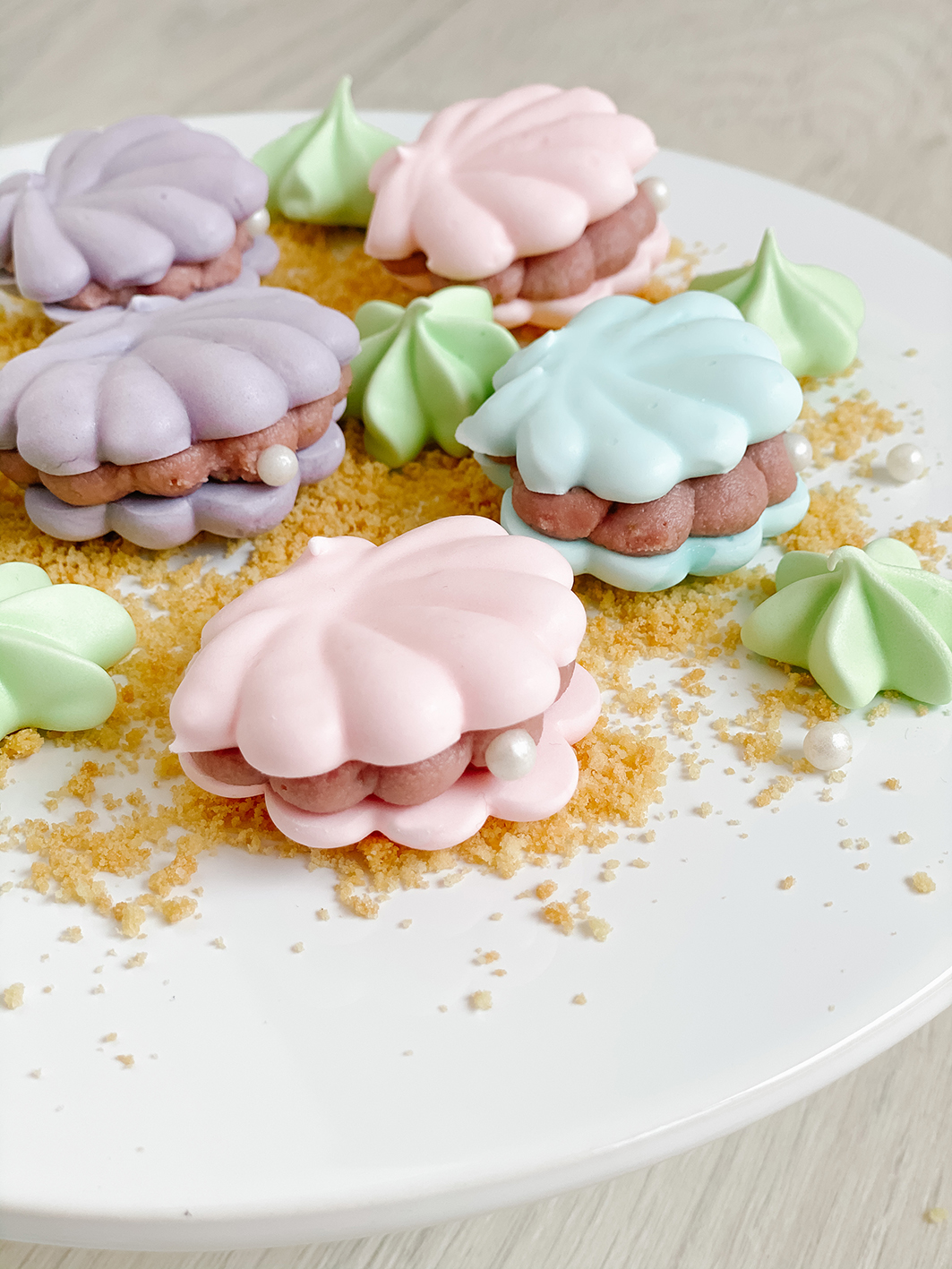 Gebt die Muscheln bei 50 Grad in den vorgeheizten Ofen und lasst diese dann für etwa 3-4 Stunden trocknen. Am besten bei leicht geöffneter Backofentüre. Sobald die Meringue-Muscheln sich vom Backpapier lösen lassen, sind sie fertig. Lass sie im Anschluss einfach im ausgeschalteten Ofen mit auskühlen.