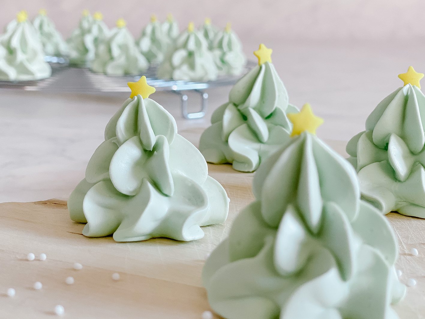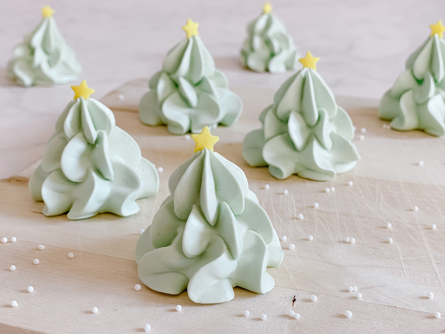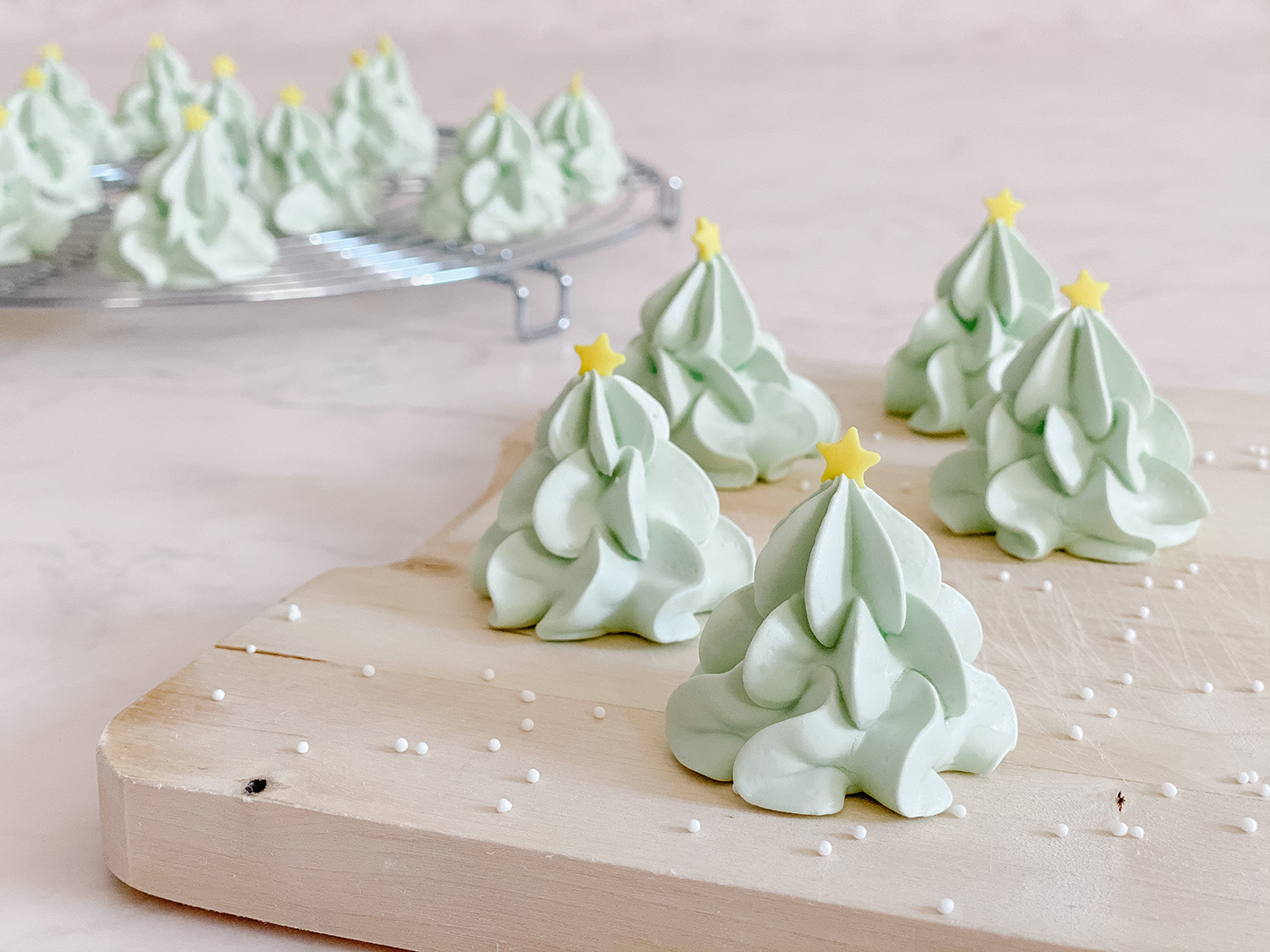 Diese Baiser Tannenbäume sind doch mal etwas anderes zu Weihnachten anstatt der üblichen Kekse, oder? Ich fand sie einfach wunderschön. Aber ich muss ja gestehen, Baiser sind ja so ne Sache für sich. Einmal gelingen sie gleich beim ersten Versuch und ein anderes mal braucht es 2 oder mehr Anläufe. Während die Meringue Geister zu Halloween tatsächlich sofort gelungen sind, brauchte es bei den Baiser Tannenbäumen doch ganze 2 Versuche. Aber so ist das Backen nun mal. Manchmal einfach unberechenbar. Beim ersten Versuch sind mir die Tannenbäume gekippt bevor ich sie überhaupt in den Ofen schieben konnte. Also habe ich die Menge an Puderzucker etwas erhöht und die Masse wesentlich länger aufgeschlagen. Bei der Form und dieser Höhe muss die Baisermasse richtig steif und fest werden.