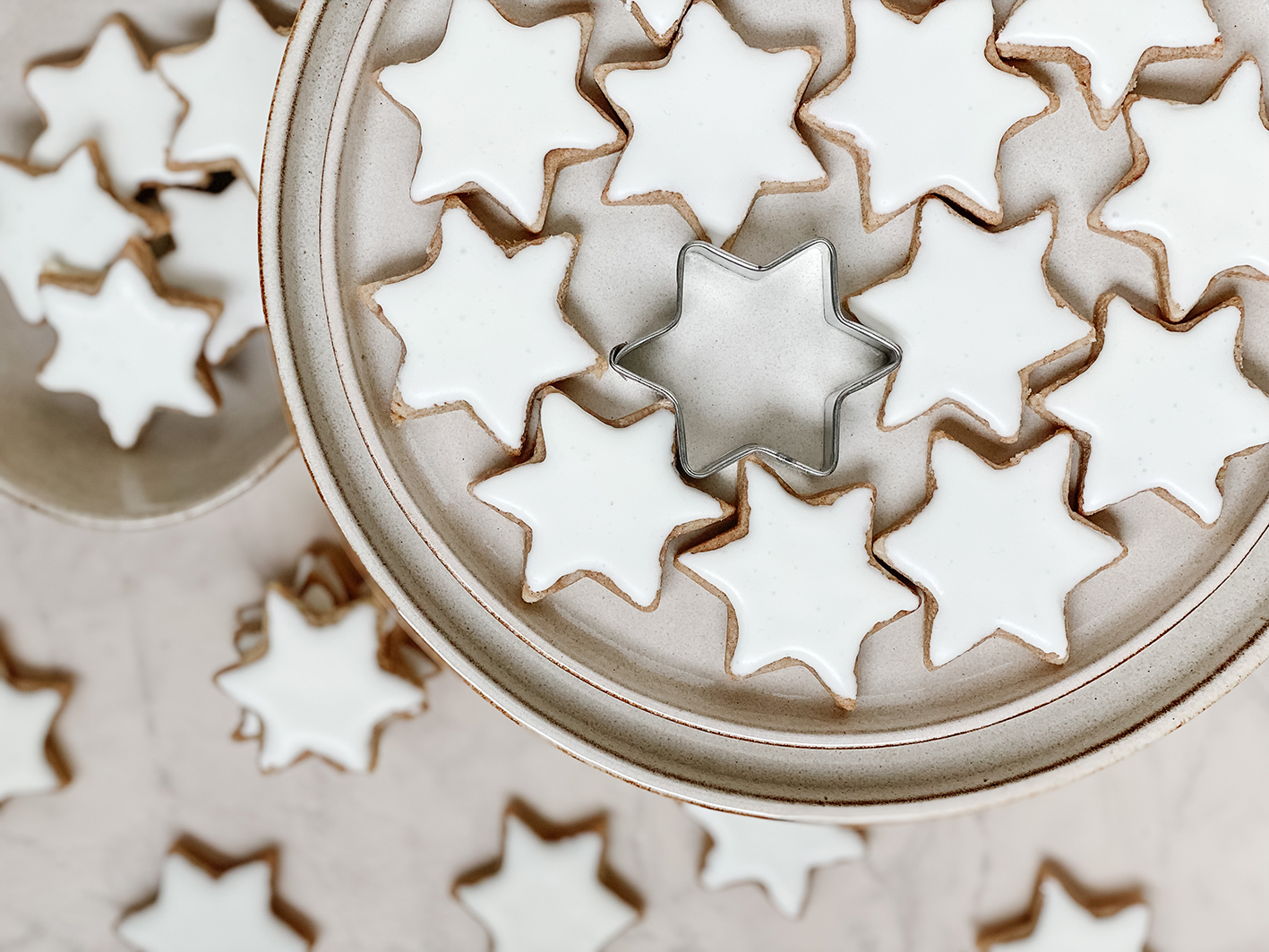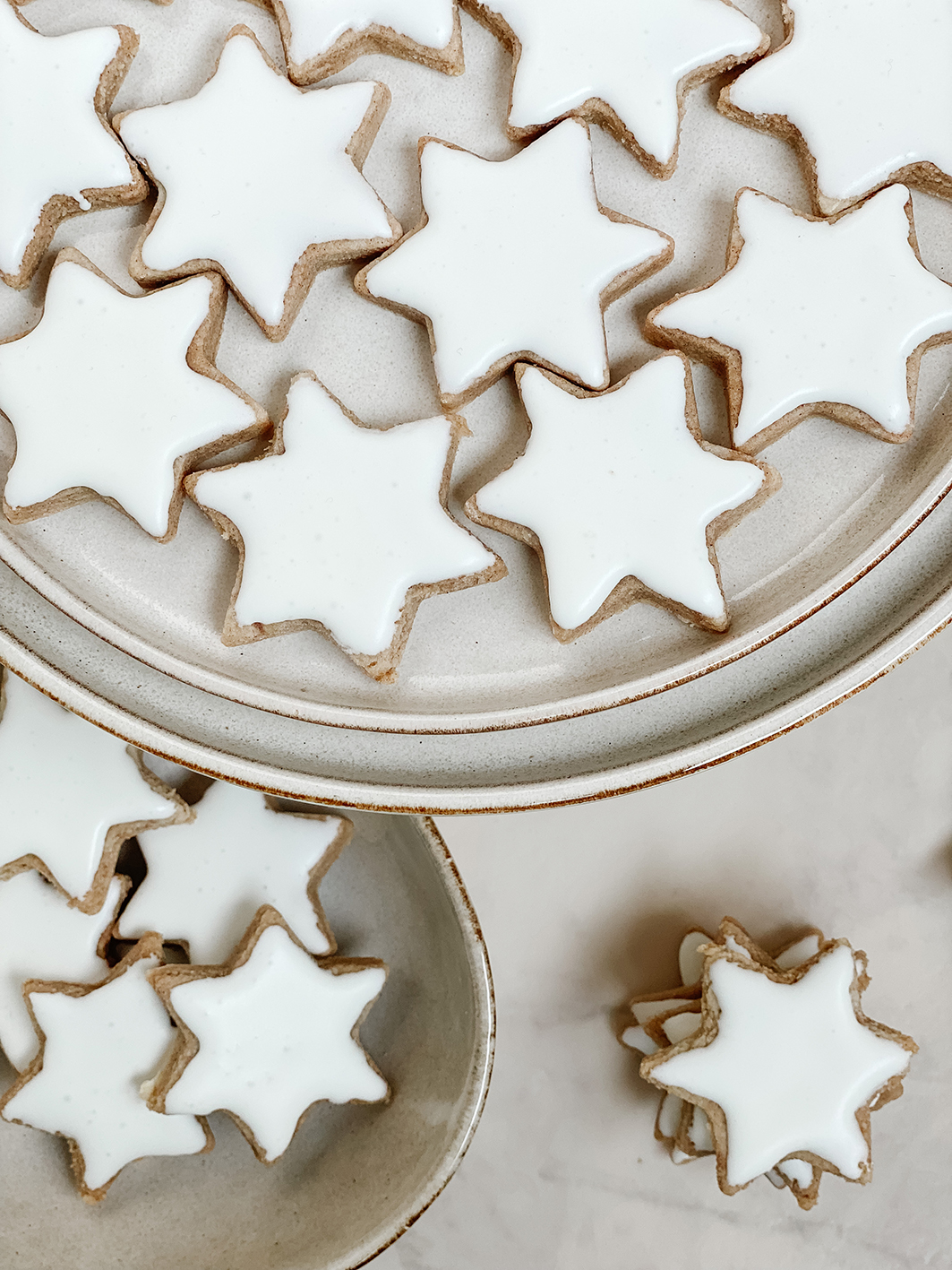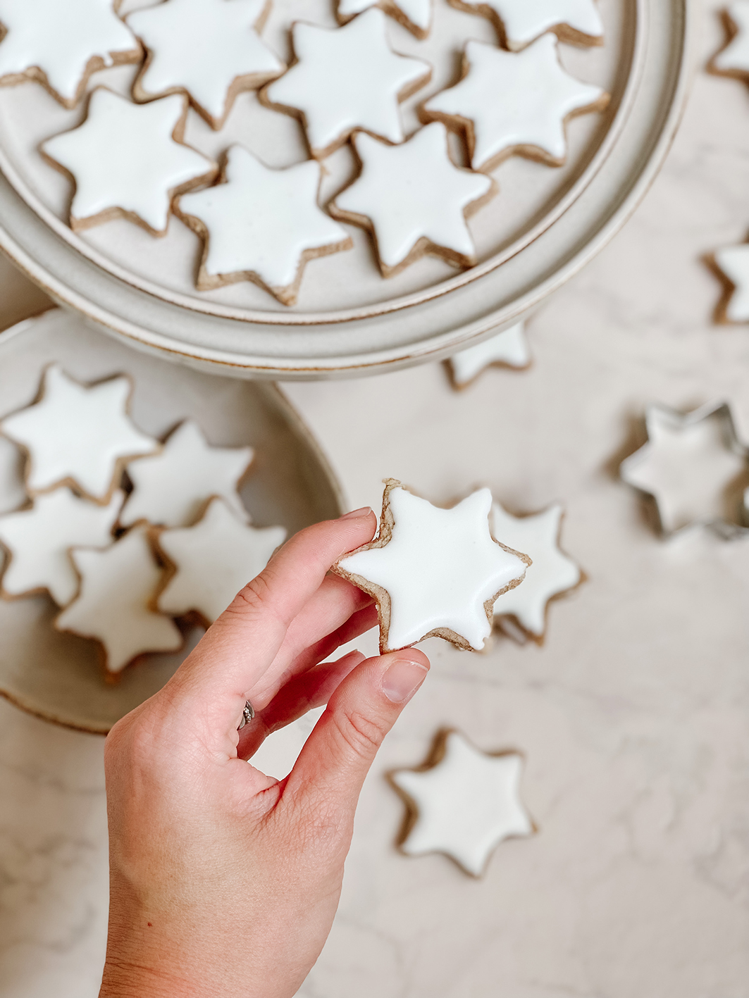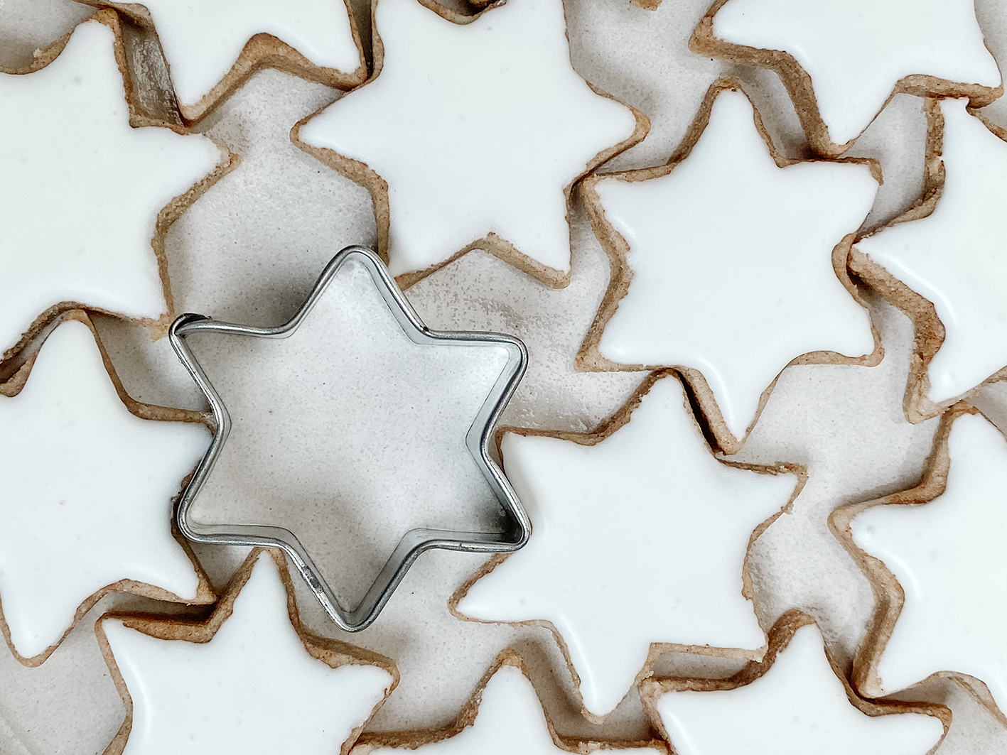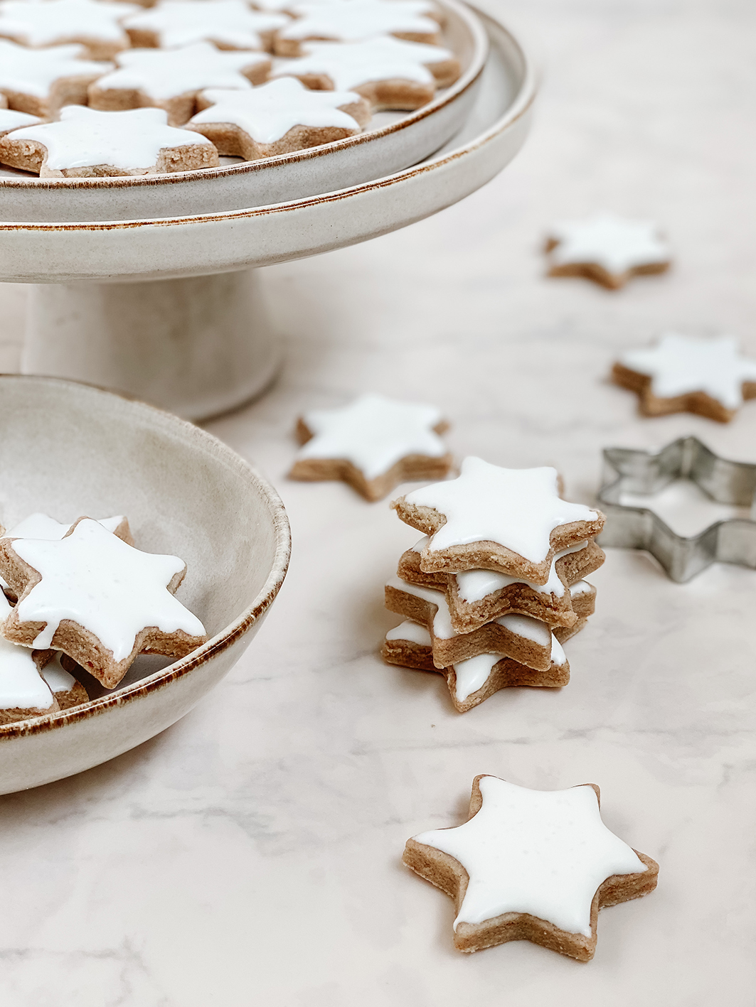 Jetzt geht es an das Royal Icing. Dafür schlagt ihr das Eiweiß auf und gebt am Ende wieder den Puderzucker unter. Schlagt alle Zutaten weiter bis es wieder eine relativ feste Masse wird. Nachdem die Sterne ausgekühlt sind, verteilt die Eiweiß-Puderzucker Masse auf die Sterne. Entweder ihr nutzt einen Pinsel, einen Teelöffel oder einen Spritzbeutel. In diesem Falle habe ich für die Mandel – Zimtsterne einen kleinen Löffel genutzt. Mit Spritzbeutel werden die Ränder etwas genauer. Aber dem Geschmack tut das ja nichts. Jetzt müsst ihr die Mandel – Zimtsterne nur noch komplett trocknen lassen und könnt sie euch schmecken lassen.