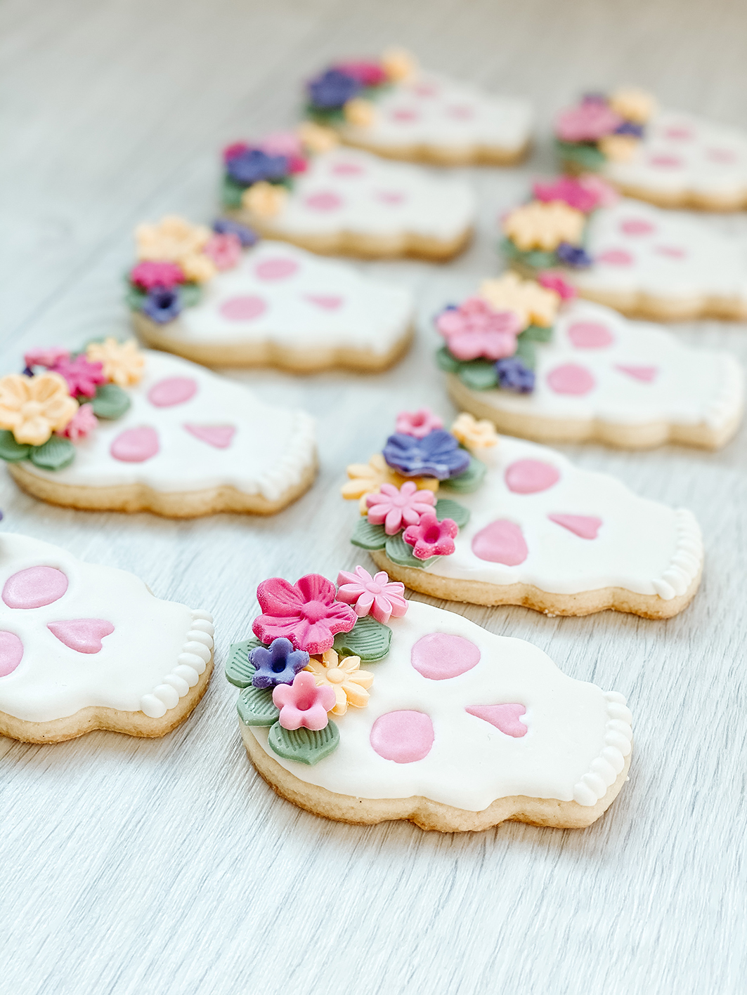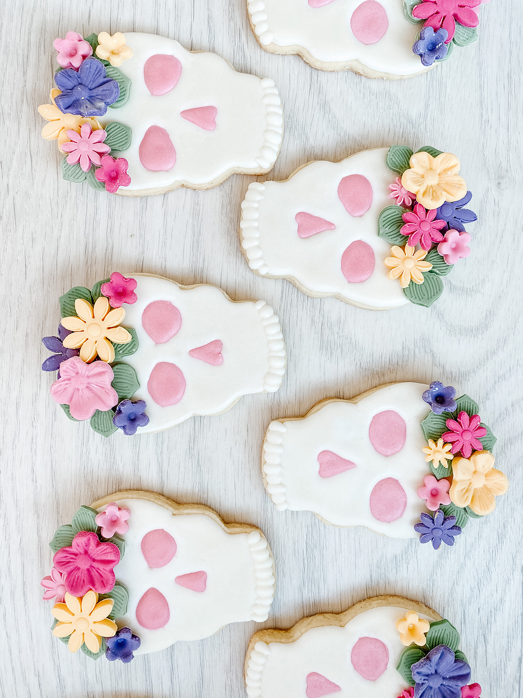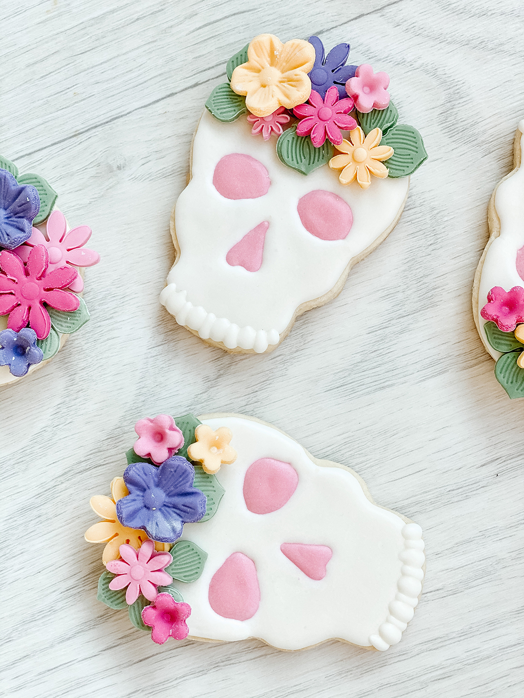 Für die Flower Crown benötigt ihr gefärbten Fondant in euren bevorzugten Farben. Ihr könnt aber auch weißen Fondant kaufen oder selber machen und diesen dann selbst färben. Ein Rezept für selbstgemachten Marshmallow Fondant findet ihr hier bei mir am Blog. Rollt den Fondant ca. 3mm dick aus und stecht euch mit Fondant Ausstechern verschiedene Blumen in unterschiedlichen Farben und Formen aus. Am besten lasst ihr sie über Nacht antrocknen, dann sind sie nicht zu empfindlich. Die Blumen und Blätter klebt ihr dann einfach mit etwas Royal Icing auf die Totenköpfe auf.