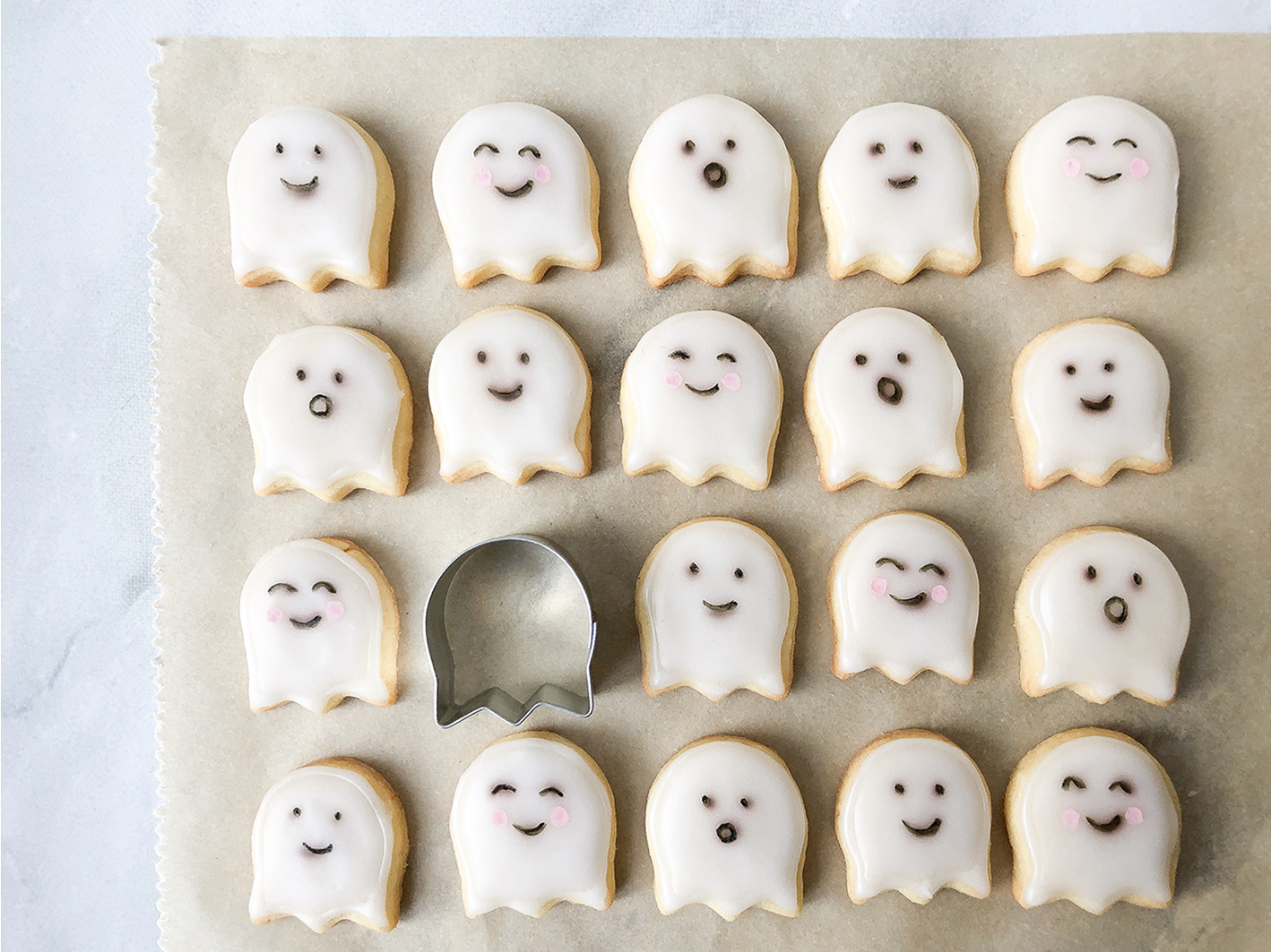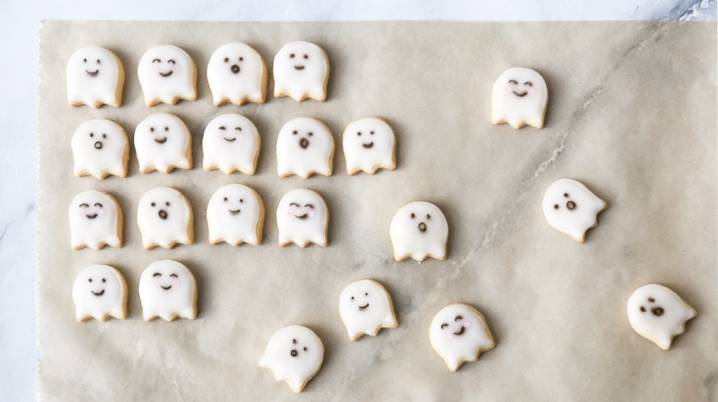 Nicht mehr lange und Halloween steht vor der Türe. Wenn ich ehrlich bin, feiern wir in der Familie den Tag nicht wirklich groß. Aber so ein bisschen Kürbis und Geisterstimmung darf dann doch sein. Somit durften weiße Baby Boo Kürbisse einziehen und natürlich wollte ich auch etwas backen. Nach langem hin und her wurden es am Ende Halloween Kekse in Form von Geistern. Da gibt es natürlich auch einegroße Anzahl von Ideen, diese umzusetzen. Ich habe mich dann letztendlich für diese Version entschieden: Ich habe eine Keksform in der Form einer Tulpe genommen und diese letztendlich auf den Kopf gedreht. Schon habt ihr die perfekte Geister-Form.