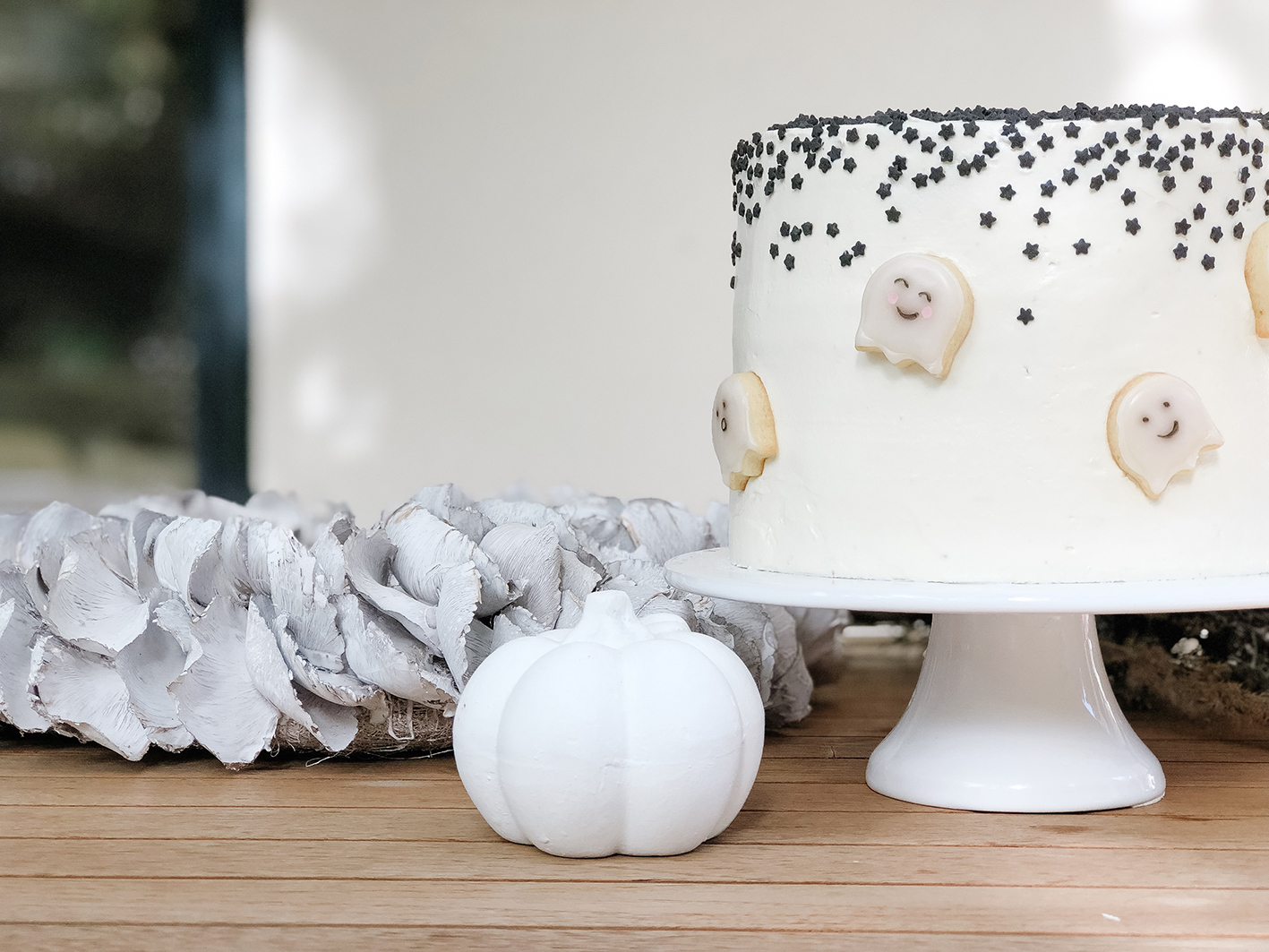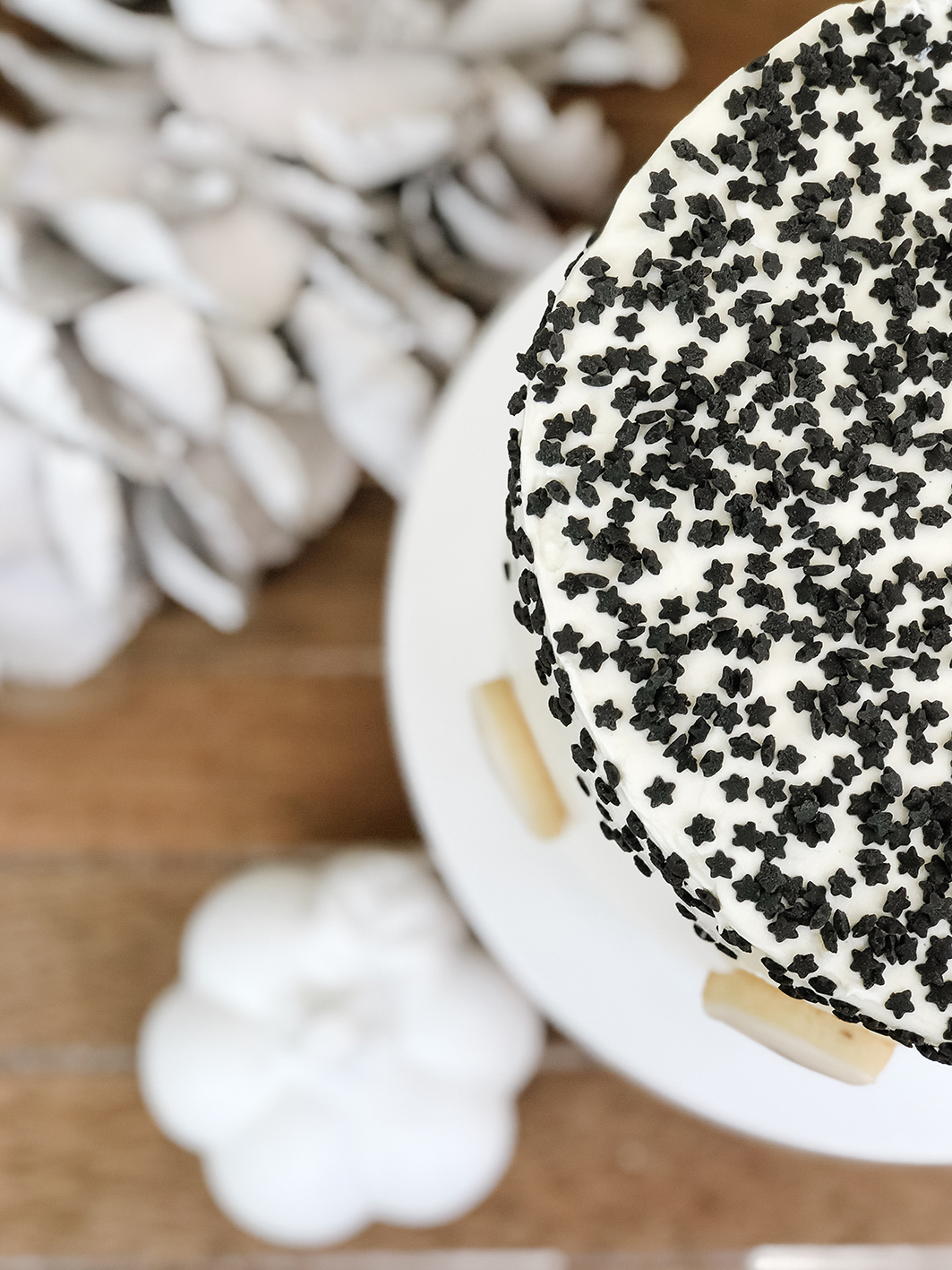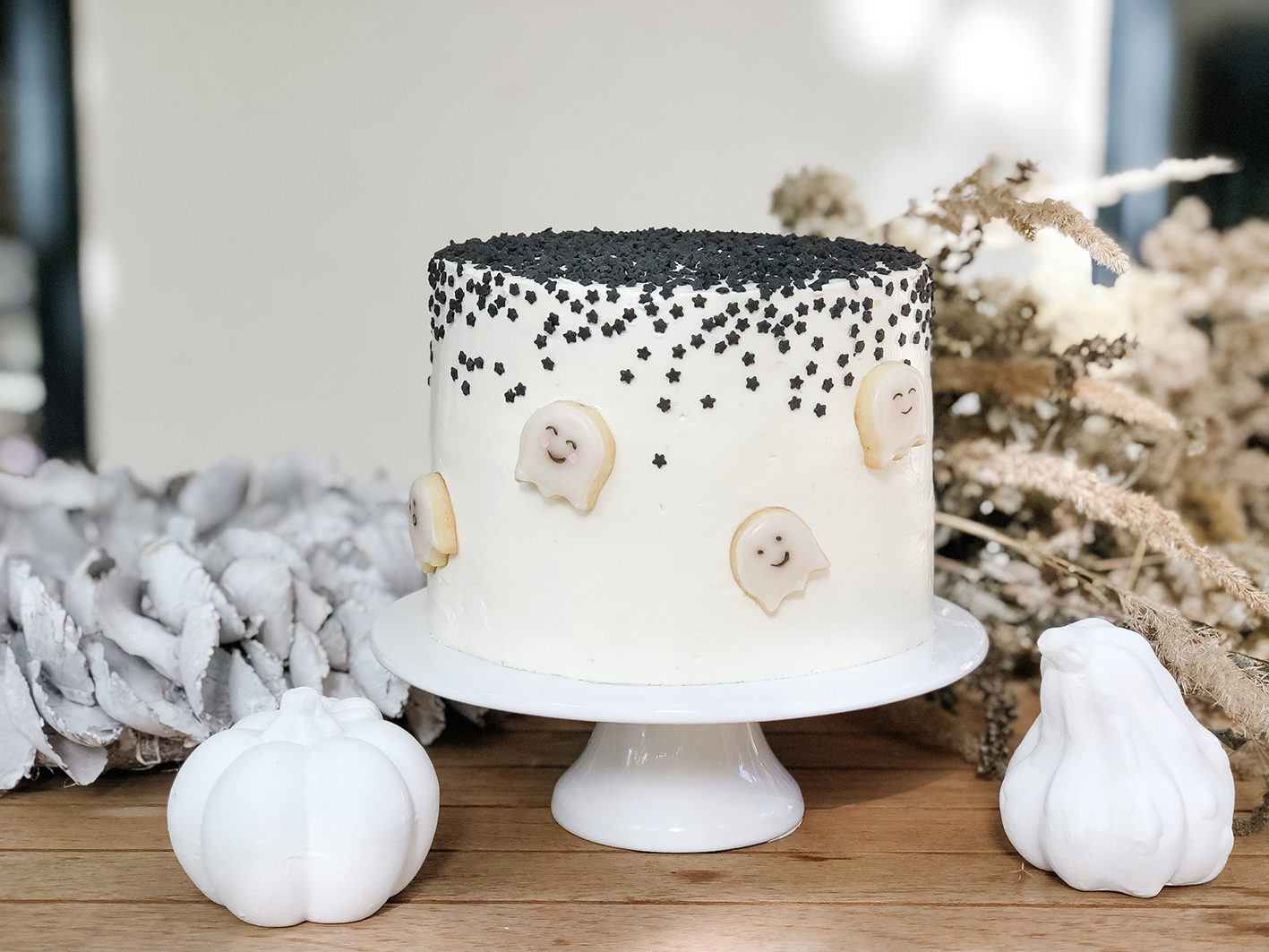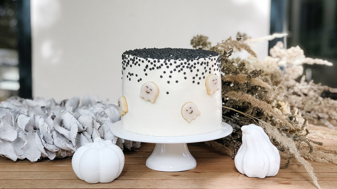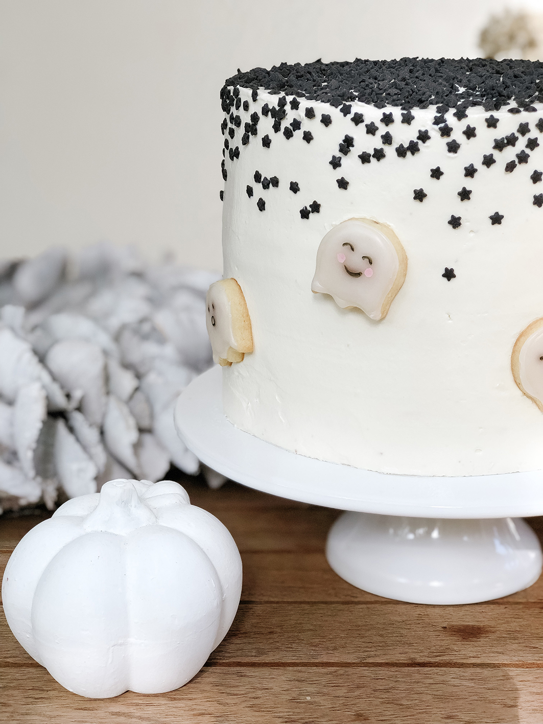 Im nächsten Schritt werden bei den Böden die Kuppen abgeschnitten und mit Frischkäsefrosting dazwischen aufeinander gelegt. Im Anschluss wird der Kuchen mit Hilfe einer Drehplatte komplett mit der Frischkäsecreme eingedeckt. Eine detailiertere Anleitung findet ihr übrigens hier. Als letzter Schritt werden dann die schwarzen Sterne darüber gestreut und die Geister angeordnet. Sieht der Anschnitt nicht fantastisch aus!?!?!