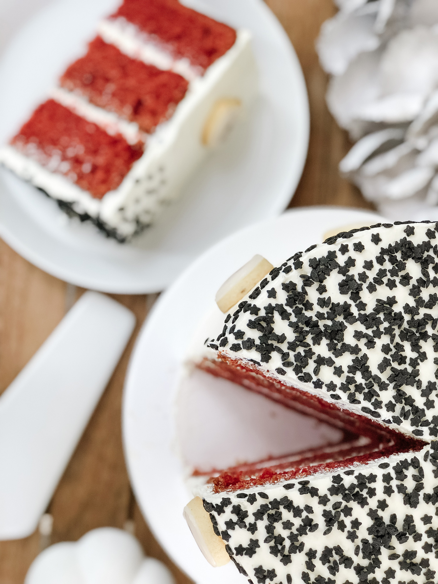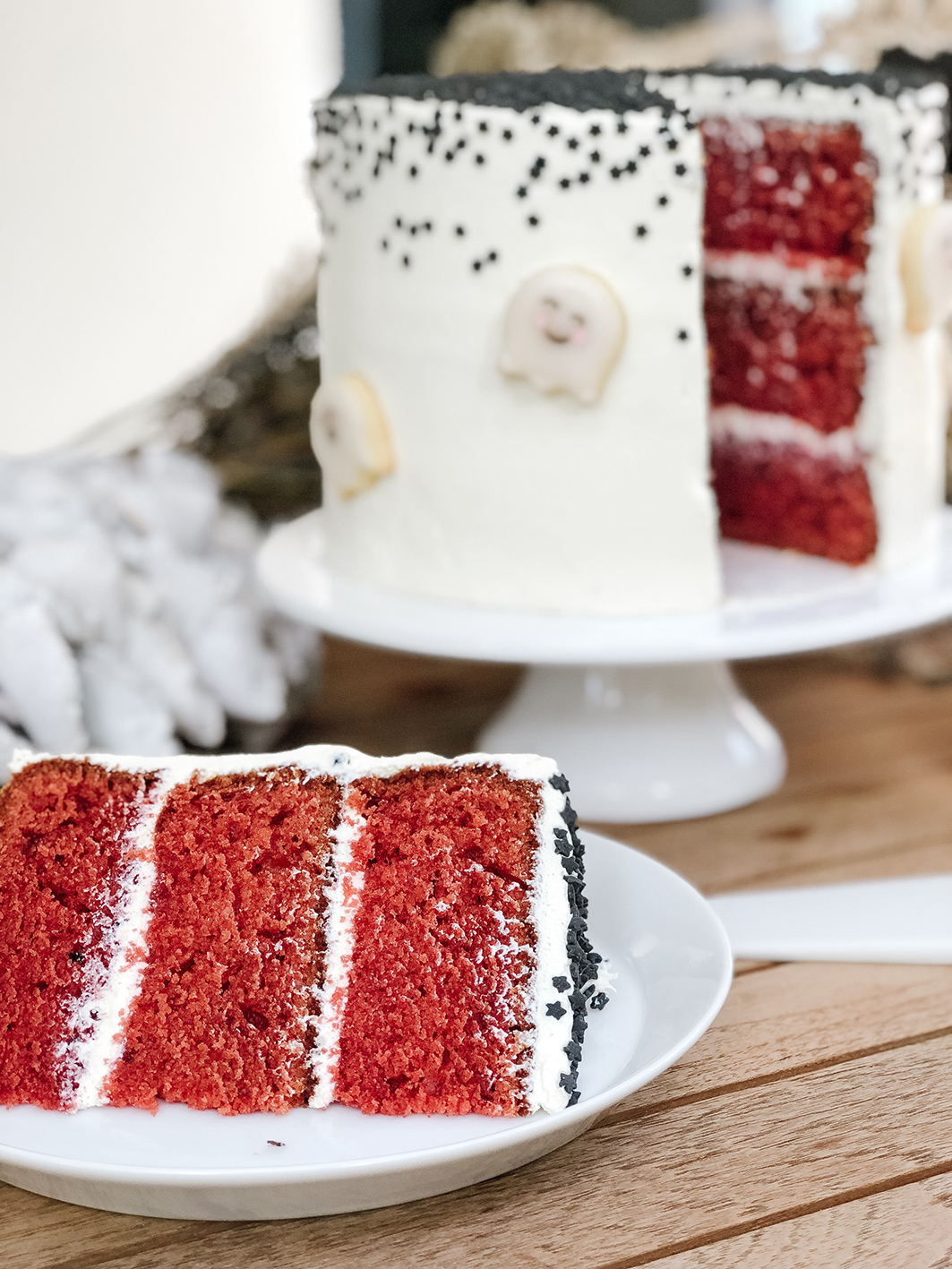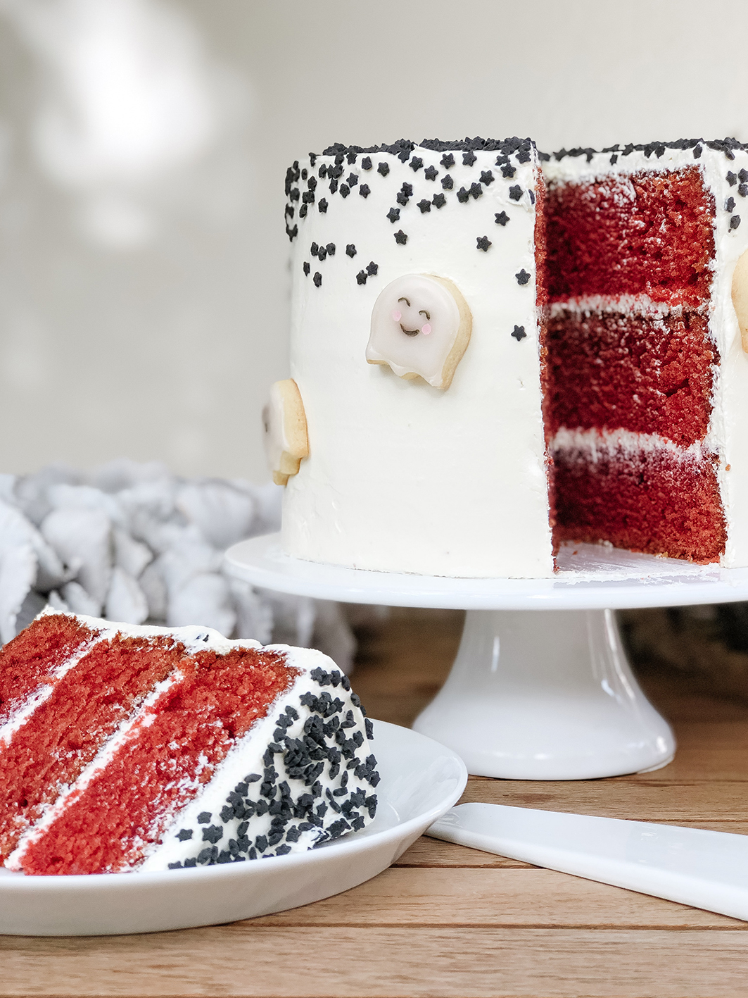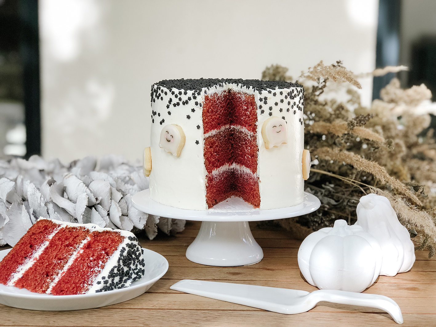 Dieser Red Velvet Cake, den ich für meine Halloween Torte gebacken habe, ist der wohl leckerste Kuchen überhaupt. Ich habe das Rezept das erste mal gebacke und die Böden wurden so saftig!! Den müsst ihr nachbacken. Der Grundgedanke war eigentlich der, dass ich unbedingt meine Halloween Kekse in Geister-Form weiterverwenden wollte. Also musst ein Kuchen her. Mit Halloween selbst verbindet man ja rotes Blut und die schwarze Nacht. Ich wollte aber keinen komplett schwarzen oder roten Kuchen backen. Also musste das Innenleben dafür herhalten. Da ein Red Velvet Cake ja eh so schön leuchtend rot ist, wollte ich solch einen endlich mal versuchen. Als Deko gab es ein Frischkäse-Frosting, schwarze Streusel in Sternenform und die süßen Keksgeister. Neben der Geister Kekse, die ihr hier nachbacken könnt, und den Streuseln braucht ihr: