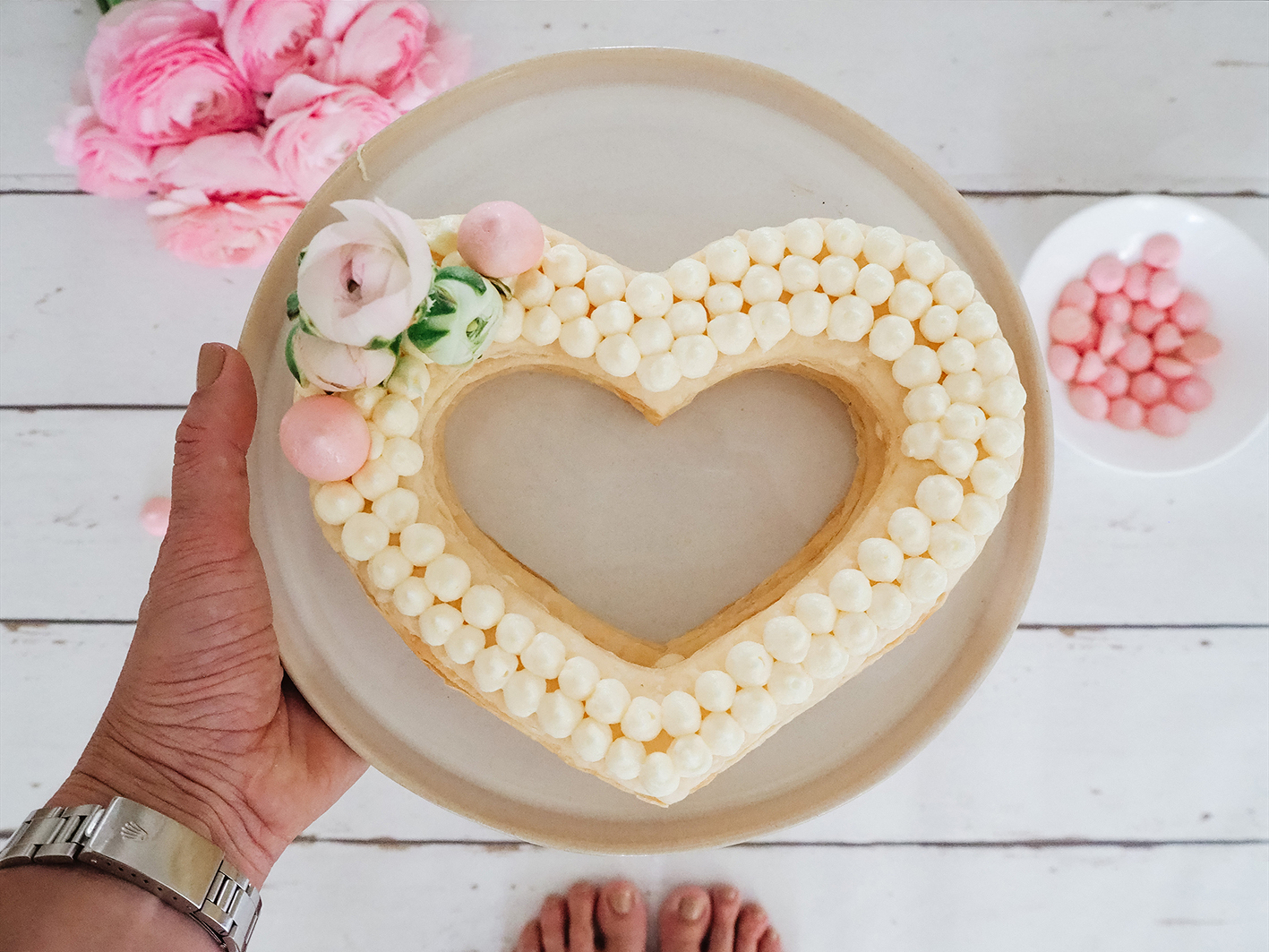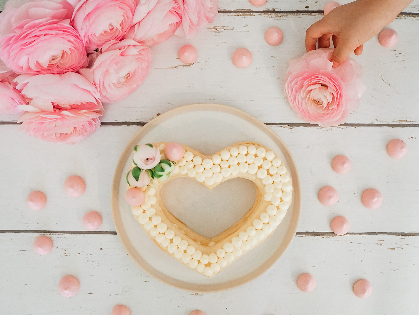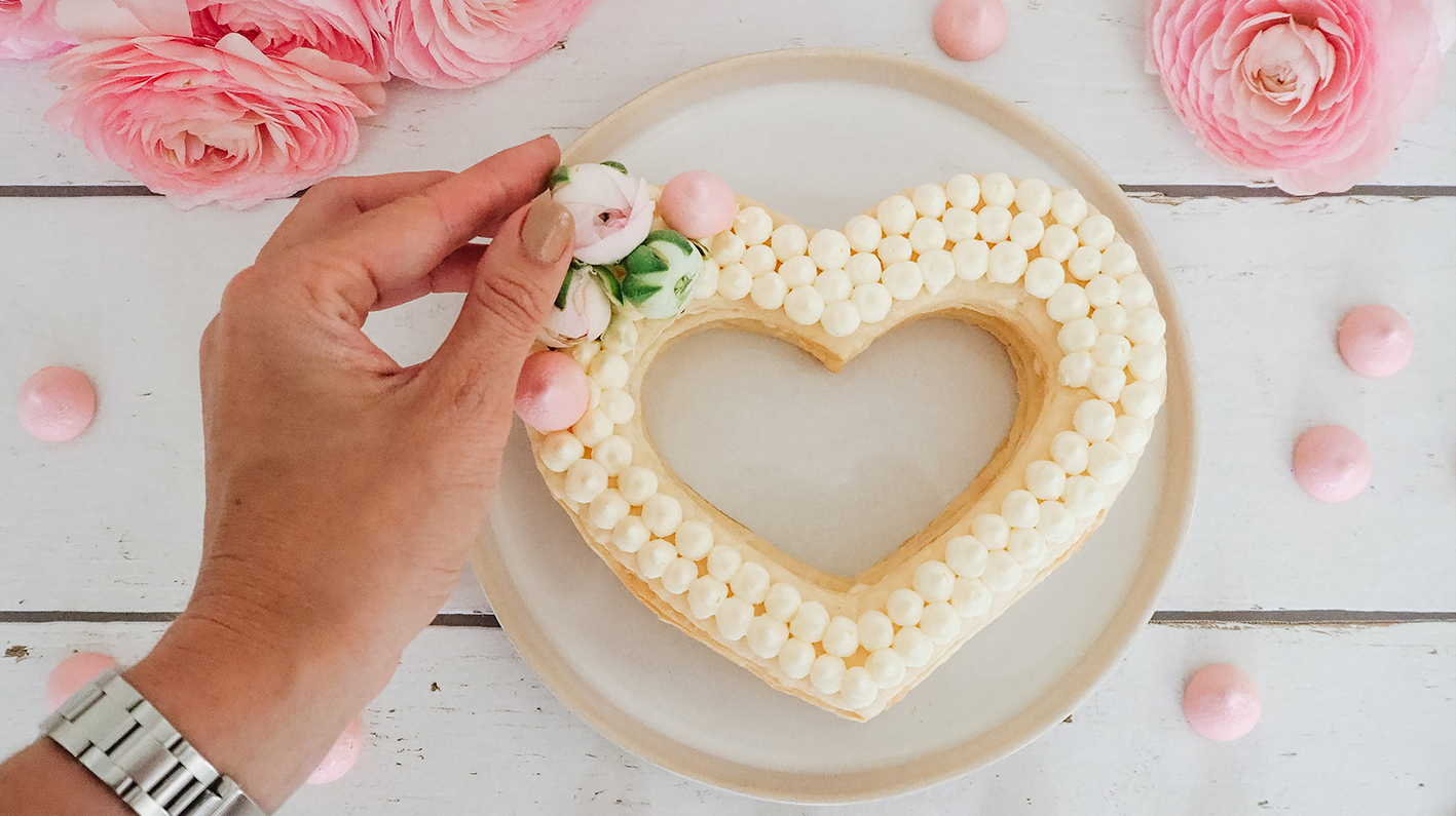 Füllt das Frischkäsefrosting in einen Spritzbeutel mit runder Öffnung und setzt auf beide Blätterteigherzen Frosting-Tupfen. Wenn beide fertig sind, setzt ihr ein Herz auf das andere. Nun könnt ihr den Kuchen für Muttertag nach Belieben dekorieren. Ich habe meine selbstgemachen Baiser und frische Ranunkeln genommen. Ich denke der Herzkuchen sollte auch für die Väter einfach machbar sein. Und für ganz eilige oder mit weniger Fingerspitzengefühl: Ihr könnt das Frischkäsefrosting auch mit einem Messer aufstreichen. Mir schmeckt der Kuchen am besten, wenn er gekühlt wurde. Dann ist das Frosting noch geschmackvoller. Einen tollen Muttertag euch!