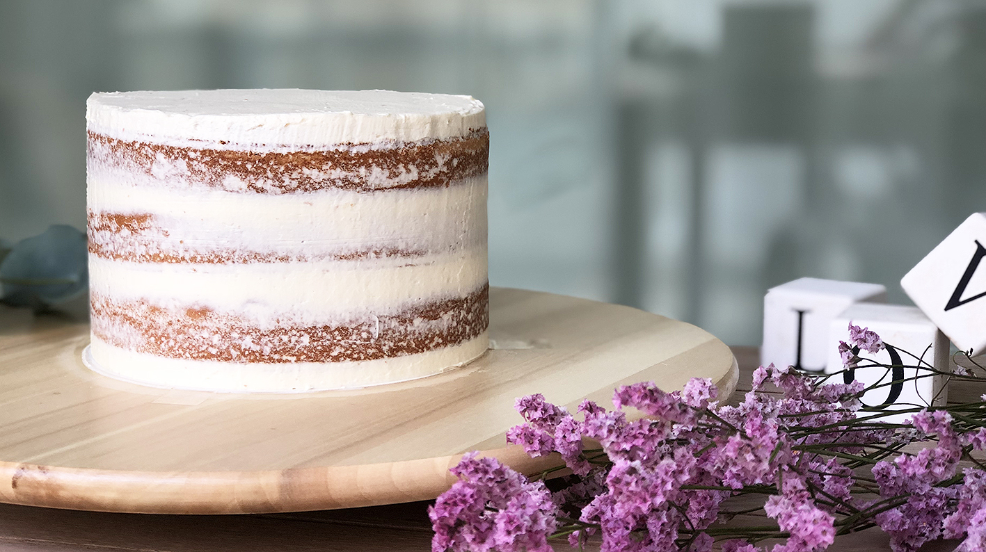 3: Wenn ihr einen Semi Naked Cake haben möchtet, nehmt den Teigschaber und kratzt die Buttercreme förmlich von der Seite wieder ab. Ihr könnt richtig am Kuchen entlang kratzen. Dreht dabei währenddessen die Platte. Um die Oberseite zu begradigen, verwendt erneut die Winkelpalette. Jetzt ab in den Kühlschrank, in den Keller oder auf den Balkon (im Winter) und ca. 15 Minuten kühlen. Anschließend könnt ihr die Löcher mit etwas Buttercreme auffüllen und die Oberfläche erneut glätten. Fertig!