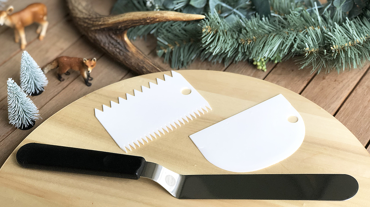 Zunächst benötigen ihr unbedingt einen Drehteller. In den Geschäften findet ihr ganz unterschiedliche, aber ich liebe diese hölzerne SNUDDA-Platte von Ikea. Sie ist wirklich praktisch, sieht hübsch auf Fotos aus (ihr könnt sogar den Kuchen darauf lassen und ihn so servieren) und ihr könnt ihn sogar noch für etwas anderes verwenden, wenn sie gerade nicht zum backen benötigt. Dann braucht ihr einen Teigschaber aus Kunststoff oder Metall mit gerader Kante, wie rechts auf dem Bild (zum Beispiel diesen hier von Dr. Oetker). Der hilft, die Außenseite des Kuchens richtig zu glätten. Für einen Spezialeffekt könnt ihr einen Teigschaber mit Zickzack-Kante verwenden (so wie ich es hier bei der Taufe gemacht hatte). Last but not least eine große Winkelpalette. Wenn ihr diese Tools habt, seid ihr schon mal gut gerüstet.
