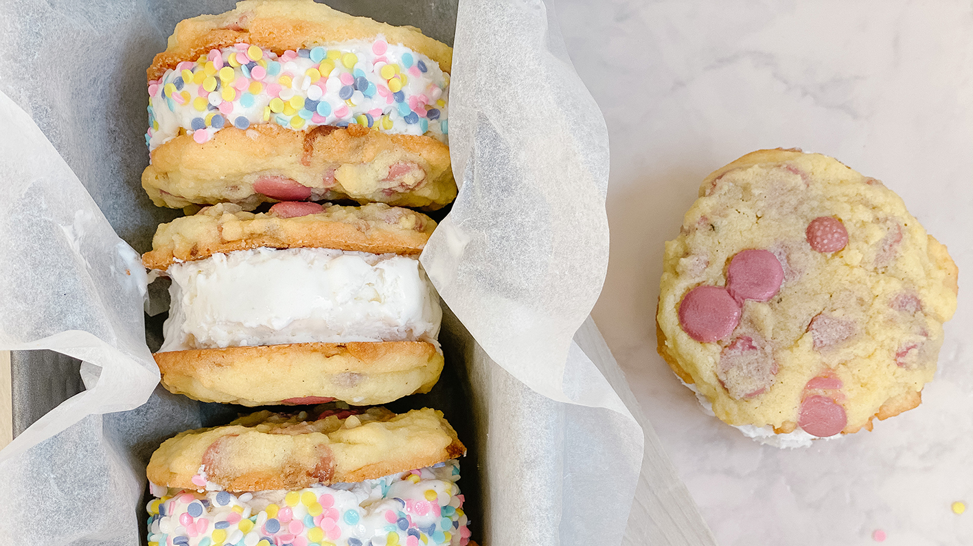 Am Besten stellt ihr die Cookies für 1 Stunde in das Gefrierfach, dass sie richtig kalt sind. Danach nehmt ihr euch eine Kugel Eis, gebt diese auf einen American Cookie und setzt einen zweiten oben drauf. Wenn ihr alle Ice Cream Cookie Sandwiches fertig habt, stellt diese wieder in die Gefriertruhe und bereitet die Streusel vor. Die gebt ihr einmal rundherum auf das Eis der Sandwiches. Danach geht es gleich wieder ab in das Gefrierfach bis zum Verzehr.