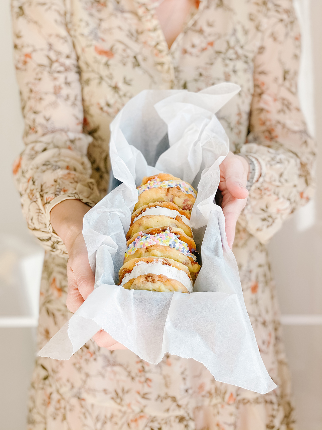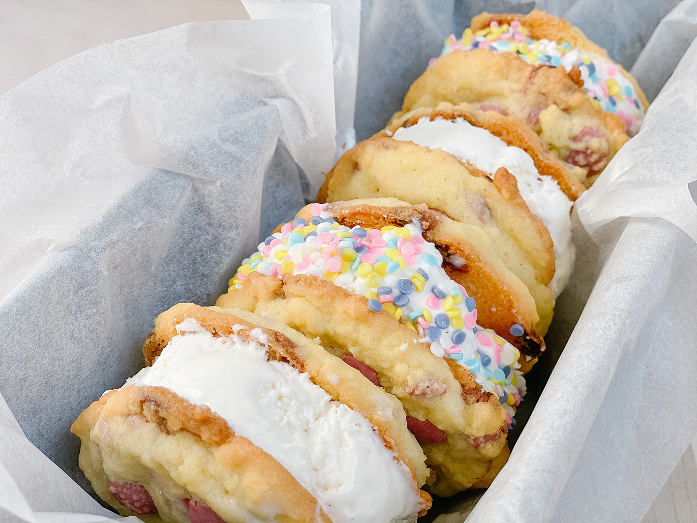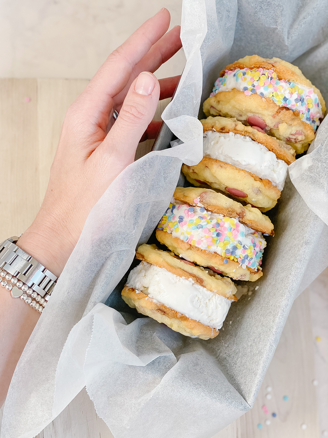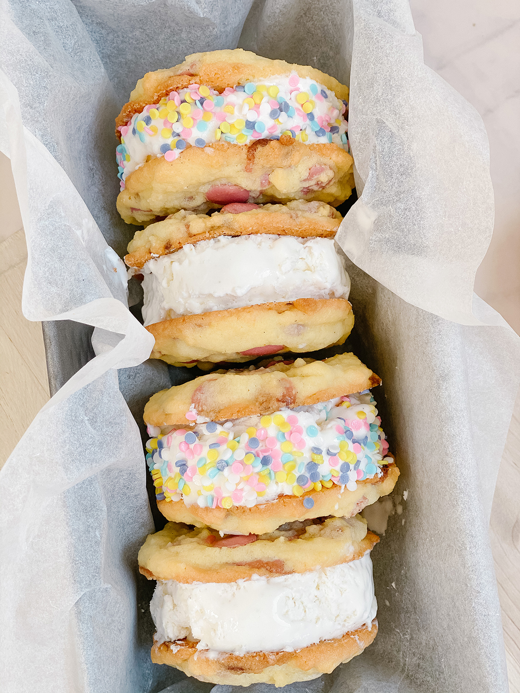 Das Eis ist sozusagen die Vanilleeis-Basis, die ihr bestücken könnt, wie ihr mögt. Alles an Obst, Schokostückchen, Kekse oder nach was euch immer ist. Die Streusel müsst ihr natürlich nicht verwenden. Alternativ könnt ihr aber die Ice Cream Cookie Sandwiches zur Hälfte in geschmolzene Schokolade tauchen. Die Menge an Eis und Cookies ergaben bei mir 8 Ice Cream Sandwiches. Aber das hängt natürlich von der Größe der einzelnen Cookies ab.