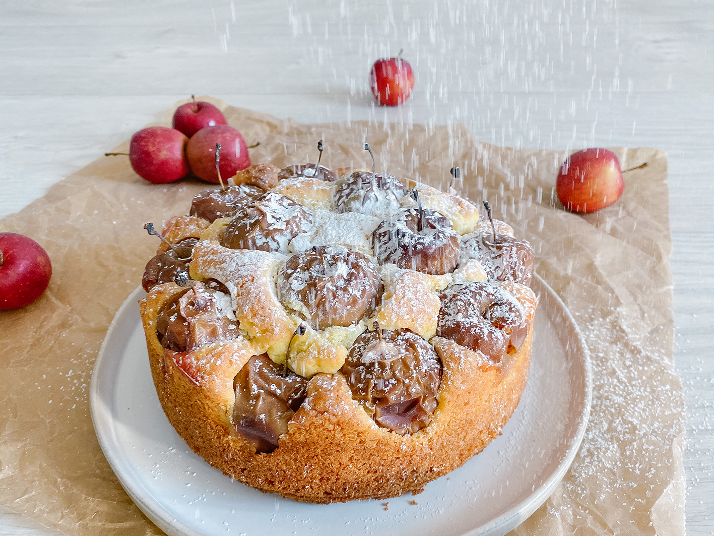 Die Zubereitung ist denkbar einfach. Ihr mischt einfach alle Zutaten, bis auf die Äpfel, in einer Rührschüssel zu einem glatten Teig. Bei der Milch müsst ihr selber sehen, wie viel ihr letztendlich benötigt. Der Teig sollte nicht zu dick, aber auch nicht zu dünnflüssig sein. Fettet danach eure Springform für den Apfelkuchen ein und füllt den Teig in die Form. Darauf gebt ihr die kleinen Äpfel und drückt sie leicht in den Kuchenteig. Nun darf der Kuchen für ca. 45-50 Minuten bei 175 Grad in den Ofen. Wenn er fertig und abgekühlt ist, könnt ihr noch etwas Puderzucker darüber streuen.