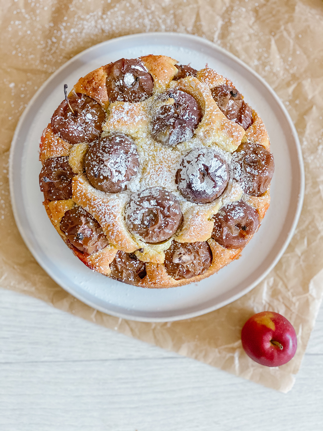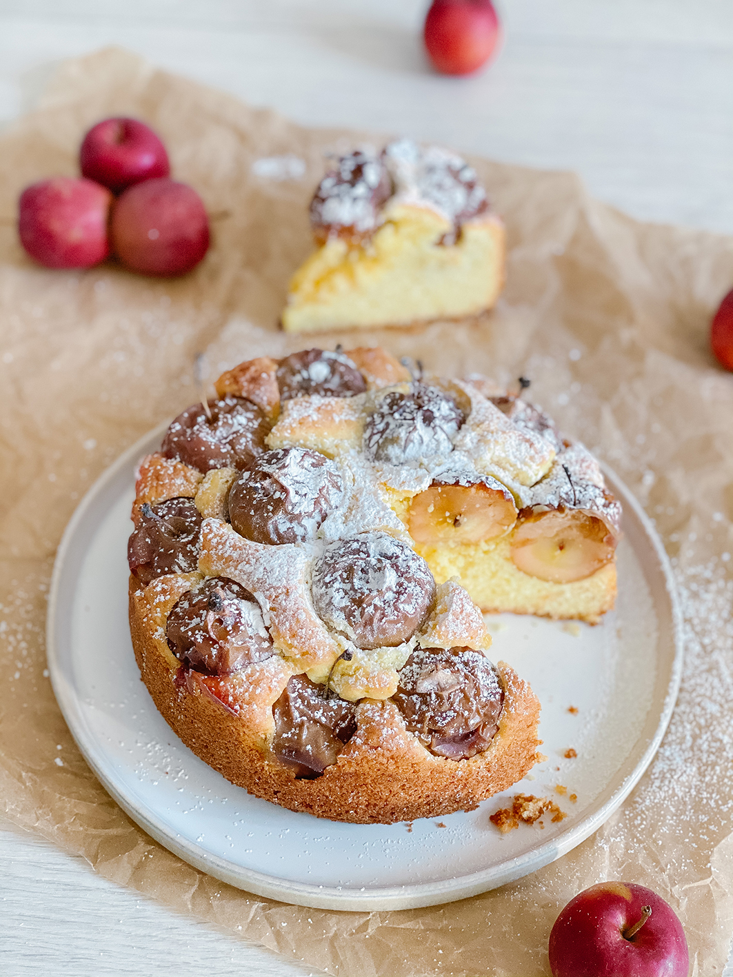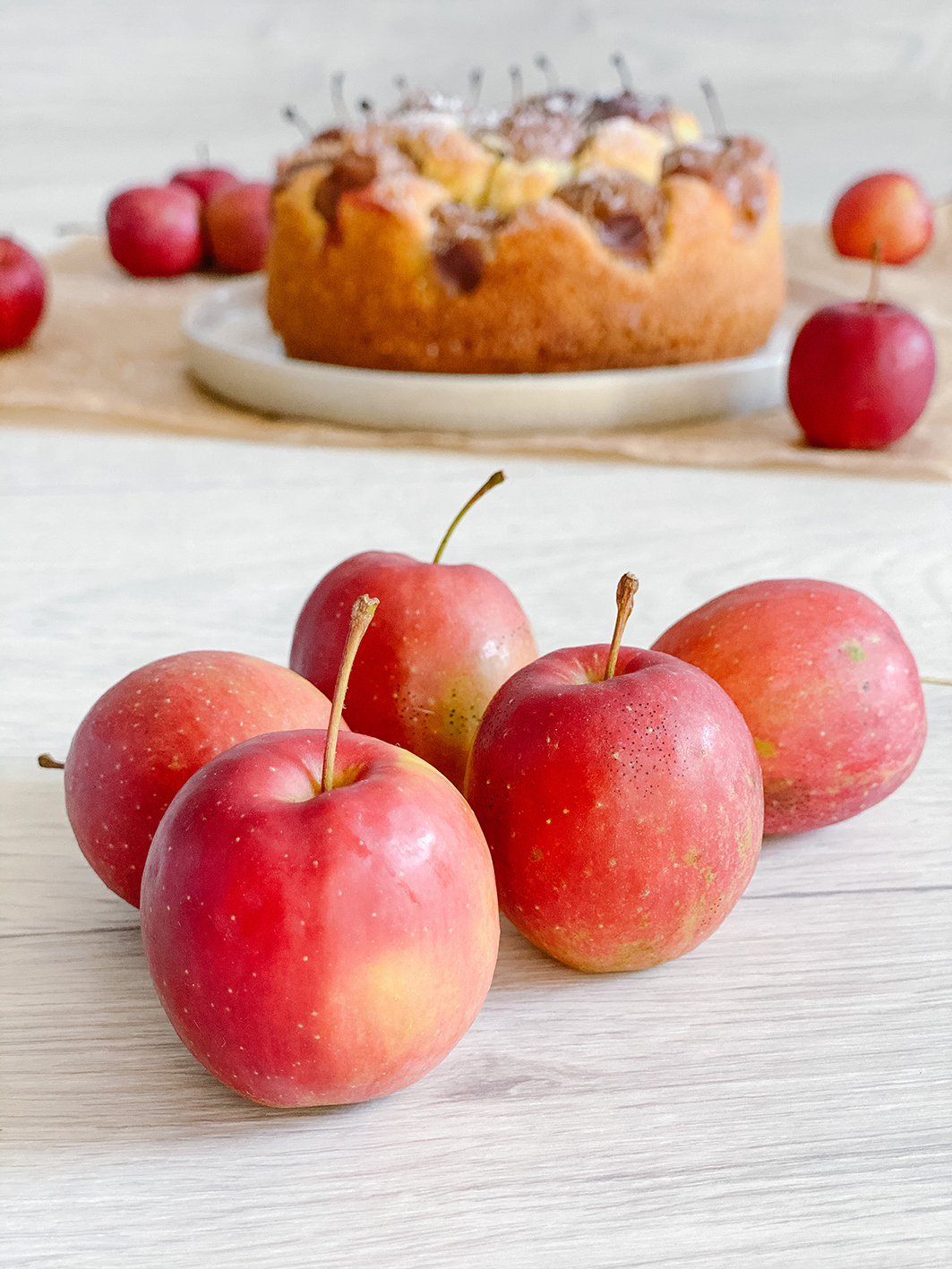 Ich habe eine Backform mit 18cm Durchmesser genommen, meine Mama dagegen nutzt z.B. immer eine Form mit 26cm Durchmesser. Theoretisch geht beides. Je größer die Form, desto flacher wird der Apfelkuchen. Zum Fetten der Form nehme ich immer Butter und gebe Semmelbrösel in die Form. Wenn ihr keine kleinen Äpfel habt oder das Kerngehäuse nicht mögt, könnt ihr auch geschälte und halbierte Äpfel nehmen. Die ritzt ihr am besten oben etwas ein. Somit gelangt mehr Luft in die Äpfel und sie werden weicher. Übrigens findet ihr die hübschen Teller bei motel a miio. Die sehen auch wunderbar als Tortenplatte aus.