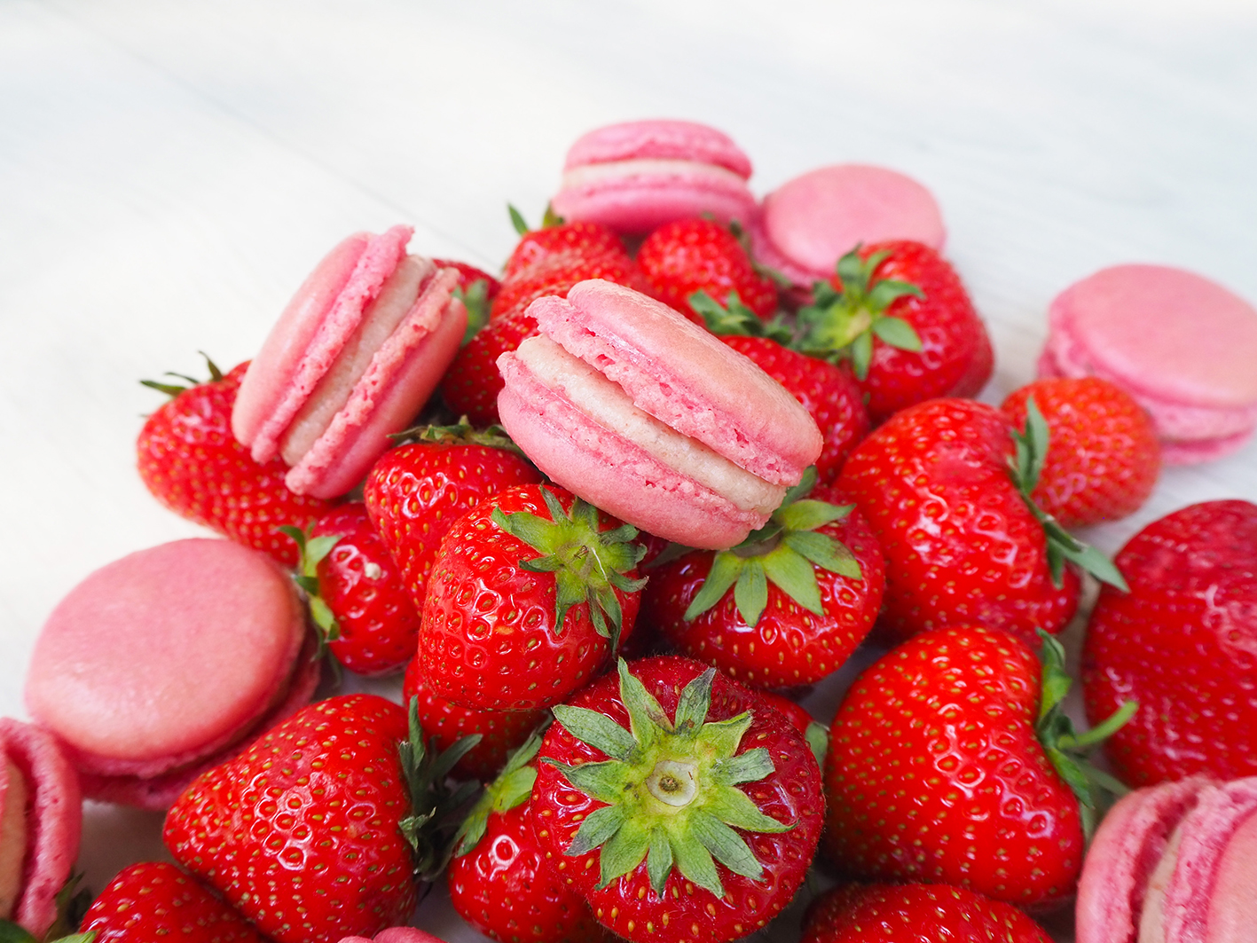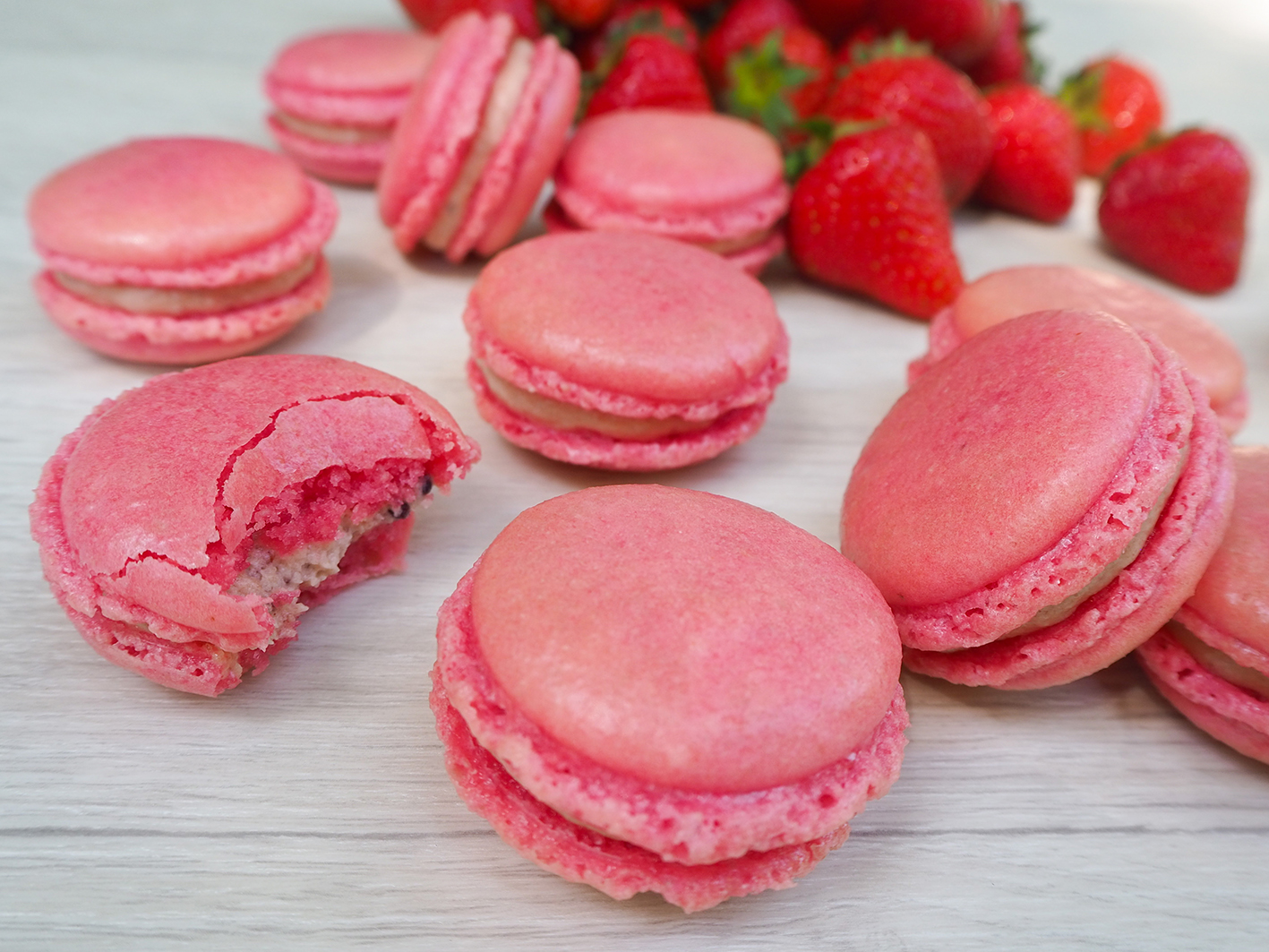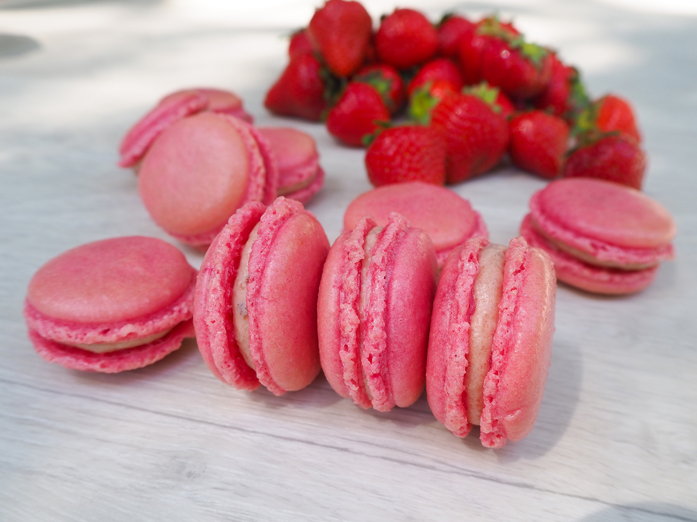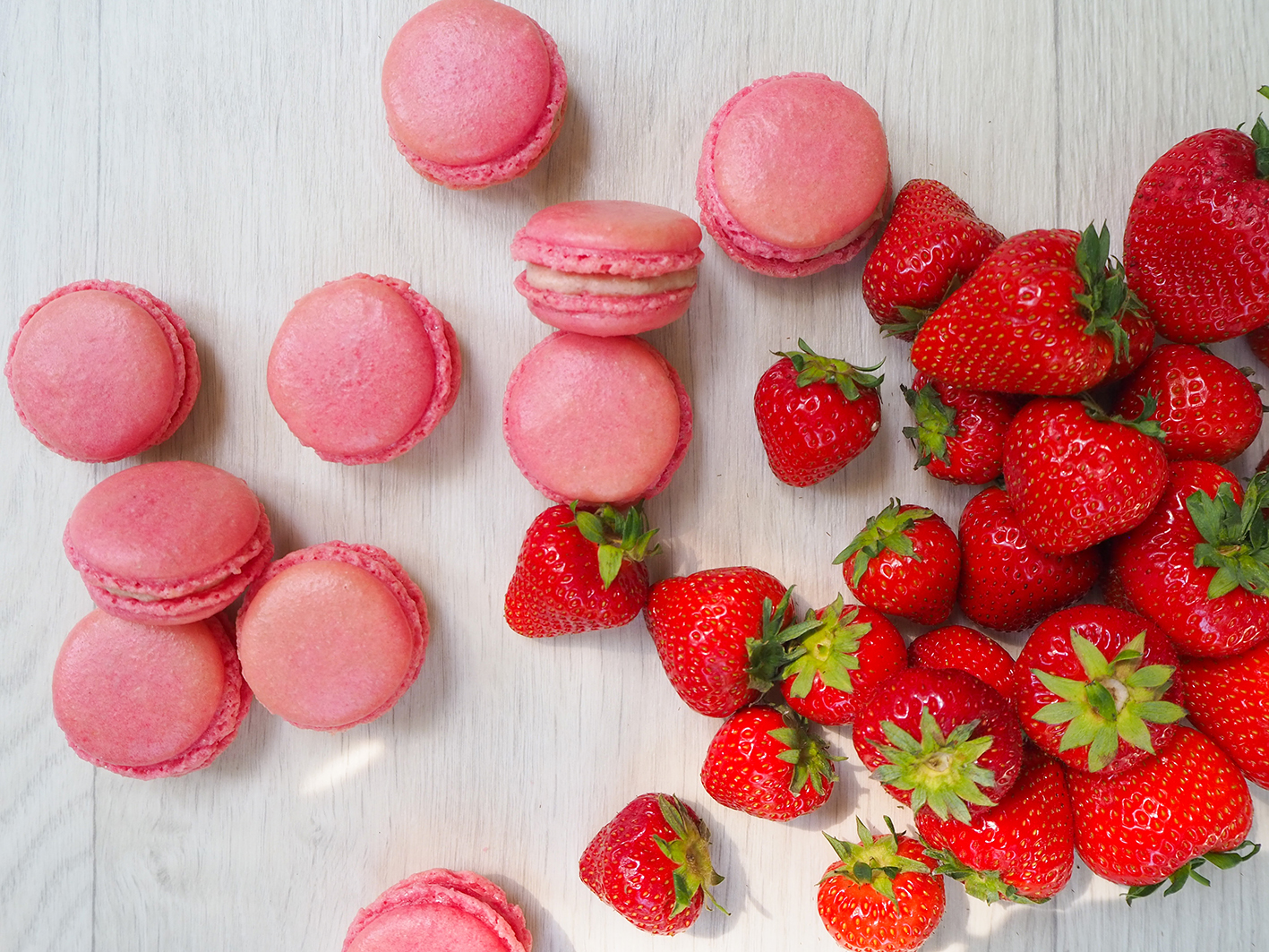Für die Füllung der Macarons mischt ihr die Zutaten mit einem Küchengerät zusammen. Je nach Geschmack könnt ihr etws mehr oder weniger Erdbeeren nehmen. Falls die Füllung zu flüssig wird, nehmt einfach noch ein wenig mehr Puderzucker dazu. Die Masse spritzt ihr nun auch mit einem Spritzbeutel vorsichtig auf eine Macaron-Hälfte und setzt dann eine zweite darauf. Ihr könnt aber auch reine Marmelade als Füllung nehmen. Da könnt ihr schalten und walten, wie ihr mögt.