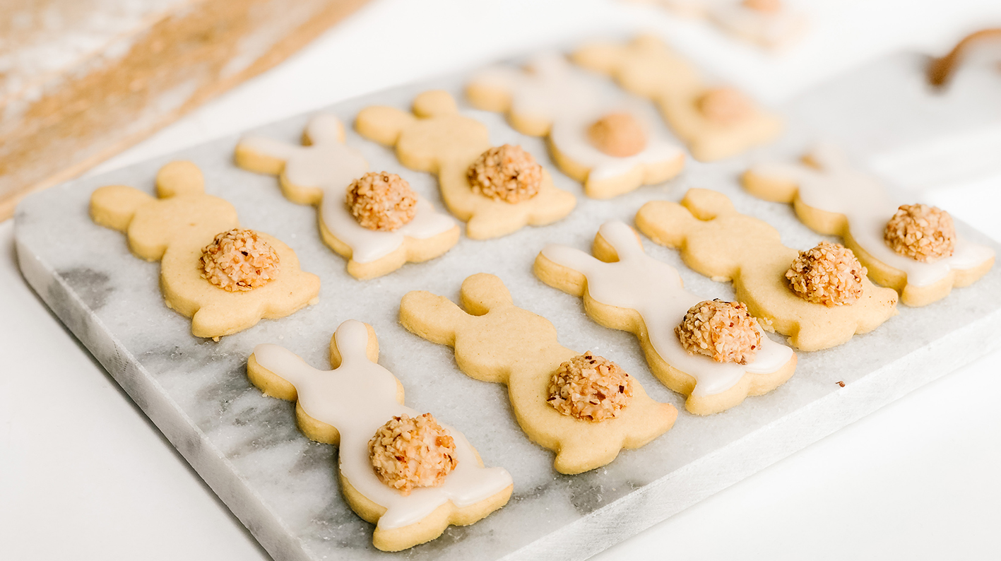Simply whisk all the ingredients into one dough and knead by hand if necessary. Best is to cool the short pastry in the fridge for about 30 minutes. If it is urgent you can also continue without the fridge. Dust the work surface with a little bit of flour, roll out the dough about 3mm thick and cut out the Easter bunnies with the cookie cutters. Put a sheet of baking paper on a baking tray and place it in the oven at 180 degrees for about 10 minutes.