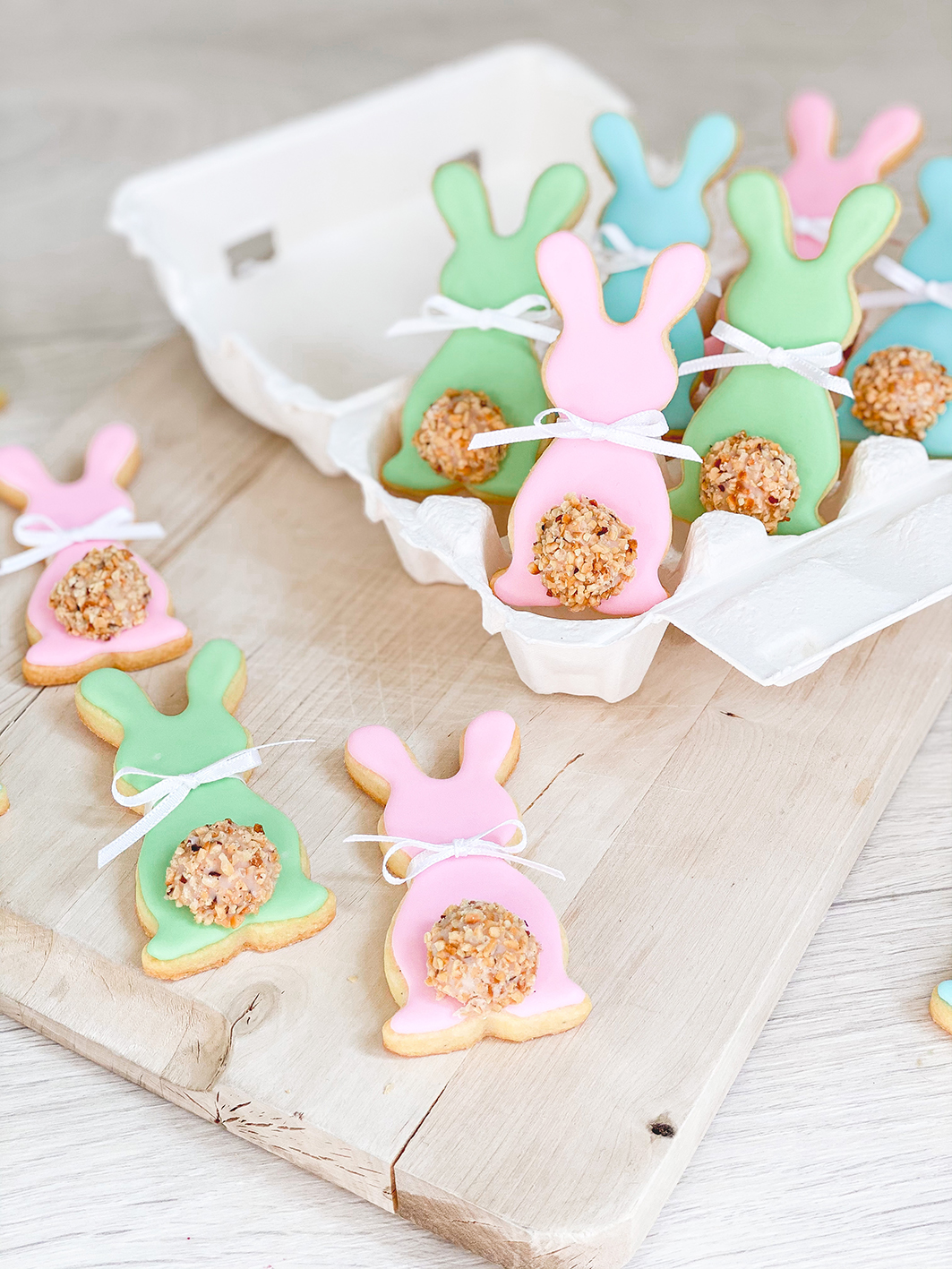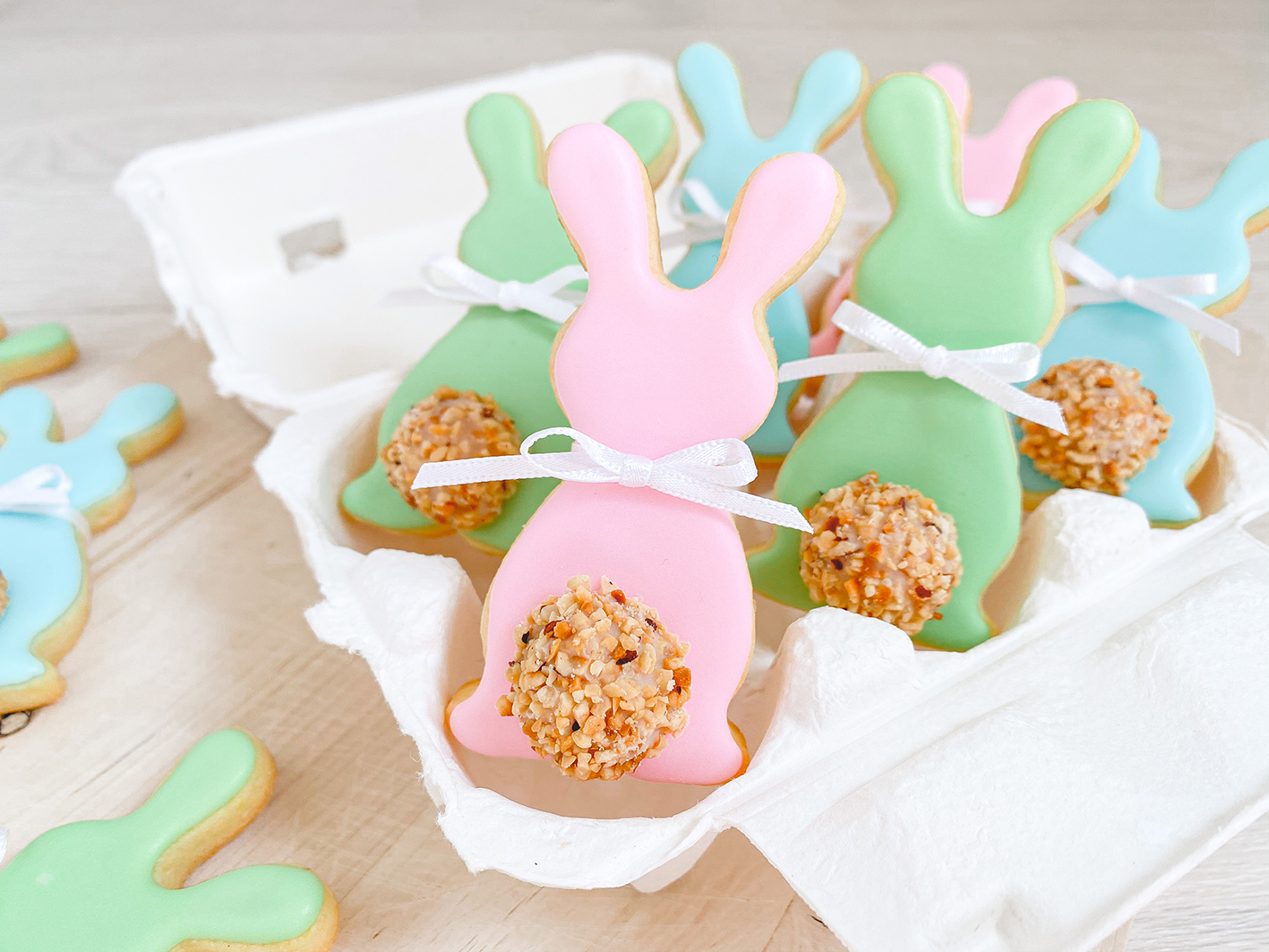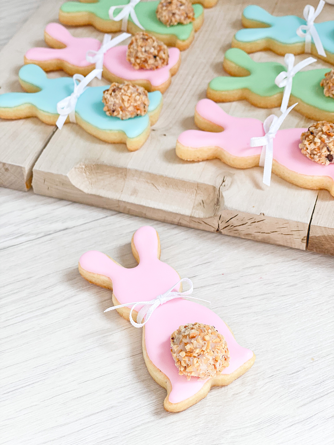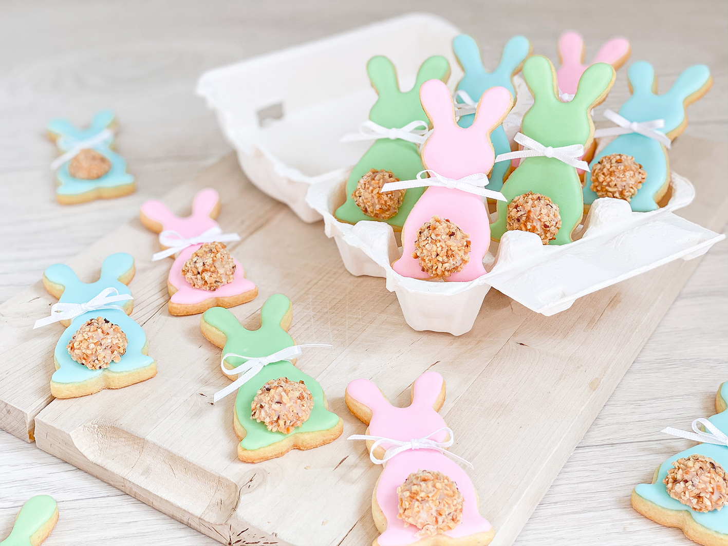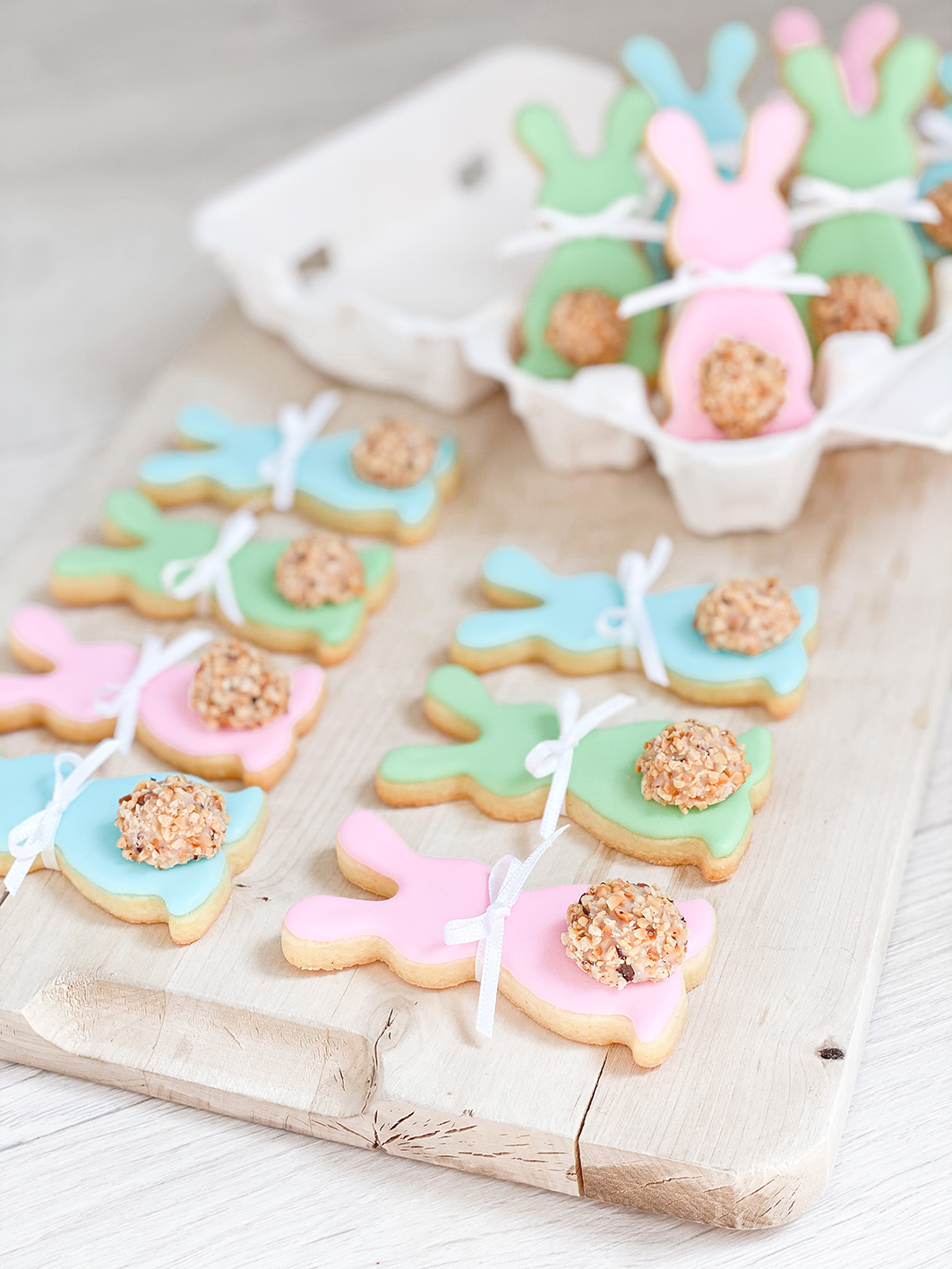 Füllt das Royal Icing nun in einen Spritzbeutel mit einer Spritztülle. Die Spritztülle sollte eine kleine, runde Öffnung haben. Oder ihr nehmt einen kleine Spritzflasche, die mag ich persönlich sogar lieber. Spritzt nun zuerst die Aussenkontur auf den Kekse und füllt diesen dann aus. So habt ihr eine schöne Kontur und es verschwimmt euch nichts. Lasst die Kekse dann über Nacht trocknen und klebt dann jeweils ein halbiertes Giotto mit einem kleinen Klecks Royal Icing auf die Osterhasen Kekse. Wer mag, darf den Hasen jetzt noch eine kleine Schleife um den Hals binden.