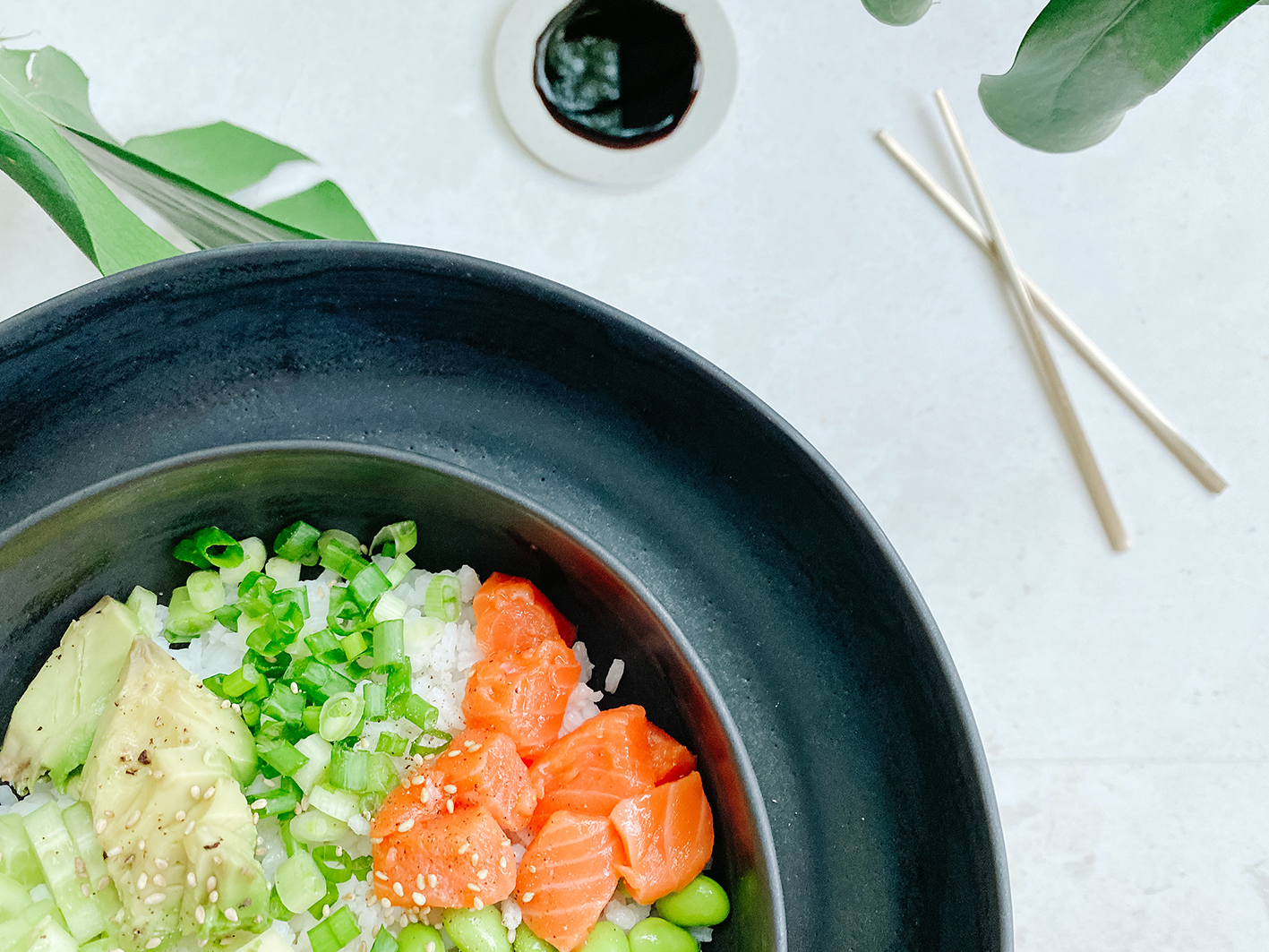 Eine Poké Bowl zuzubereiten ist denkbar einfach. Zuerst den Reis waschen, nach Packungsanleitung kochen und im Anschluss abkühlen lassen. Danach Lachs entgräten, Haut entfernen und in Würfel schneiden. Restliches Obst und Gemüse schälen, klein schneiden und die Sojasauce mit den Sesamsamen vorbereiten.