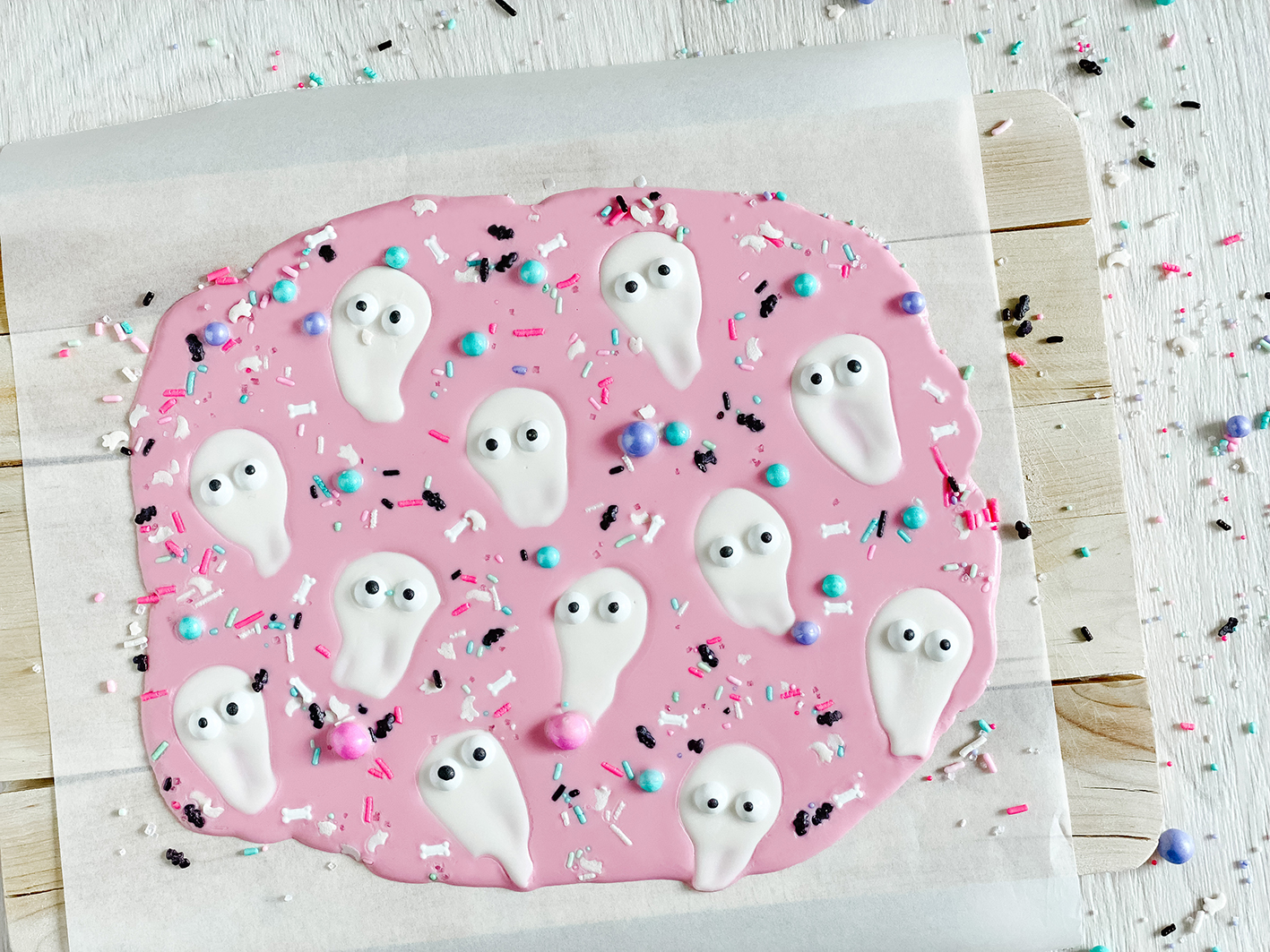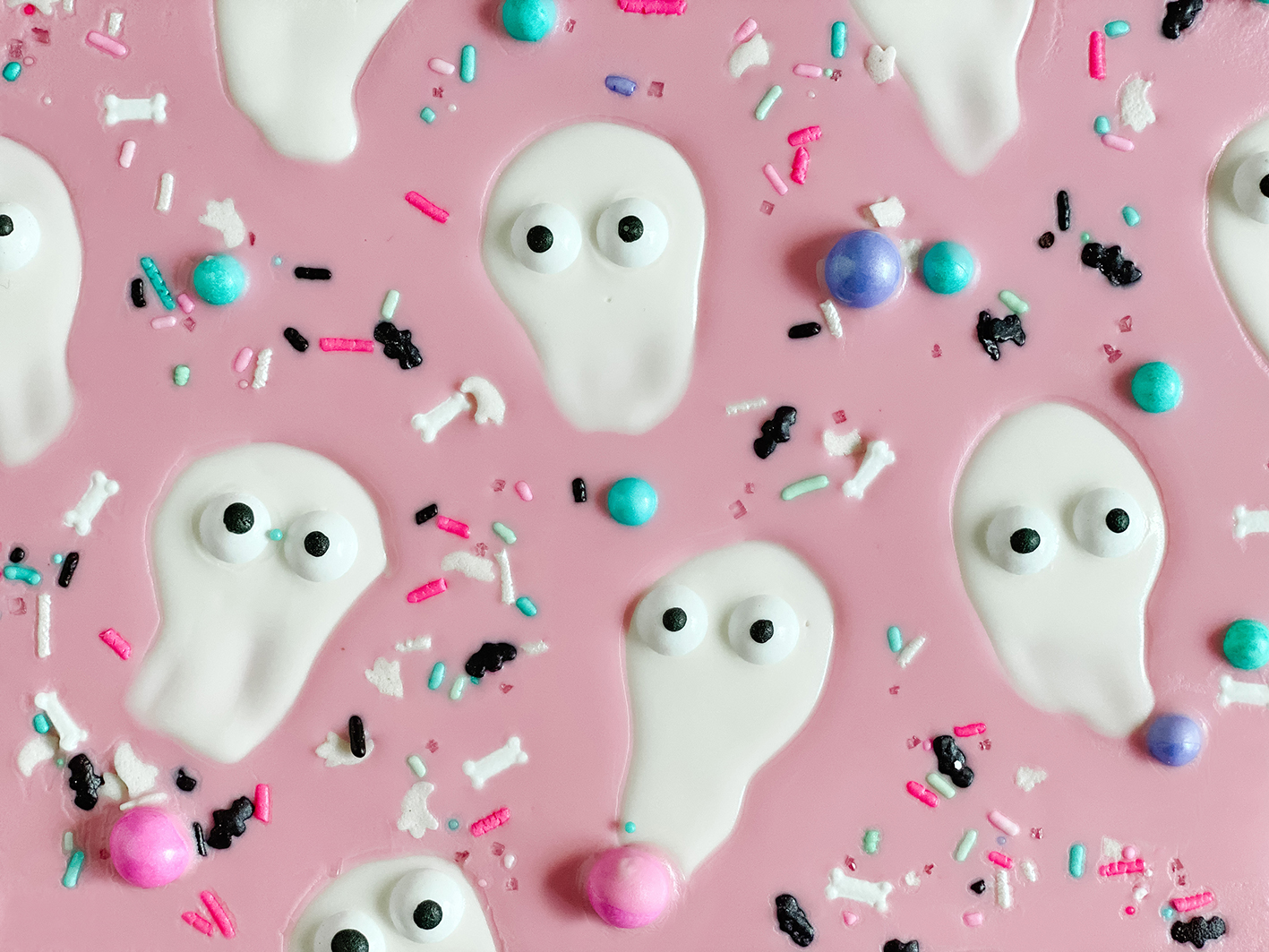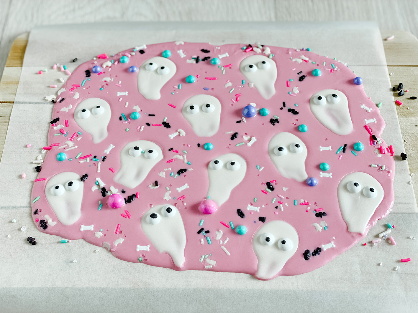 Im nächsten Schritt könnt ihr euch um die Geister kümmern. Entweder bereitet ihr die Geister vorher schon zu, so wie hier im Beitrag beschrieben und legt diese vorsichtig darauf. Oder aber ihr schmelzt die weiße Schokolade und füllt sie in einen Spritzbeutel mit kleiner Öffnung. Damit spritzt ihr vorsichtig Kleckse auf die Rosa Schokolade. Nehmt dann einen Löffel und fahr mit dem Stiel vorsichtig von der Mitte des Kleckses nach unten, um die typische Geisterform zu erhalten. Danach setzt ihr die Zuckeraugen in die Geister und dekoriert den Rest der Schokolade noch schön mit Streuseln. Entweder ihr organisiert euch dafür einen Halloween- Streuselmix (z.B. den hier von Super-Streusel) oder ihr mischt einfach farbige Streusel eurer Wahl zusammen.