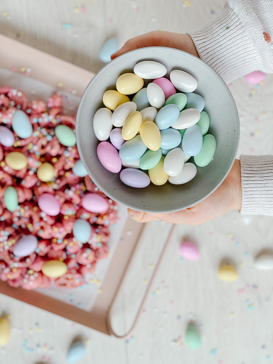 - pastellfarbene Schokoladeneier (oder Schokomandeln)