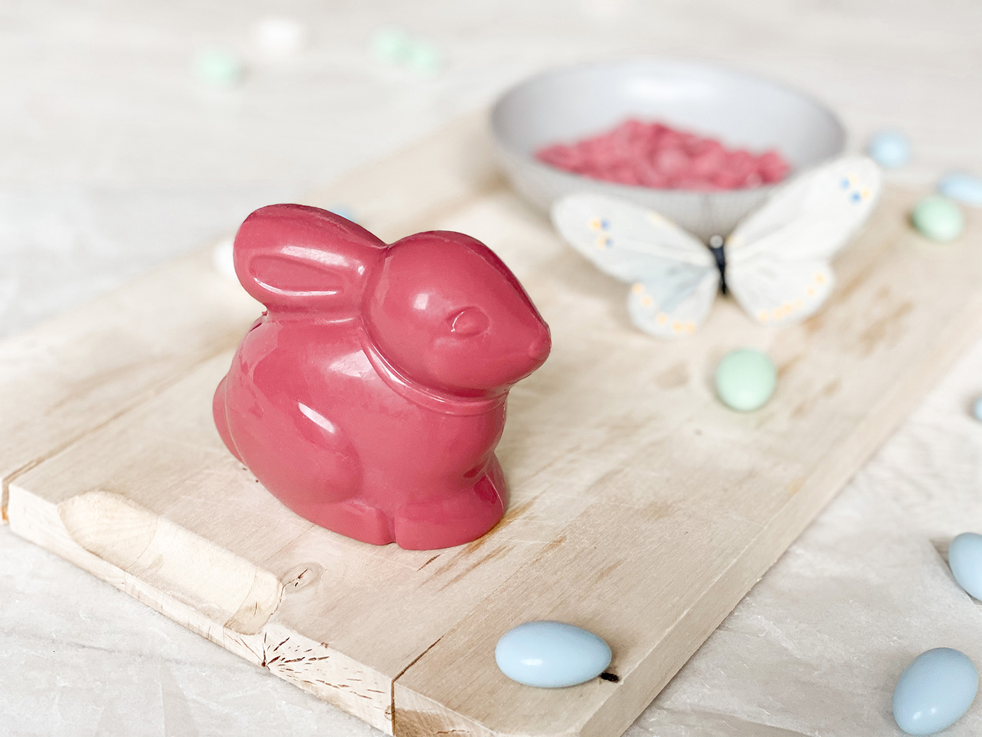 2. Nehmt nun die Hasenform und gebt die geschmolzene Schokolade hinein. Die Form schwenkt ihr jetzt so lange hin und her bis die Form komplett mit einer dünnen Schicht Ruby Schokolade überzogen ist und gebt sie für 5 Minuten in das Tiefkühlfach.