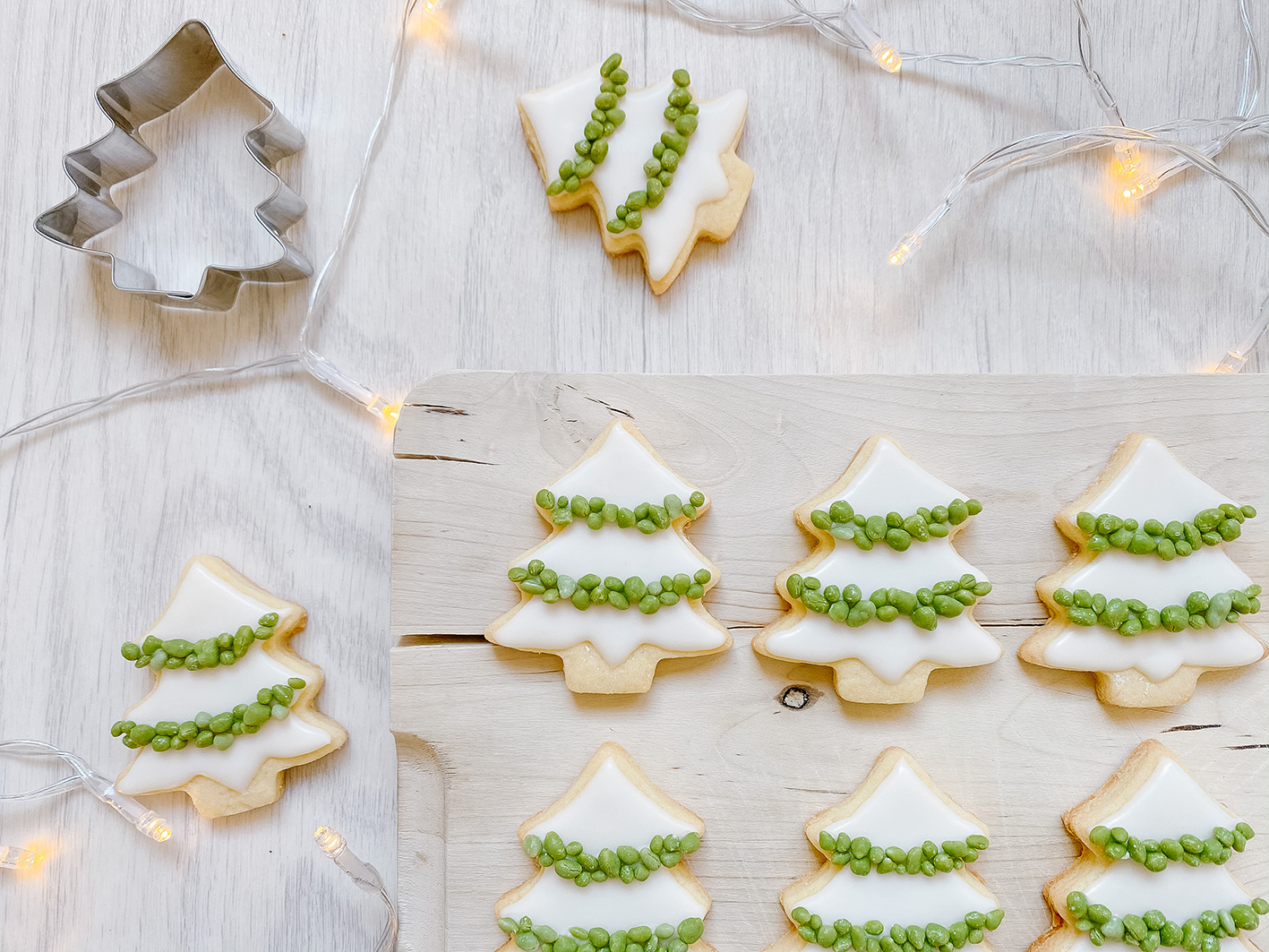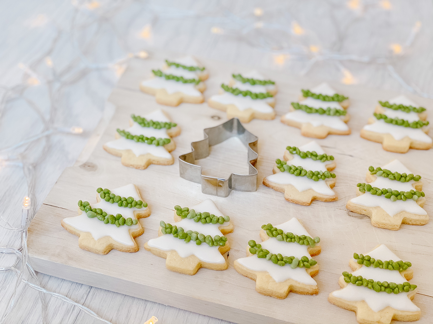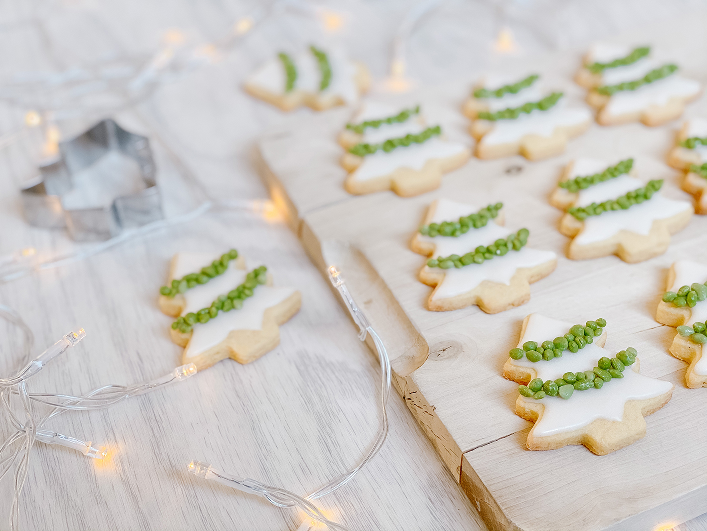 Tannenbaum Kekse dürfen neben den Eisbärenkeksen an Weihnachten natürlich auch nicht fehlen. Das gehört einfach dazu, wie der Christbaum zu Weihnachten. Während die Kinder als Dekoration Schokolade und bunte Streusel bevorzugen, geht es bei mir eher clean und ruhig zu. Mein absoluter Favorit ist noch immer das Royal Icing, auch Eiweißspritzglasur genannt. Als weitere Deko gab es hier grüne Streusel. Das hatte opitsch ein bisschen was von verschneiten Tannenbäumen.
