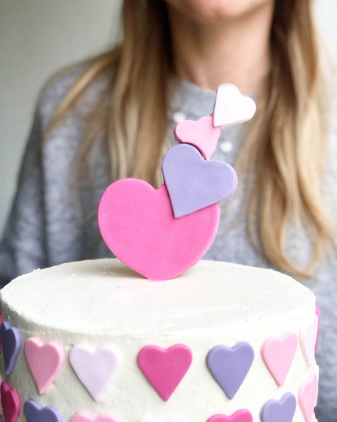 Letzter Schritt sind die Fondantherzen. Erst mal den Fondant warm kneten und ausrollen. Verwendet dann den Ausstecher, um die Fondant-Herzen auszustechen. Normalerweise kleben diese von alleine an der Buttercreme. Ist die Buttercreme zu kalt und somit dann zu hart, gebt etwas Wasser auf die Rückseite der Fondantherzen und setzt sie auf den Kuchen. Wenn ihr möchtet, könnt ihr noch einen Caketopper machen. Ich habe einige Fondantherzen in verschiedenen Farben und Größen angeordnet und auf einen hölzernen Schaschlikspieß aufgespießt. Den Caketopper bereitet man besser schon ein paar Tage vorher zu und lässt ihn etwas aushärten.