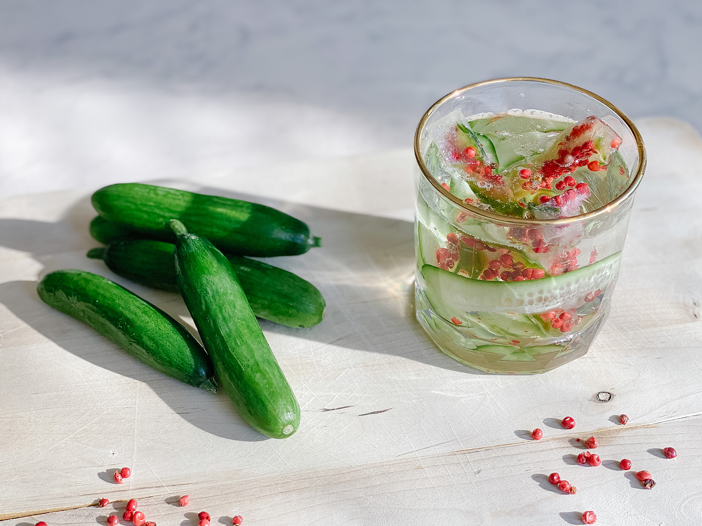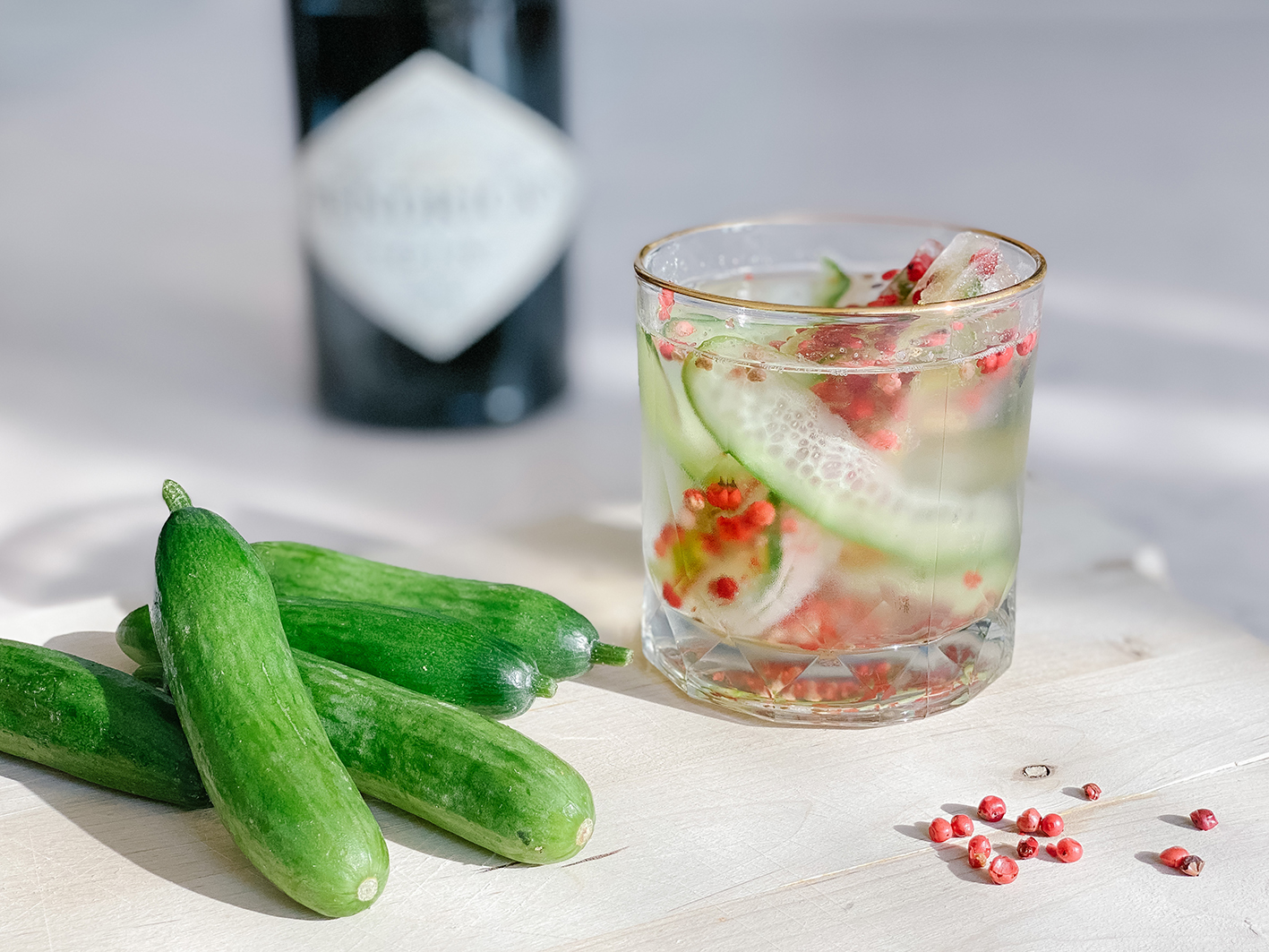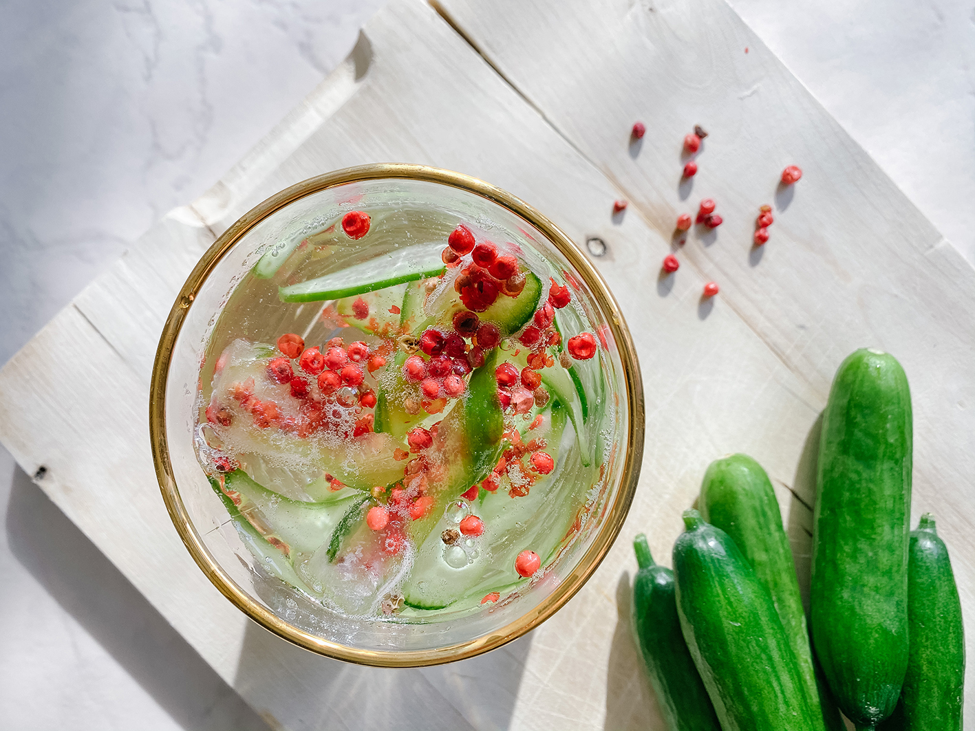 Die Menge an Gin müsst ihr je nach Größe des Glases und Geschmack natürlich etwas anpassen. Der eine mag es etwas stärker, der andere wiederum etwas schwächer. Damit euch der Drink länger kühl bleibt, könnt ihr das Glas etwa 20 Minuten vorher in den Kühlschrank stellen. Und wie vorhin erwähnt, habe ich noch einen kleinen, aber feinen Tipp für euch. Damit euch der Gin tonic nicht verwässert, habe ich folgendes gemacht: Ich habe Eiswürfelformen genommen und etwas Gurke, roten Pfeffer und Tonic Water darin gefüllt. Die Eiswürfelform darf dann, am besten über Nacht, in die Tiefkühltruhe. Die gebt ihr dann zum Gin Tonic dazu. Bester Trick um den Geschmack beizubehalten. Und wenn ihr noch auf der Suche nach tollen Gläsern für eure Drinks seid, dann kann ich euch den Onlineshop von Insa wärmstens empfehlen. Diese Gläser hier finde ich einfach perfekt für einen Drink.
