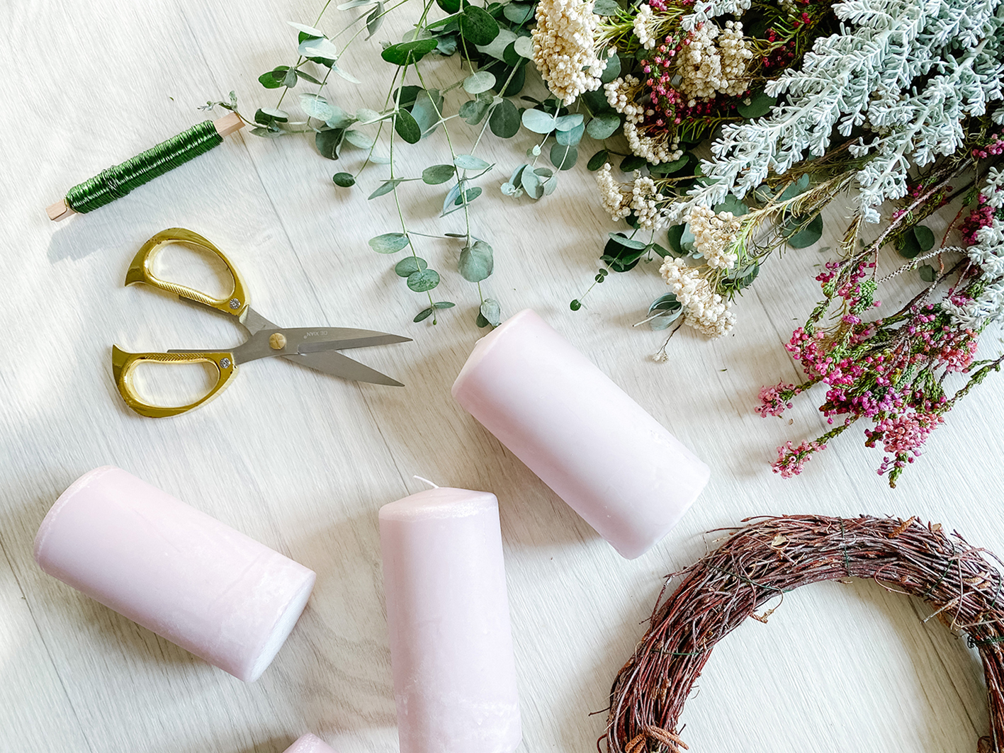 - eine Kranz Rohling (aus Stroh, Birkenzweigen, o.ä.)